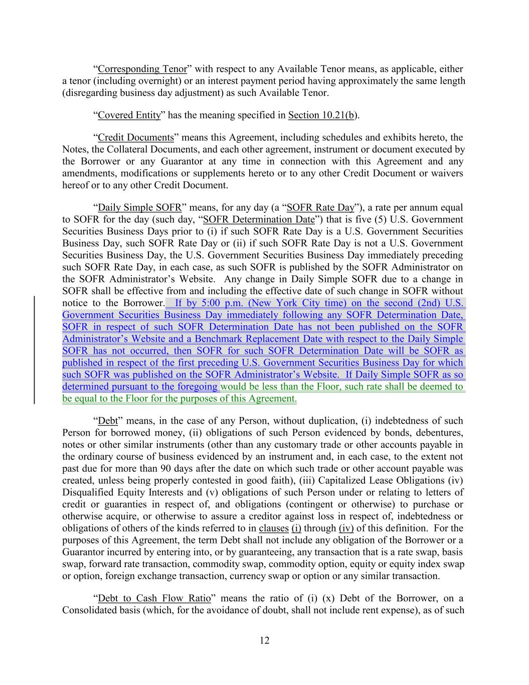 “Corresponding Tenor” with respect to any Available Tenor means, as applicable, either a tenor (including overnight) or an interest payment period having approximately the same length (disregarding business day adjustment) as such Available Tenor. “Covered Entity” has the meaning specified in Section 10.21(b). “Credit Documents” means this Agreement, including schedules and exhibits hereto, the Notes, the Collateral Documents, and each other agreement, instrument or document executed by the Borrower or any Guarantor at any time in connection with this Agreement and any amendments, modifications or supplements hereto or to any other Credit Document or waivers hereof or to any other Credit Document. “Daily Simple SOFR” means, for any day (a “SOFR Rate Day”), a rate per annum equal to SOFR for the day (such day, “SOFR Determination Date”) that is five (5) U.S. Government Securities Business Days prior to (i) if such SOFR Rate Day is a U.S. Government Securities Business Day, such SOFR Rate Day or (ii) if such SOFR Rate Day is not a U.S. Government Securities Business Day, the U.S. Government Securities Business Day immediately preceding such SOFR Rate Day, in each case, as such SOFR is published by the SOFR Administrator on the SOFR Administrator’s Website. Any change in Daily Simple SOFR due to a change in SOFR shall be effective from and including the effective date of such change in SOFR without notice to the Borrower. If by 5:00 p.m. (New York City time) on the second (2nd) U.S. Government Securities Business Day immediately following any SOFR Determination Date, SOFR in respect of such SOFR Determination Date has not been published on the SOFR Administrator’s Website and a Benchmark Replacement Date with respect to the Daily Simple SOFR has not occurred, then SOFR for such SOFR Determination Date will be SOFR as published in respect of the first preceding U.S. Government Securities Business Day for which such SOFR was published on the SOFR Administrator’s Website. If Daily Simple SOFR as so determined pursuant to the foregoing would be less than the Floor, such rate shall be deemed to be equal to the Floor for the purposes of this Agreement. “Debt” means, in the case of any Person, without duplication, (i) indebtedness of such Person for borrowed money, (ii) obligations of such Person evidenced by bonds, debentures, notes or other similar instruments (other than any customary trade or other accounts payable in the ordinary course of business evidenced by an instrument and, in each case, to the extent not past due for more than 90 days after the date on which such trade or other account payable was created, unless being properly contested in good faith), (iii) Capitalized Lease Obligations (iv) Disqualified Equity Interests and (v) obligations of such Person under or relating to letters of credit or guaranties in respect of, and obligations (contingent or otherwise) to purchase or otherwise acquire, or otherwise to assure a creditor against loss in respect of, indebtedness or obligations of others of the kinds referred to in clauses (i) through (iv) of this definition. For the purposes of this Agreement, the term Debt shall not include any obligation of the Borrower or a Guarantor incurred by entering into, or by guaranteeing, any transaction that is a rate swap, basis swap, forward rate transaction, commodity swap, commodity option, equity or equity index swap or option, foreign exchange transaction, currency swap or option or any similar transaction. “Debt to Cash Flow Ratio” means the ratio of (i) (x) Debt of the Borrower, on a Consolidated basis (which, for the avoidance of doubt, shall not include rent expense), as of such 12
