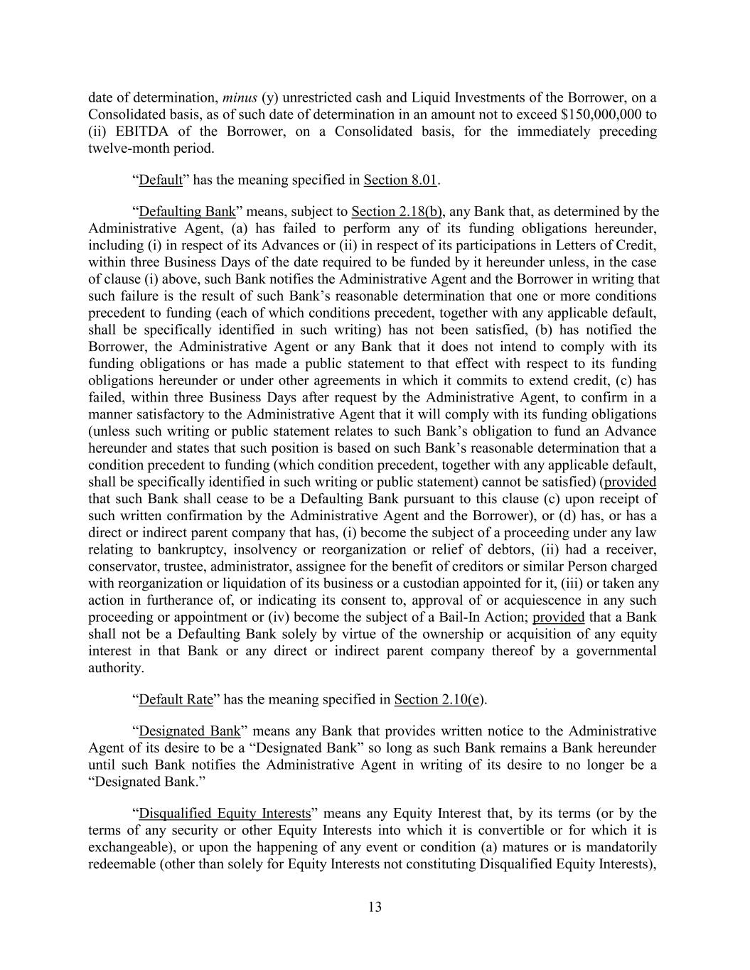 date of determination, minus (y) unrestricted cash and Liquid Investments of the Borrower, on a Consolidated basis, as of such date of determination in an amount not to exceed $150,000,000 to (ii) EBITDA of the Borrower, on a Consolidated basis, for the immediately preceding twelve-month period. “Default” has the meaning specified in Section 8.01. “Defaulting Bank” means, subject to Section 2.18(b), any Bank that, as determined by the Administrative Agent, (a) has failed to perform any of its funding obligations hereunder, including (i) in respect of its Advances or (ii) in respect of its participations in Letters of Credit, within three Business Days of the date required to be funded by it hereunder unless, in the case of clause (i) above, such Bank notifies the Administrative Agent and the Borrower in writing that such failure is the result of such Bank’s reasonable determination that one or more conditions precedent to funding (each of which conditions precedent, together with any applicable default, shall be specifically identified in such writing) has not been satisfied, (b) has notified the Borrower, the Administrative Agent or any Bank that it does not intend to comply with its funding obligations or has made a public statement to that effect with respect to its funding obligations hereunder or under other agreements in which it commits to extend credit, (c) has failed, within three Business Days after request by the Administrative Agent, to confirm in a manner satisfactory to the Administrative Agent that it will comply with its funding obligations (unless such writing or public statement relates to such Bank’s obligation to fund an Advance hereunder and states that such position is based on such Bank’s reasonable determination that a condition precedent to funding (which condition precedent, together with any applicable default, shall be specifically identified in such writing or public statement) cannot be satisfied) (provided that such Bank shall cease to be a Defaulting Bank pursuant to this clause (c) upon receipt of such written confirmation by the Administrative Agent and the Borrower), or (d) has, or has a direct or indirect parent company that has, (i) become the subject of a proceeding under any law relating to bankruptcy, insolvency or reorganization or relief of debtors, (ii) had a receiver, conservator, trustee, administrator, assignee for the benefit of creditors or similar Person charged with reorganization or liquidation of its business or a custodian appointed for it, (iii) or taken any action in furtherance of, or indicating its consent to, approval of or acquiescence in any such proceeding or appointment or (iv) become the subject of a Bail-In Action; provided that a Bank shall not be a Defaulting Bank solely by virtue of the ownership or acquisition of any equity interest in that Bank or any direct or indirect parent company thereof by a governmental authority. “Default Rate” has the meaning specified in Section 2.10(e). “Designated Bank” means any Bank that provides written notice to the Administrative Agent of its desire to be a “Designated Bank” so long as such Bank remains a Bank hereunder until such Bank notifies the Administrative Agent in writing of its desire to no longer be a “Designated Bank.” “Disqualified Equity Interests” means any Equity Interest that, by its terms (or by the terms of any security or other Equity Interests into which it is convertible or for which it is exchangeable), or upon the happening of any event or condition (a) matures or is mandatorily redeemable (other than solely for Equity Interests not constituting Disqualified Equity Interests), 13