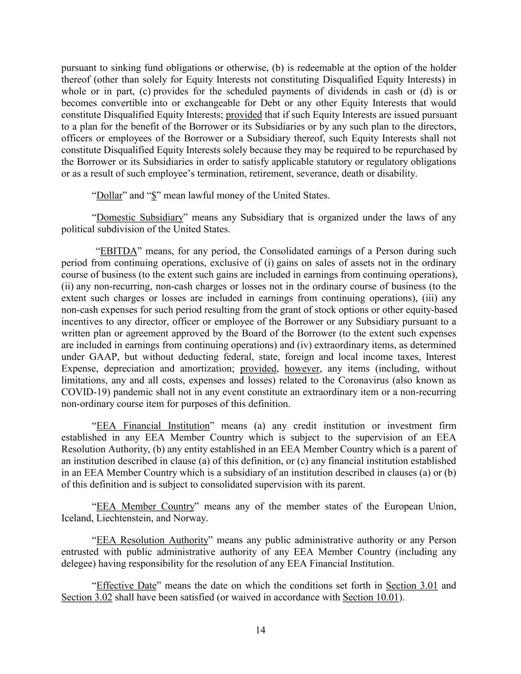 pursuant to sinking fund obligations or otherwise, (b) is redeemable at the option of the holder thereof (other than solely for Equity Interests not constituting Disqualified Equity Interests) in whole or in part, (c) provides for the scheduled payments of dividends in cash or (d) is or becomes convertible into or exchangeable for Debt or any other Equity Interests that would constitute Disqualified Equity Interests; provided that if such Equity Interests are issued pursuant to a plan for the benefit of the Borrower or its Subsidiaries or by any such plan to the directors, officers or employees of the Borrower or a Subsidiary thereof, such Equity Interests shall not constitute Disqualified Equity Interests solely because they may be required to be repurchased by the Borrower or its Subsidiaries in order to satisfy applicable statutory or regulatory obligations or as a result of such employee’s termination, retirement, severance, death or disability. “Dollar” and “$” mean lawful money of the United States. “Domestic Subsidiary” means any Subsidiary that is organized under the laws of any political subdivision of the United States. “EBITDA” means, for any period, the Consolidated earnings of a Person during such period from continuing operations, exclusive of (i) gains on sales of assets not in the ordinary course of business (to the extent such gains are included in earnings from continuing operations), (ii) any non-recurring, non-cash charges or losses not in the ordinary course of business (to the extent such charges or losses are included in earnings from continuing operations), (iii) any non-cash expenses for such period resulting from the grant of stock options or other equity-based incentives to any director, officer or employee of the Borrower or any Subsidiary pursuant to a written plan or agreement approved by the Board of the Borrower (to the extent such expenses are included in earnings from continuing operations) and (iv) extraordinary items, as determined under GAAP, but without deducting federal, state, foreign and local income taxes, Interest Expense, depreciation and amortization; provided, however, any items (including, without limitations, any and all costs, expenses and losses) related to the Coronavirus (also known as COVID-19) pandemic shall not in any event constitute an extraordinary item or a non-recurring non-ordinary course item for purposes of this definition. “EEA Financial Institution” means (a) any credit institution or investment firm established in any EEA Member Country which is subject to the supervision of an EEA Resolution Authority, (b) any entity established in an EEA Member Country which is a parent of an institution described in clause (a) of this definition, or (c) any financial institution established in an EEA Member Country which is a subsidiary of an institution described in clauses (a) or (b) of this definition and is subject to consolidated supervision with its parent. “EEA Member Country” means any of the member states of the European Union, Iceland, Liechtenstein, and Norway. “EEA Resolution Authority” means any public administrative authority or any Person entrusted with public administrative authority of any EEA Member Country (including any delegee) having responsibility for the resolution of any EEA Financial Institution. “Effective Date” means the date on which the conditions set forth in Section 3.01 and Section 3.02 shall have been satisfied (or waived in accordance with Section 10.01). 14