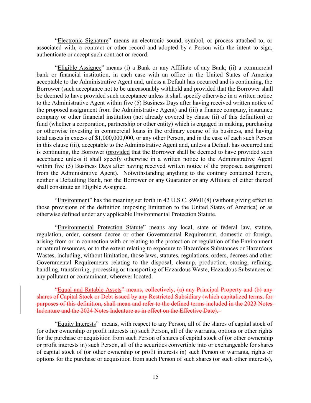 “Electronic Signature” means an electronic sound, symbol, or process attached to, or associated with, a contract or other record and adopted by a Person with the intent to sign, authenticate or accept such contract or record. “Eligible Assignee” means (i) a Bank or any Affiliate of any Bank; (ii) a commercial bank or financial institution, in each case with an office in the United States of America acceptable to the Administrative Agent and, unless a Default has occurred and is continuing, the Borrower (such acceptance not to be unreasonably withheld and provided that the Borrower shall be deemed to have provided such acceptance unless it shall specify otherwise in a written notice to the Administrative Agent within five (5) Business Days after having received written notice of the proposed assignment from the Administrative Agent) and (iii) a finance company, insurance company or other financial institution (not already covered by clause (ii) of this definition) or fund (whether a corporation, partnership or other entity) which is engaged in making, purchasing or otherwise investing in commercial loans in the ordinary course of its business, and having total assets in excess of $1,000,000,000, or any other Person, and in the case of each such Person in this clause (iii), acceptable to the Administrative Agent and, unless a Default has occurred and is continuing, the Borrower (provided that the Borrower shall be deemed to have provided such acceptance unless it shall specify otherwise in a written notice to the Administrative Agent within five (5) Business Days after having received written notice of the proposed assignment from the Administrative Agent). Notwithstanding anything to the contrary contained herein, neither a Defaulting Bank, nor the Borrower or any Guarantor or any Affiliate of either thereof shall constitute an Eligible Assignee. “Environment” has the meaning set forth in 42 U.S.C. §9601(8) (without giving effect to those provisions of the definition imposing limitation to the United States of America) or as otherwise defined under any applicable Environmental Protection Statute. “Environmental Protection Statute” means any local, state or federal law, statute, regulation, order, consent decree or other Governmental Requirement, domestic or foreign, arising from or in connection with or relating to the protection or regulation of the Environment or natural resources, or to the extent relating to exposure to Hazardous Substances or Hazardous Wastes, including, without limitation, those laws, statutes, regulations, orders, decrees and other Governmental Requirements relating to the disposal, cleanup, production, storing, refining, handling, transferring, processing or transporting of Hazardous Waste, Hazardous Substances or any pollutant or contaminant, wherever located. “Equal and Ratable Assets” means, collectively, (a) any Principal Property and (b) any shares of Capital Stock or Debt issued by any Restricted Subsidiary (which capitalized terms, for purposes of this definition, shall mean and refer to the defined terms included in the 2023 Notes Indenture and the 2024 Notes Indenture as in effect on the Effective Date). “Equity Interests” means, with respect to any Person, all of the shares of capital stock of (or other ownership or profit interests in) such Person, all of the warrants, options or other rights for the purchase or acquisition from such Person of shares of capital stock of (or other ownership or profit interests in) such Person, all of the securities convertible into or exchangeable for shares of capital stock of (or other ownership or profit interests in) such Person or warrants, rights or options for the purchase or acquisition from such Person of such shares (or such other interests), 15