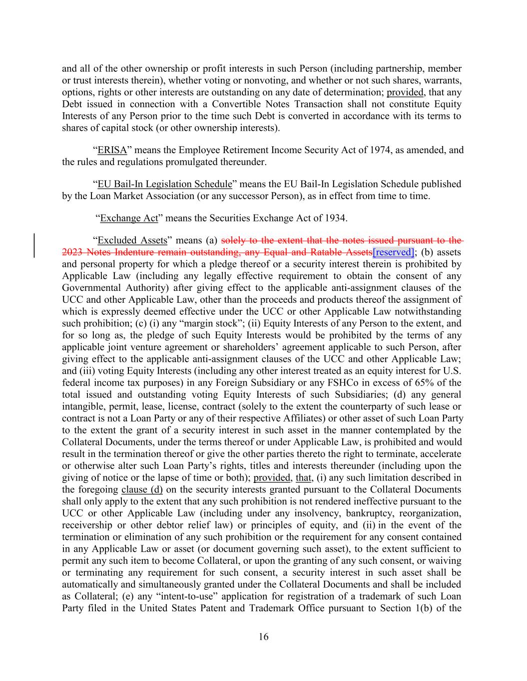 and all of the other ownership or profit interests in such Person (including partnership, member or trust interests therein), whether voting or nonvoting, and whether or not such shares, warrants, options, rights or other interests are outstanding on any date of determination; provided, that any Debt issued in connection with a Convertible Notes Transaction shall not constitute Equity Interests of any Person prior to the time such Debt is converted in accordance with its terms to shares of capital stock (or other ownership interests). “ERISA” means the Employee Retirement Income Security Act of 1974, as amended, and the rules and regulations promulgated thereunder. “EU Bail-In Legislation Schedule” means the EU Bail-In Legislation Schedule published by the Loan Market Association (or any successor Person), as in effect from time to time. “Exchange Act” means the Securities Exchange Act of 1934. “Excluded Assets” means (a) solely to the extent that the notes issued pursuant to the 2023 Notes Indenture remain outstanding, any Equal and Ratable Assets[reserved]; (b) assets and personal property for which a pledge thereof or a security interest therein is prohibited by Applicable Law (including any legally effective requirement to obtain the consent of any Governmental Authority) after giving effect to the applicable anti-assignment clauses of the UCC and other Applicable Law, other than the proceeds and products thereof the assignment of which is expressly deemed effective under the UCC or other Applicable Law notwithstanding such prohibition; (c) (i) any “margin stock”; (ii) Equity Interests of any Person to the extent, and for so long as, the pledge of such Equity Interests would be prohibited by the terms of any applicable joint venture agreement or shareholders’ agreement applicable to such Person, after giving effect to the applicable anti-assignment clauses of the UCC and other Applicable Law; and (iii) voting Equity Interests (including any other interest treated as an equity interest for U.S. federal income tax purposes) in any Foreign Subsidiary or any FSHCo in excess of 65% of the total issued and outstanding voting Equity Interests of such Subsidiaries; (d) any general intangible, permit, lease, license, contract (solely to the extent the counterparty of such lease or contract is not a Loan Party or any of their respective Affiliates) or other asset of such Loan Party to the extent the grant of a security interest in such asset in the manner contemplated by the Collateral Documents, under the terms thereof or under Applicable Law, is prohibited and would result in the termination thereof or give the other parties thereto the right to terminate, accelerate or otherwise alter such Loan Party’s rights, titles and interests thereunder (including upon the giving of notice or the lapse of time or both); provided, that, (i) any such limitation described in the foregoing clause (d) on the security interests granted pursuant to the Collateral Documents shall only apply to the extent that any such prohibition is not rendered ineffective pursuant to the UCC or other Applicable Law (including under any insolvency, bankruptcy, reorganization, receivership or other debtor relief law) or principles of equity, and (ii) in the event of the termination or elimination of any such prohibition or the requirement for any consent contained in any Applicable Law or asset (or document governing such asset), to the extent sufficient to permit any such item to become Collateral, or upon the granting of any such consent, or waiving or terminating any requirement for such consent, a security interest in such asset shall be automatically and simultaneously granted under the Collateral Documents and shall be included as Collateral; (e) any “intent-to-use” application for registration of a trademark of such Loan Party filed in the United States Patent and Trademark Office pursuant to Section 1(b) of the 16