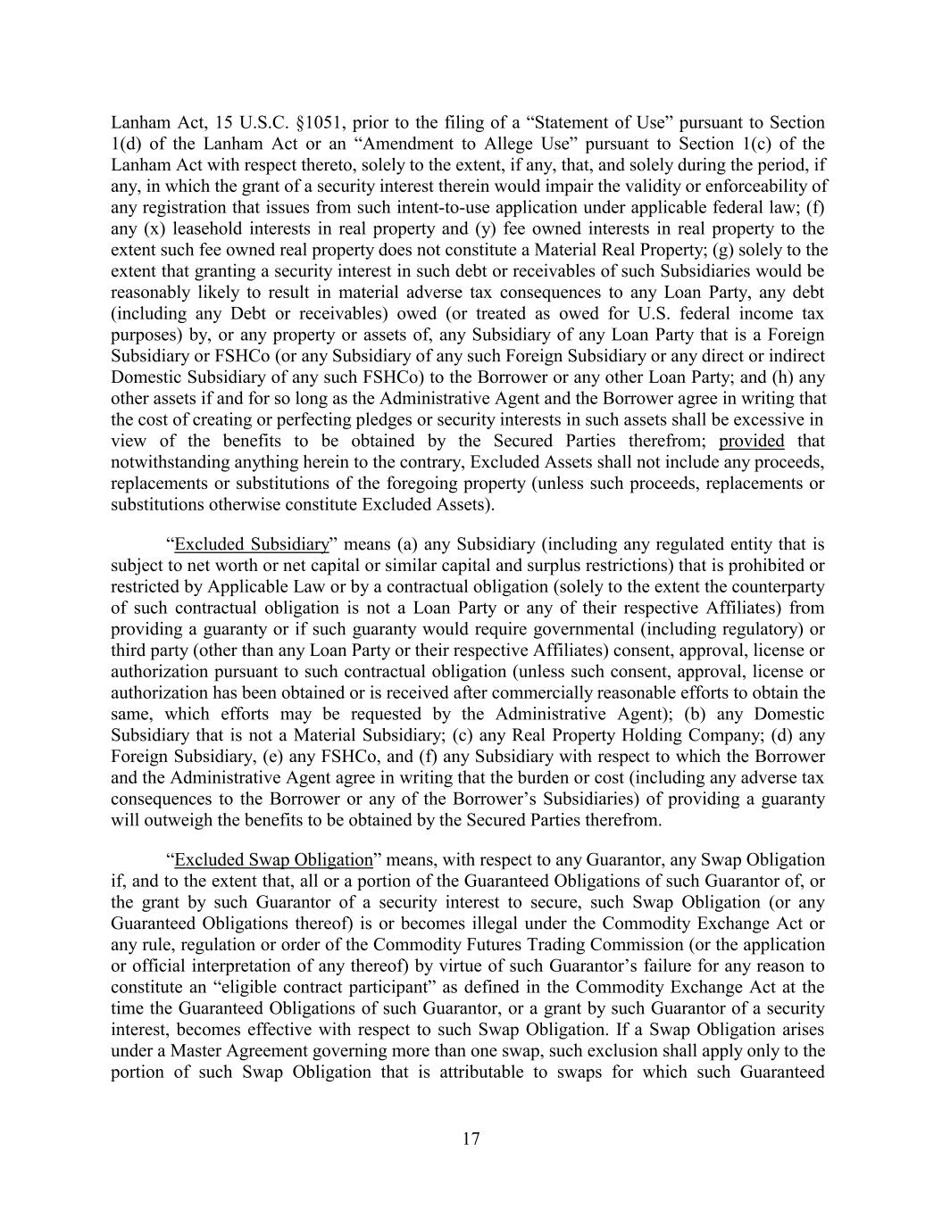 Lanham Act, 15 U.S.C. §1051, prior to the filing of a “Statement of Use” pursuant to Section 1(d) of the Lanham Act or an “Amendment to Allege Use” pursuant to Section 1(c) of the Lanham Act with respect thereto, solely to the extent, if any, that, and solely during the period, if any, in which the grant of a security interest therein would impair the validity or enforceability of any registration that issues from such intent-to-use application under applicable federal law; (f) any (x) leasehold interests in real property and (y) fee owned interests in real property to the extent such fee owned real property does not constitute a Material Real Property; (g) solely to the extent that granting a security interest in such debt or receivables of such Subsidiaries would be reasonably likely to result in material adverse tax consequences to any Loan Party, any debt (including any Debt or receivables) owed (or treated as owed for U.S. federal income tax purposes) by, or any property or assets of, any Subsidiary of any Loan Party that is a Foreign Subsidiary or FSHCo (or any Subsidiary of any such Foreign Subsidiary or any direct or indirect Domestic Subsidiary of any such FSHCo) to the Borrower or any other Loan Party; and (h) any other assets if and for so long as the Administrative Agent and the Borrower agree in writing that the cost of creating or perfecting pledges or security interests in such assets shall be excessive in view of the benefits to be obtained by the Secured Parties therefrom; provided that notwithstanding anything herein to the contrary, Excluded Assets shall not include any proceeds, replacements or substitutions of the foregoing property (unless such proceeds, replacements or substitutions otherwise constitute Excluded Assets). “Excluded Subsidiary” means (a) any Subsidiary (including any regulated entity that is subject to net worth or net capital or similar capital and surplus restrictions) that is prohibited or restricted by Applicable Law or by a contractual obligation (solely to the extent the counterparty of such contractual obligation is not a Loan Party or any of their respective Affiliates) from providing a guaranty or if such guaranty would require governmental (including regulatory) or third party (other than any Loan Party or their respective Affiliates) consent, approval, license or authorization pursuant to such contractual obligation (unless such consent, approval, license or authorization has been obtained or is received after commercially reasonable efforts to obtain the same, which efforts may be requested by the Administrative Agent); (b) any Domestic Subsidiary that is not a Material Subsidiary; (c) any Real Property Holding Company; (d) any Foreign Subsidiary, (e) any FSHCo, and (f) any Subsidiary with respect to which the Borrower and the Administrative Agent agree in writing that the burden or cost (including any adverse tax consequences to the Borrower or any of the Borrower’s Subsidiaries) of providing a guaranty will outweigh the benefits to be obtained by the Secured Parties therefrom. “Excluded Swap Obligation” means, with respect to any Guarantor, any Swap Obligation if, and to the extent that, all or a portion of the Guaranteed Obligations of such Guarantor of, or the grant by such Guarantor of a security interest to secure, such Swap Obligation (or any Guaranteed Obligations thereof) is or becomes illegal under the Commodity Exchange Act or any rule, regulation or order of the Commodity Futures Trading Commission (or the application or official interpretation of any thereof) by virtue of such Guarantor’s failure for any reason to constitute an “eligible contract participant” as defined in the Commodity Exchange Act at the time the Guaranteed Obligations of such Guarantor, or a grant by such Guarantor of a security interest, becomes effective with respect to such Swap Obligation. If a Swap Obligation arises under a Master Agreement governing more than one swap, such exclusion shall apply only to the portion of such Swap Obligation that is attributable to swaps for which such Guaranteed 17