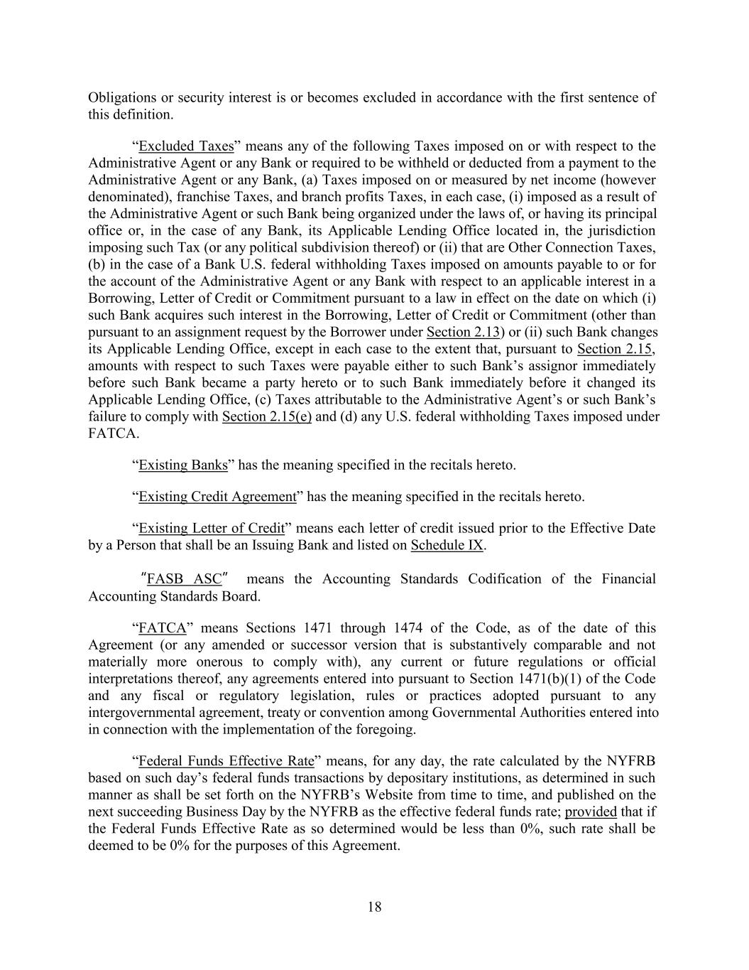 Obligations or security interest is or becomes excluded in accordance with the first sentence of this definition. “Excluded Taxes” means any of the following Taxes imposed on or with respect to the Administrative Agent or any Bank or required to be withheld or deducted from a payment to the Administrative Agent or any Bank, (a) Taxes imposed on or measured by net income (however denominated), franchise Taxes, and branch profits Taxes, in each case, (i) imposed as a result of the Administrative Agent or such Bank being organized under the laws of, or having its principal office or, in the case of any Bank, its Applicable Lending Office located in, the jurisdiction imposing such Tax (or any political subdivision thereof) or (ii) that are Other Connection Taxes, (b) in the case of a Bank U.S. federal withholding Taxes imposed on amounts payable to or for the account of the Administrative Agent or any Bank with respect to an applicable interest in a Borrowing, Letter of Credit or Commitment pursuant to a law in effect on the date on which (i) such Bank acquires such interest in the Borrowing, Letter of Credit or Commitment (other than pursuant to an assignment request by the Borrower under Section 2.13) or (ii) such Bank changes its Applicable Lending Office, except in each case to the extent that, pursuant to Section 2.15, amounts with respect to such Taxes were payable either to such Bank’s assignor immediately before such Bank became a party hereto or to such Bank immediately before it changed its Applicable Lending Office, (c) Taxes attributable to the Administrative Agent’s or such Bank’s failure to comply with Section 2.15(e) and (d) any U.S. federal withholding Taxes imposed under FATCA. “Existing Banks” has the meaning specified in the recitals hereto. “Existing Credit Agreement” has the meaning specified in the recitals hereto. “Existing Letter of Credit” means each letter of credit issued prior to the Effective Date by a Person that shall be an Issuing Bank and listed on Schedule IX. “FASB ASC” means the Accounting Standards Codification of the Financial Accounting Standards Board. “FATCA” means Sections 1471 through 1474 of the Code, as of the date of this Agreement (or any amended or successor version that is substantively comparable and not materially more onerous to comply with), any current or future regulations or official interpretations thereof, any agreements entered into pursuant to Section 1471(b)(1) of the Code and any fiscal or regulatory legislation, rules or practices adopted pursuant to any intergovernmental agreement, treaty or convention among Governmental Authorities entered into in connection with the implementation of the foregoing. “Federal Funds Effective Rate” means, for any day, the rate calculated by the NYFRB based on such day’s federal funds transactions by depositary institutions, as determined in such manner as shall be set forth on the NYFRB’s Website from time to time, and published on the next succeeding Business Day by the NYFRB as the effective federal funds rate; provided that if the Federal Funds Effective Rate as so determined would be less than 0%, such rate shall be deemed to be 0% for the purposes of this Agreement. 18