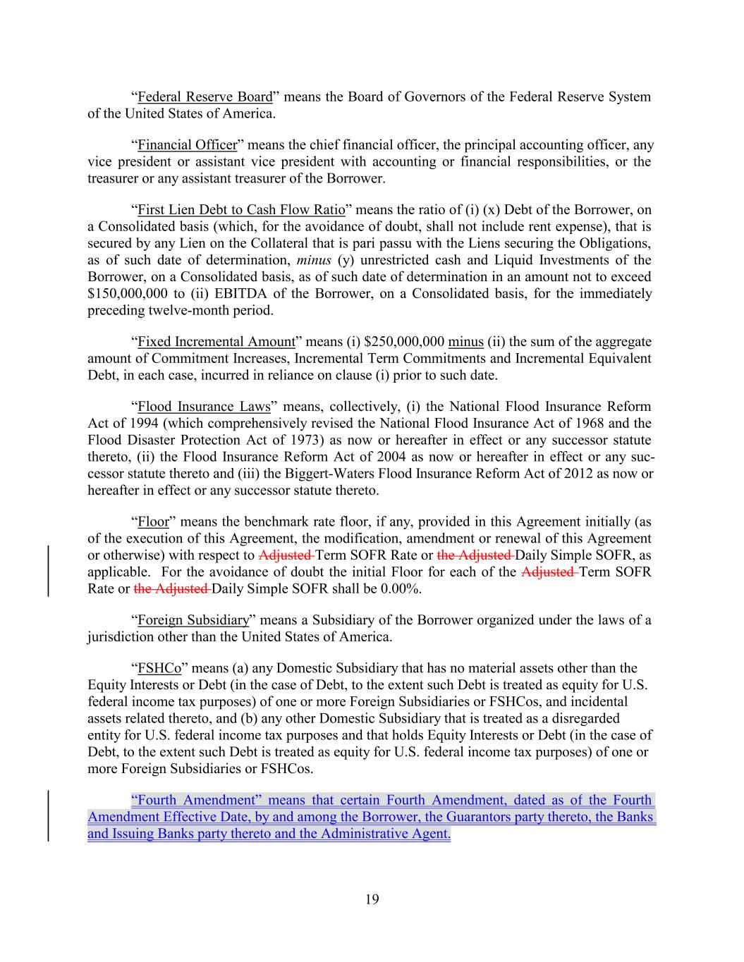 “Federal Reserve Board” means the Board of Governors of the Federal Reserve System of the United States of America. “Financial Officer” means the chief financial officer, the principal accounting officer, any vice president or assistant vice president with accounting or financial responsibilities, or the treasurer or any assistant treasurer of the Borrower. “First Lien Debt to Cash Flow Ratio” means the ratio of (i) (x) Debt of the Borrower, on a Consolidated basis (which, for the avoidance of doubt, shall not include rent expense), that is secured by any Lien on the Collateral that is pari passu with the Liens securing the Obligations, as of such date of determination, minus (y) unrestricted cash and Liquid Investments of the Borrower, on a Consolidated basis, as of such date of determination in an amount not to exceed $150,000,000 to (ii) EBITDA of the Borrower, on a Consolidated basis, for the immediately preceding twelve-month period. “Fixed Incremental Amount” means (i) $250,000,000 minus (ii) the sum of the aggregate amount of Commitment Increases, Incremental Term Commitments and Incremental Equivalent Debt, in each case, incurred in reliance on clause (i) prior to such date. “Flood Insurance Laws” means, collectively, (i) the National Flood Insurance Reform Act of 1994 (which comprehensively revised the National Flood Insurance Act of 1968 and the Flood Disaster Protection Act of 1973) as now or hereafter in effect or any successor statute thereto, (ii) the Flood Insurance Reform Act of 2004 as now or hereafter in effect or any suc- cessor statute thereto and (iii) the Biggert-Waters Flood Insurance Reform Act of 2012 as now or hereafter in effect or any successor statute thereto. “Floor” means the benchmark rate floor, if any, provided in this Agreement initially (as of the execution of this Agreement, the modification, amendment or renewal of this Agreement or otherwise) with respect to Adjusted Term SOFR Rate or the Adjusted Daily Simple SOFR, as applicable. For the avoidance of doubt the initial Floor for each of the Adjusted Term SOFR Rate or the Adjusted Daily Simple SOFR shall be 0.00%. “Foreign Subsidiary” means a Subsidiary of the Borrower organized under the laws of a jurisdiction other than the United States of America. “FSHCo” means (a) any Domestic Subsidiary that has no material assets other than the Equity Interests or Debt (in the case of Debt, to the extent such Debt is treated as equity for U.S. federal income tax purposes) of one or more Foreign Subsidiaries or FSHCos, and incidental assets related thereto, and (b) any other Domestic Subsidiary that is treated as a disregarded entity for U.S. federal income tax purposes and that holds Equity Interests or Debt (in the case of Debt, to the extent such Debt is treated as equity for U.S. federal income tax purposes) of one or more Foreign Subsidiaries or FSHCos. “Fourth Amendment” means that certain Fourth Amendment, dated as of the Fourth Amendment Effective Date, by and among the Borrower, the Guarantors party thereto, the Banks and Issuing Banks party thereto and the Administrative Agent. 19
