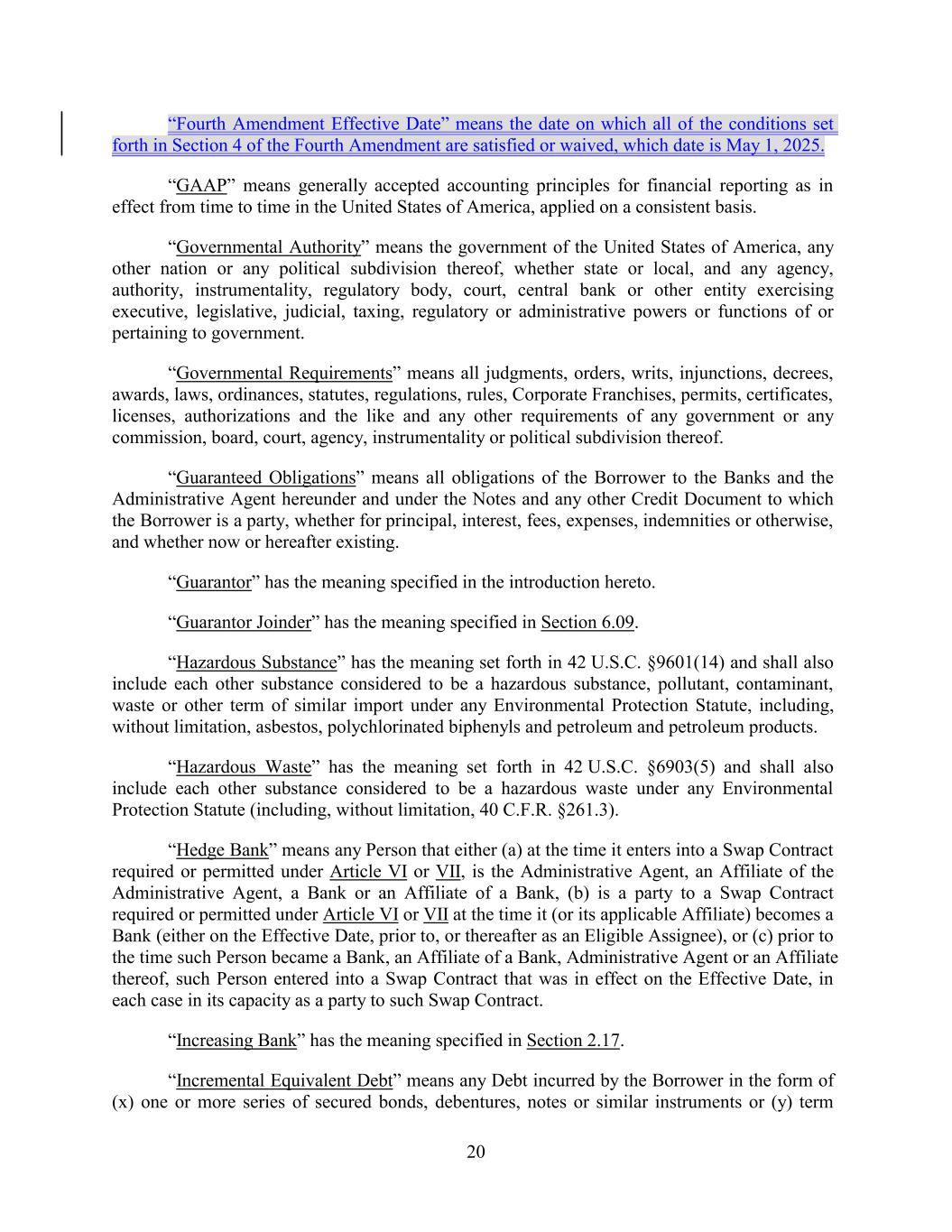 “Fourth Amendment Effective Date” means the date on which all of the conditions set forth in Section 4 of the Fourth Amendment are satisfied or waived, which date is May 1, 2025. “GAAP” means generally accepted accounting principles for financial reporting as in effect from time to time in the United States of America, applied on a consistent basis. “Governmental Authority” means the government of the United States of America, any other nation or any political subdivision thereof, whether state or local, and any agency, authority, instrumentality, regulatory body, court, central bank or other entity exercising executive, legislative, judicial, taxing, regulatory or administrative powers or functions of or pertaining to government. “Governmental Requirements” means all judgments, orders, writs, injunctions, decrees, awards, laws, ordinances, statutes, regulations, rules, Corporate Franchises, permits, certificates, licenses, authorizations and the like and any other requirements of any government or any commission, board, court, agency, instrumentality or political subdivision thereof. “Guaranteed Obligations” means all obligations of the Borrower to the Banks and the Administrative Agent hereunder and under the Notes and any other Credit Document to which the Borrower is a party, whether for principal, interest, fees, expenses, indemnities or otherwise, and whether now or hereafter existing. “Guarantor” has the meaning specified in the introduction hereto. “Guarantor Joinder” has the meaning specified in Section 6.09. “Hazardous Substance” has the meaning set forth in 42 U.S.C. §9601(14) and shall also include each other substance considered to be a hazardous substance, pollutant, contaminant, waste or other term of similar import under any Environmental Protection Statute, including, without limitation, asbestos, polychlorinated biphenyls and petroleum and petroleum products. “Hazardous Waste” has the meaning set forth in 42 U.S.C. §6903(5) and shall also include each other substance considered to be a hazardous waste under any Environmental Protection Statute (including, without limitation, 40 C.F.R. §261.3). “Hedge Bank” means any Person that either (a) at the time it enters into a Swap Contract required or permitted under Article VI or VII, is the Administrative Agent, an Affiliate of the Administrative Agent, a Bank or an Affiliate of a Bank, (b) is a party to a Swap Contract required or permitted under Article VI or VII at the time it (or its applicable Affiliate) becomes a Bank (either on the Effective Date, prior to, or thereafter as an Eligible Assignee), or (c) prior to the time such Person became a Bank, an Affiliate of a Bank, Administrative Agent or an Affiliate thereof, such Person entered into a Swap Contract that was in effect on the Effective Date, in each case in its capacity as a party to such Swap Contract. “Increasing Bank” has the meaning specified in Section 2.17. “Incremental Equivalent Debt” means any Debt incurred by the Borrower in the form of (x) one or more series of secured bonds, debentures, notes or similar instruments or (y) term 20