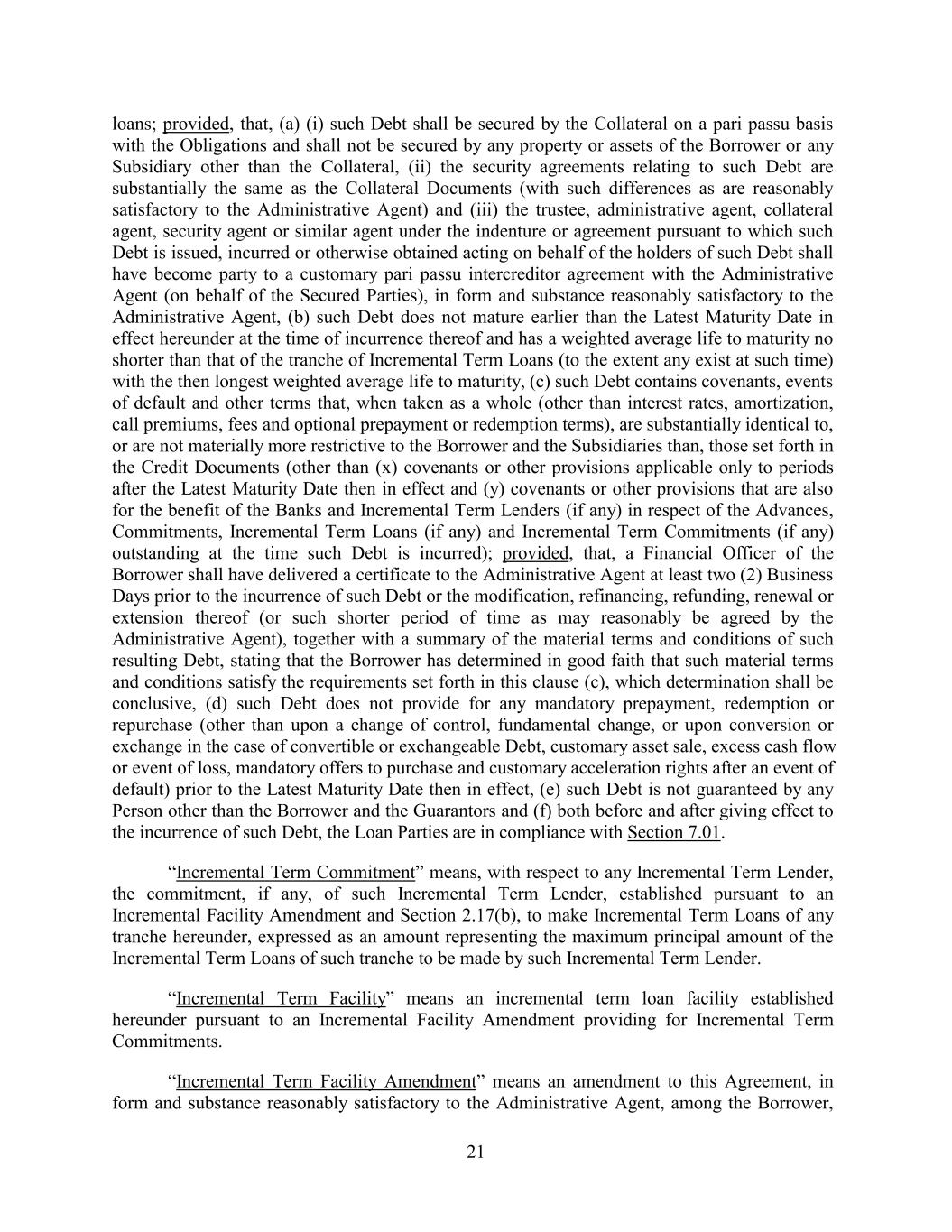 loans; provided, that, (a) (i) such Debt shall be secured by the Collateral on a pari passu basis with the Obligations and shall not be secured by any property or assets of the Borrower or any Subsidiary other than the Collateral, (ii) the security agreements relating to such Debt are substantially the same as the Collateral Documents (with such differences as are reasonably satisfactory to the Administrative Agent) and (iii) the trustee, administrative agent, collateral agent, security agent or similar agent under the indenture or agreement pursuant to which such Debt is issued, incurred or otherwise obtained acting on behalf of the holders of such Debt shall have become party to a customary pari passu intercreditor agreement with the Administrative Agent (on behalf of the Secured Parties), in form and substance reasonably satisfactory to the Administrative Agent, (b) such Debt does not mature earlier than the Latest Maturity Date in effect hereunder at the time of incurrence thereof and has a weighted average life to maturity no shorter than that of the tranche of Incremental Term Loans (to the extent any exist at such time) with the then longest weighted average life to maturity, (c) such Debt contains covenants, events of default and other terms that, when taken as a whole (other than interest rates, amortization, call premiums, fees and optional prepayment or redemption terms), are substantially identical to, or are not materially more restrictive to the Borrower and the Subsidiaries than, those set forth in the Credit Documents (other than (x) covenants or other provisions applicable only to periods after the Latest Maturity Date then in effect and (y) covenants or other provisions that are also for the benefit of the Banks and Incremental Term Lenders (if any) in respect of the Advances, Commitments, Incremental Term Loans (if any) and Incremental Term Commitments (if any) outstanding at the time such Debt is incurred); provided, that, a Financial Officer of the Borrower shall have delivered a certificate to the Administrative Agent at least two (2) Business Days prior to the incurrence of such Debt or the modification, refinancing, refunding, renewal or extension thereof (or such shorter period of time as may reasonably be agreed by the Administrative Agent), together with a summary of the material terms and conditions of such resulting Debt, stating that the Borrower has determined in good faith that such material terms and conditions satisfy the requirements set forth in this clause (c), which determination shall be conclusive, (d) such Debt does not provide for any mandatory prepayment, redemption or repurchase (other than upon a change of control, fundamental change, or upon conversion or exchange in the case of convertible or exchangeable Debt, customary asset sale, excess cash flow or event of loss, mandatory offers to purchase and customary acceleration rights after an event of default) prior to the Latest Maturity Date then in effect, (e) such Debt is not guaranteed by any Person other than the Borrower and the Guarantors and (f) both before and after giving effect to the incurrence of such Debt, the Loan Parties are in compliance with Section 7.01. “Incremental Term Commitment” means, with respect to any Incremental Term Lender, the commitment, if any, of such Incremental Term Lender, established pursuant to an Incremental Facility Amendment and Section 2.17(b), to make Incremental Term Loans of any tranche hereunder, expressed as an amount representing the maximum principal amount of the Incremental Term Loans of such tranche to be made by such Incremental Term Lender. “Incremental Term Facility” means an incremental term loan facility established hereunder pursuant to an Incremental Facility Amendment providing for Incremental Term Commitments. “Incremental Term Facility Amendment” means an amendment to this Agreement, in form and substance reasonably satisfactory to the Administrative Agent, among the Borrower, 21
