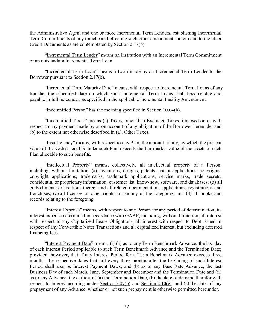 the Administrative Agent and one or more Incremental Term Lenders, establishing Incremental Term Commitments of any tranche and effecting such other amendments hereto and to the other Credit Documents as are contemplated by Section 2.17(b). “Incremental Term Lender” means an institution with an Incremental Term Commitment or an outstanding Incremental Term Loan. “Incremental Term Loan” means a Loan made by an Incremental Term Lender to the Borrower pursuant to Section 2.17(b). “Incremental Term Maturity Date” means, with respect to Incremental Term Loans of any tranche, the scheduled date on which such Incremental Term Loans shall become due and payable in full hereunder, as specified in the applicable Incremental Facility Amendment. “Indemnified Person” has the meaning specified in Section 10.04(b). “Indemnified Taxes” means (a) Taxes, other than Excluded Taxes, imposed on or with respect to any payment made by or on account of any obligation of the Borrower hereunder and (b) to the extent not otherwise described in (a), Other Taxes. “Insufficiency” means, with respect to any Plan, the amount, if any, by which the present value of the vested benefits under such Plan exceeds the fair market value of the assets of such Plan allocable to such benefits. “Intellectual Property” means, collectively, all intellectual property of a Person, including, without limitation, (a) inventions, designs, patents, patent applications, copyrights, copyright applications, trademarks, trademark applications, service marks, trade secrets, confidential or proprietary information, customer list, know-how, software, and databases; (b) all embodiments or fixations thereof and all related documentation, applications, registrations and franchises; (c) all licenses or other rights to use any of the foregoing; and (d) all books and records relating to the foregoing. “Interest Expense” means, with respect to any Person for any period of determination, its interest expense determined in accordance with GAAP, including, without limitation, all interest with respect to any Capitalized Lease Obligations, all interest with respect to Debt issued in respect of any Convertible Notes Transactions and all capitalized interest, but excluding deferred financing fees. “Interest Payment Date” means, (i) (a) as to any Term Benchmark Advance, the last day of each Interest Period applicable to such Term Benchmark Advance and the Termination Date; provided, however, that if any Interest Period for a Term Benchmark Advance exceeds three months, the respective dates that fall every three months after the beginning of such Interest Period shall also be Interest Payment Dates; and (b) as to any Base Rate Advance, the last Business Day of each March, June, September and December and the Termination Date and (ii) as to any Advance, the earliest of (a) the Termination Date, (b) the date of demand therefor with respect to interest accruing under Section 2.07(b) and Section 2.10(e), and (c) the date of any prepayment of any Advance, whether or not such prepayment is otherwise permitted hereunder. 22