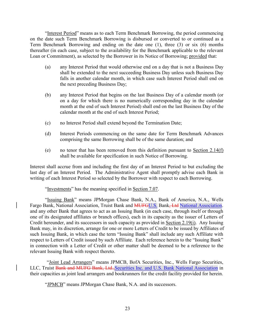 “Interest Period” means as to each Term Benchmark Borrowing, the period commencing on the date such Term Benchmark Borrowing is disbursed or converted to or continued as a Term Benchmark Borrowing and ending on the date one (1), three (3) or six (6) months thereafter (in each case, subject to the availability for the Benchmark applicable to the relevant Loan or Commitment), as selected by the Borrower in its Notice of Borrowing; provided that: (a) any Interest Period that would otherwise end on a day that is not a Business Day shall be extended to the next succeeding Business Day unless such Business Day falls in another calendar month, in which case such Interest Period shall end on the next preceding Business Day; (b) any Interest Period that begins on the last Business Day of a calendar month (or on a day for which there is no numerically corresponding day in the calendar month at the end of such Interest Period) shall end on the last Business Day of the calendar month at the end of such Interest Period; (c) no Interest Period shall extend beyond the Termination Date; (d) Interest Periods commencing on the same date for Term Benchmark Advances comprising the same Borrowing shall be of the same duration; and (e) no tenor that has been removed from this definition pursuant to Section 2.14(f) shall be available for specification in such Notice of Borrowing. Interest shall accrue from and including the first day of an Interest Period to but excluding the last day of an Interest Period. The Administrative Agent shall promptly advise each Bank in writing of each Interest Period so selected by the Borrower with respect to each Borrowing. “Investments” has the meaning specified in Section 7.07. “Issuing Bank” means JPMorgan Chase Bank, N.A., Bank of America, N.A., Wells Fargo Bank, National Association, Truist Bank and MUFGU.S. Bank, Ltd National Association. and any other Bank that agrees to act as an Issuing Bank (in each case, through itself or through one of its designated affiliates or branch offices), each in its capacity as the issuer of Letters of Credit hereunder, and its successors in such capacity as provided in Section 2.19(i). Any Issuing Bank may, in its discretion, arrange for one or more Letters of Credit to be issued by Affiliates of such Issuing Bank, in which case the term “Issuing Bank” shall include any such Affiliate with respect to Letters of Credit issued by such Affiliate. Each reference herein to the “Issuing Bank” in connection with a Letter of Credit or other matter shall be deemed to be a reference to the relevant Issuing Bank with respect thereto. “Joint Lead Arrangers” means JPMCB, BofA Securities, Inc., Wells Fargo Securities, LLC, Truist Bank and MUFG Bank, Ltd.,Securities Inc. and U.S. Bank National Association in their capacities as joint lead arrangers and bookrunners for the credit facility provided for herein. “JPMCB” means JPMorgan Chase Bank, N.A. and its successors. 23
