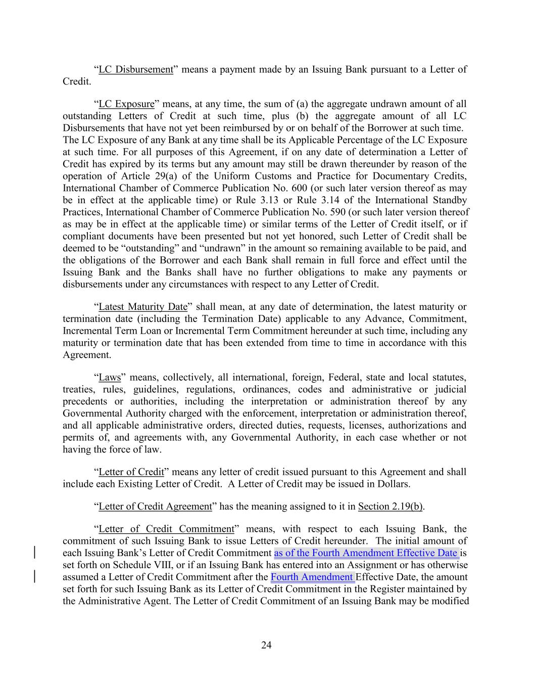 “LC Disbursement” means a payment made by an Issuing Bank pursuant to a Letter of Credit. “LC Exposure” means, at any time, the sum of (a) the aggregate undrawn amount of all outstanding Letters of Credit at such time, plus (b) the aggregate amount of all LC Disbursements that have not yet been reimbursed by or on behalf of the Borrower at such time. The LC Exposure of any Bank at any time shall be its Applicable Percentage of the LC Exposure at such time. For all purposes of this Agreement, if on any date of determination a Letter of Credit has expired by its terms but any amount may still be drawn thereunder by reason of the operation of Article 29(a) of the Uniform Customs and Practice for Documentary Credits, International Chamber of Commerce Publication No. 600 (or such later version thereof as may be in effect at the applicable time) or Rule 3.13 or Rule 3.14 of the International Standby Practices, International Chamber of Commerce Publication No. 590 (or such later version thereof as may be in effect at the applicable time) or similar terms of the Letter of Credit itself, or if compliant documents have been presented but not yet honored, such Letter of Credit shall be deemed to be “outstanding” and “undrawn” in the amount so remaining available to be paid, and the obligations of the Borrower and each Bank shall remain in full force and effect until the Issuing Bank and the Banks shall have no further obligations to make any payments or disbursements under any circumstances with respect to any Letter of Credit. “Latest Maturity Date” shall mean, at any date of determination, the latest maturity or termination date (including the Termination Date) applicable to any Advance, Commitment, Incremental Term Loan or Incremental Term Commitment hereunder at such time, including any maturity or termination date that has been extended from time to time in accordance with this Agreement. “Laws” means, collectively, all international, foreign, Federal, state and local statutes, treaties, rules, guidelines, regulations, ordinances, codes and administrative or judicial precedents or authorities, including the interpretation or administration thereof by any Governmental Authority charged with the enforcement, interpretation or administration thereof, and all applicable administrative orders, directed duties, requests, licenses, authorizations and permits of, and agreements with, any Governmental Authority, in each case whether or not having the force of law. “Letter of Credit” means any letter of credit issued pursuant to this Agreement and shall include each Existing Letter of Credit. A Letter of Credit may be issued in Dollars. “Letter of Credit Agreement” has the meaning assigned to it in Section 2.19(b). “Letter of Credit Commitment” means, with respect to each Issuing Bank, the commitment of such Issuing Bank to issue Letters of Credit hereunder. The initial amount of each Issuing Bank’s Letter of Credit Commitment as of the Fourth Amendment Effective Date is set forth on Schedule VIII, or if an Issuing Bank has entered into an Assignment or has otherwise assumed a Letter of Credit Commitment after the Fourth Amendment Effective Date, the amount set forth for such Issuing Bank as its Letter of Credit Commitment in the Register maintained by the Administrative Agent. The Letter of Credit Commitment of an Issuing Bank may be modified 24