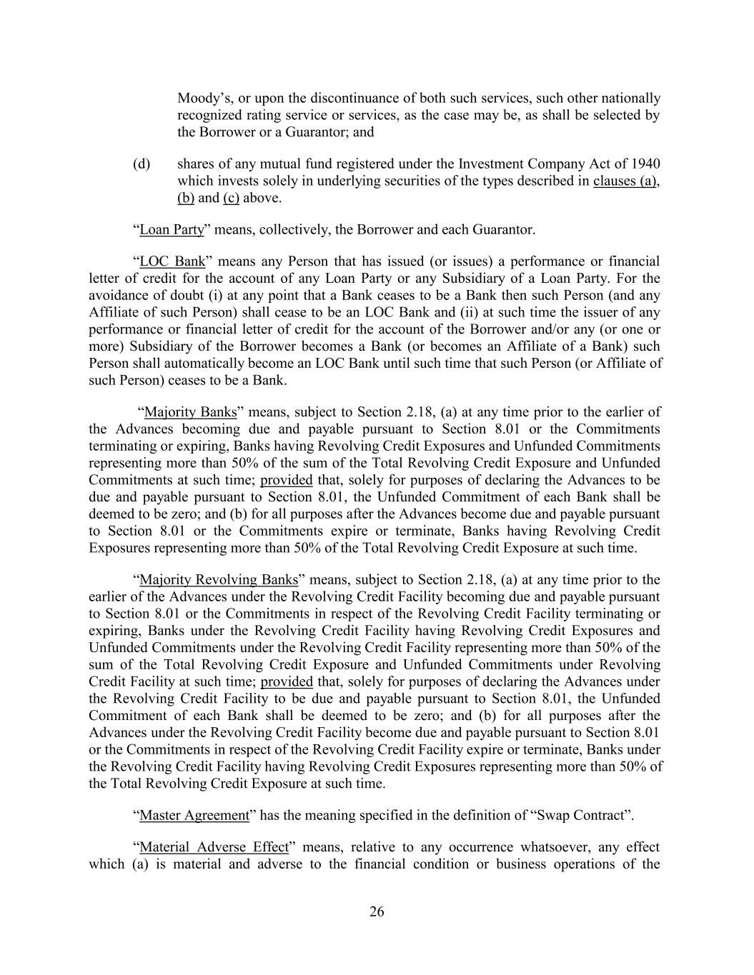 Moody’s, or upon the discontinuance of both such services, such other nationally recognized rating service or services, as the case may be, as shall be selected by the Borrower or a Guarantor; and (d) shares of any mutual fund registered under the Investment Company Act of 1940 which invests solely in underlying securities of the types described in clauses (a), (b) and (c) above. “Loan Party” means, collectively, the Borrower and each Guarantor. “LOC Bank” means any Person that has issued (or issues) a performance or financial letter of credit for the account of any Loan Party or any Subsidiary of a Loan Party. For the avoidance of doubt (i) at any point that a Bank ceases to be a Bank then such Person (and any Affiliate of such Person) shall cease to be an LOC Bank and (ii) at such time the issuer of any performance or financial letter of credit for the account of the Borrower and/or any (or one or more) Subsidiary of the Borrower becomes a Bank (or becomes an Affiliate of a Bank) such Person shall automatically become an LOC Bank until such time that such Person (or Affiliate of such Person) ceases to be a Bank. “Majority Banks” means, subject to Section 2.18, (a) at any time prior to the earlier of the Advances becoming due and payable pursuant to Section 8.01 or the Commitments terminating or expiring, Banks having Revolving Credit Exposures and Unfunded Commitments representing more than 50% of the sum of the Total Revolving Credit Exposure and Unfunded Commitments at such time; provided that, solely for purposes of declaring the Advances to be due and payable pursuant to Section 8.01, the Unfunded Commitment of each Bank shall be deemed to be zero; and (b) for all purposes after the Advances become due and payable pursuant to Section 8.01 or the Commitments expire or terminate, Banks having Revolving Credit Exposures representing more than 50% of the Total Revolving Credit Exposure at such time. “Majority Revolving Banks” means, subject to Section 2.18, (a) at any time prior to the earlier of the Advances under the Revolving Credit Facility becoming due and payable pursuant to Section 8.01 or the Commitments in respect of the Revolving Credit Facility terminating or expiring, Banks under the Revolving Credit Facility having Revolving Credit Exposures and Unfunded Commitments under the Revolving Credit Facility representing more than 50% of the sum of the Total Revolving Credit Exposure and Unfunded Commitments under Revolving Credit Facility at such time; provided that, solely for purposes of declaring the Advances under the Revolving Credit Facility to be due and payable pursuant to Section 8.01, the Unfunded Commitment of each Bank shall be deemed to be zero; and (b) for all purposes after the Advances under the Revolving Credit Facility become due and payable pursuant to Section 8.01 or the Commitments in respect of the Revolving Credit Facility expire or terminate, Banks under the Revolving Credit Facility having Revolving Credit Exposures representing more than 50% of the Total Revolving Credit Exposure at such time. “Master Agreement” has the meaning specified in the definition of “Swap Contract”. “Material Adverse Effect” means, relative to any occurrence whatsoever, any effect which (a) is material and adverse to the financial condition or business operations of the 26