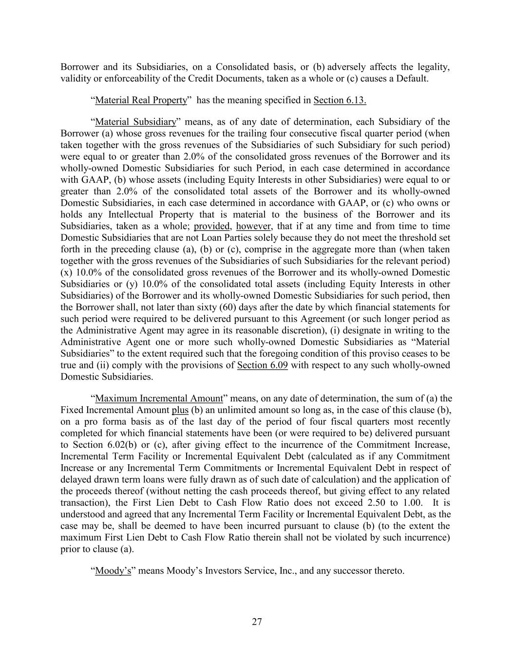 Borrower and its Subsidiaries, on a Consolidated basis, or (b) adversely affects the legality, validity or enforceability of the Credit Documents, taken as a whole or (c) causes a Default. “Material Real Property” has the meaning specified in Section 6.13. “Material Subsidiary” means, as of any date of determination, each Subsidiary of the Borrower (a) whose gross revenues for the trailing four consecutive fiscal quarter period (when taken together with the gross revenues of the Subsidiaries of such Subsidiary for such period) were equal to or greater than 2.0% of the consolidated gross revenues of the Borrower and its wholly-owned Domestic Subsidiaries for such Period, in each case determined in accordance with GAAP, (b) whose assets (including Equity Interests in other Subsidiaries) were equal to or greater than 2.0% of the consolidated total assets of the Borrower and its wholly-owned Domestic Subsidiaries, in each case determined in accordance with GAAP, or (c) who owns or holds any Intellectual Property that is material to the business of the Borrower and its Subsidiaries, taken as a whole; provided, however, that if at any time and from time to time Domestic Subsidiaries that are not Loan Parties solely because they do not meet the threshold set forth in the preceding clause (a), (b) or (c), comprise in the aggregate more than (when taken together with the gross revenues of the Subsidiaries of such Subsidiaries for the relevant period) (x) 10.0% of the consolidated gross revenues of the Borrower and its wholly-owned Domestic Subsidiaries or (y) 10.0% of the consolidated total assets (including Equity Interests in other Subsidiaries) of the Borrower and its wholly-owned Domestic Subsidiaries for such period, then the Borrower shall, not later than sixty (60) days after the date by which financial statements for such period were required to be delivered pursuant to this Agreement (or such longer period as the Administrative Agent may agree in its reasonable discretion), (i) designate in writing to the Administrative Agent one or more such wholly-owned Domestic Subsidiaries as “Material Subsidiaries” to the extent required such that the foregoing condition of this proviso ceases to be true and (ii) comply with the provisions of Section 6.09 with respect to any such wholly-owned Domestic Subsidiaries. “Maximum Incremental Amount” means, on any date of determination, the sum of (a) the Fixed Incremental Amount plus (b) an unlimited amount so long as, in the case of this clause (b), on a pro forma basis as of the last day of the period of four fiscal quarters most recently completed for which financial statements have been (or were required to be) delivered pursuant to Section 6.02(b) or (c), after giving effect to the incurrence of the Commitment Increase, Incremental Term Facility or Incremental Equivalent Debt (calculated as if any Commitment Increase or any Incremental Term Commitments or Incremental Equivalent Debt in respect of delayed drawn term loans were fully drawn as of such date of calculation) and the application of the proceeds thereof (without netting the cash proceeds thereof, but giving effect to any related transaction), the First Lien Debt to Cash Flow Ratio does not exceed 2.50 to 1.00. It is understood and agreed that any Incremental Term Facility or Incremental Equivalent Debt, as the case may be, shall be deemed to have been incurred pursuant to clause (b) (to the extent the maximum First Lien Debt to Cash Flow Ratio therein shall not be violated by such incurrence) prior to clause (a). “Moody’s” means Moody’s Investors Service, Inc., and any successor thereto. 27
