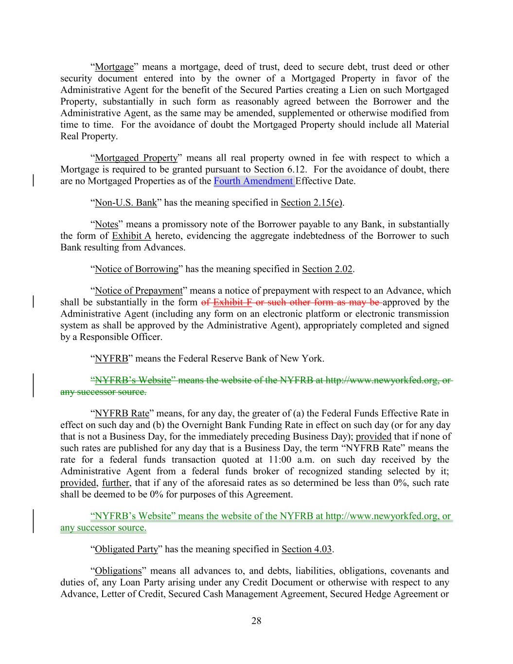 “Mortgage” means a mortgage, deed of trust, deed to secure debt, trust deed or other security document entered into by the owner of a Mortgaged Property in favor of the Administrative Agent for the benefit of the Secured Parties creating a Lien on such Mortgaged Property, substantially in such form as reasonably agreed between the Borrower and the Administrative Agent, as the same may be amended, supplemented or otherwise modified from time to time. For the avoidance of doubt the Mortgaged Property should include all Material Real Property. “Mortgaged Property” means all real property owned in fee with respect to which a Mortgage is required to be granted pursuant to Section 6.12. For the avoidance of doubt, there are no Mortgaged Properties as of the Fourth Amendment Effective Date. “Non-U.S. Bank” has the meaning specified in Section 2.15(e). “Notes” means a promissory note of the Borrower payable to any Bank, in substantially the form of Exhibit A hereto, evidencing the aggregate indebtedness of the Borrower to such Bank resulting from Advances. “Notice of Borrowing” has the meaning specified in Section 2.02. “Notice of Prepayment” means a notice of prepayment with respect to an Advance, which shall be substantially in the form of Exhibit F or such other form as may be approved by the Administrative Agent (including any form on an electronic platform or electronic transmission system as shall be approved by the Administrative Agent), appropriately completed and signed by a Responsible Officer. “NYFRB” means the Federal Reserve Bank of New York. “NYFRB’s Website” means the website of the NYFRB at http://www.newyorkfed.org, or any successor source. “NYFRB Rate” means, for any day, the greater of (a) the Federal Funds Effective Rate in effect on such day and (b) the Overnight Bank Funding Rate in effect on such day (or for any day that is not a Business Day, for the immediately preceding Business Day); provided that if none of such rates are published for any day that is a Business Day, the term “NYFRB Rate” means the rate for a federal funds transaction quoted at 11:00 a.m. on such day received by the Administrative Agent from a federal funds broker of recognized standing selected by it; provided, further, that if any of the aforesaid rates as so determined be less than 0%, such rate shall be deemed to be 0% for purposes of this Agreement. “NYFRB’s Website” means the website of the NYFRB at http://www.newyorkfed.org, or any successor source. “Obligated Party” has the meaning specified in Section 4.03. “Obligations” means all advances to, and debts, liabilities, obligations, covenants and duties of, any Loan Party arising under any Credit Document or otherwise with respect to any Advance, Letter of Credit, Secured Cash Management Agreement, Secured Hedge Agreement or 28