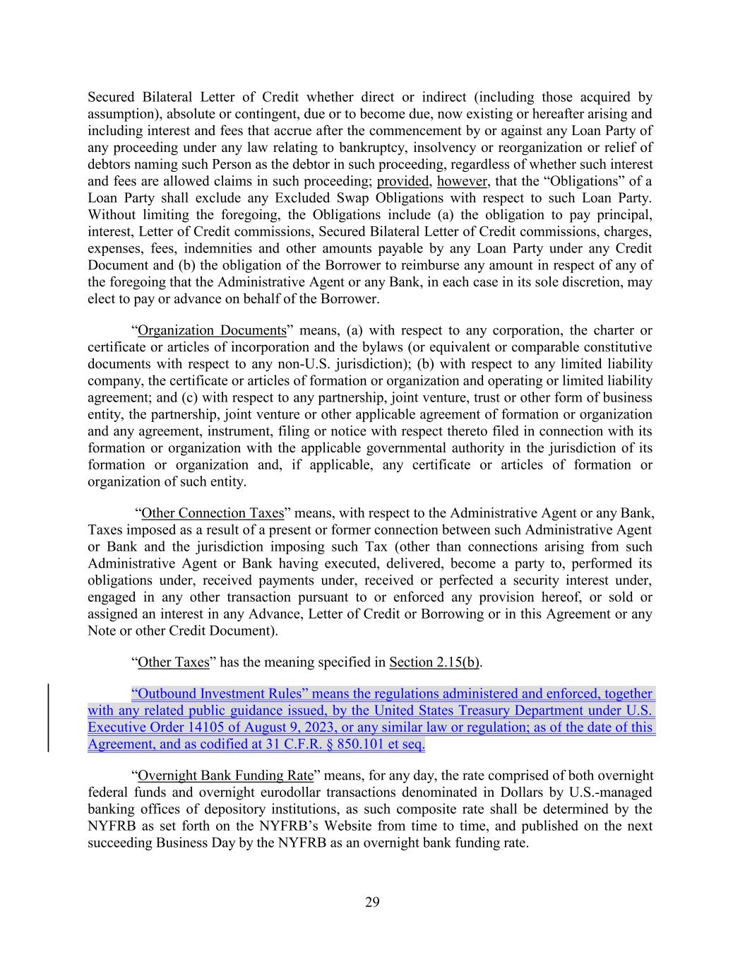 Secured Bilateral Letter of Credit whether direct or indirect (including those acquired by assumption), absolute or contingent, due or to become due, now existing or hereafter arising and including interest and fees that accrue after the commencement by or against any Loan Party of any proceeding under any law relating to bankruptcy, insolvency or reorganization or relief of debtors naming such Person as the debtor in such proceeding, regardless of whether such interest and fees are allowed claims in such proceeding; provided, however, that the “Obligations” of a Loan Party shall exclude any Excluded Swap Obligations with respect to such Loan Party. Without limiting the foregoing, the Obligations include (a) the obligation to pay principal, interest, Letter of Credit commissions, Secured Bilateral Letter of Credit commissions, charges, expenses, fees, indemnities and other amounts payable by any Loan Party under any Credit Document and (b) the obligation of the Borrower to reimburse any amount in respect of any of the foregoing that the Administrative Agent or any Bank, in each case in its sole discretion, may elect to pay or advance on behalf of the Borrower. “Organization Documents” means, (a) with respect to any corporation, the charter or certificate or articles of incorporation and the bylaws (or equivalent or comparable constitutive documents with respect to any non-U.S. jurisdiction); (b) with respect to any limited liability company, the certificate or articles of formation or organization and operating or limited liability agreement; and (c) with respect to any partnership, joint venture, trust or other form of business entity, the partnership, joint venture or other applicable agreement of formation or organization and any agreement, instrument, filing or notice with respect thereto filed in connection with its formation or organization with the applicable governmental authority in the jurisdiction of its formation or organization and, if applicable, any certificate or articles of formation or organization of such entity. “Other Connection Taxes” means, with respect to the Administrative Agent or any Bank, Taxes imposed as a result of a present or former connection between such Administrative Agent or Bank and the jurisdiction imposing such Tax (other than connections arising from such Administrative Agent or Bank having executed, delivered, become a party to, performed its obligations under, received payments under, received or perfected a security interest under, engaged in any other transaction pursuant to or enforced any provision hereof, or sold or assigned an interest in any Advance, Letter of Credit or Borrowing or in this Agreement or any Note or other Credit Document). “Other Taxes” has the meaning specified in Section 2.15(b). “Outbound Investment Rules” means the regulations administered and enforced, together with any related public guidance issued, by the United States Treasury Department under U.S. Executive Order 14105 of August 9, 2023, or any similar law or regulation; as of the date of this Agreement, and as codified at 31 C.F.R. § 850.101 et seq. “Overnight Bank Funding Rate” means, for any day, the rate comprised of both overnight federal funds and overnight eurodollar transactions denominated in Dollars by U.S.-managed banking offices of depository institutions, as such composite rate shall be determined by the NYFRB as set forth on the NYFRB’s Website from time to time, and published on the next succeeding Business Day by the NYFRB as an overnight bank funding rate. 29