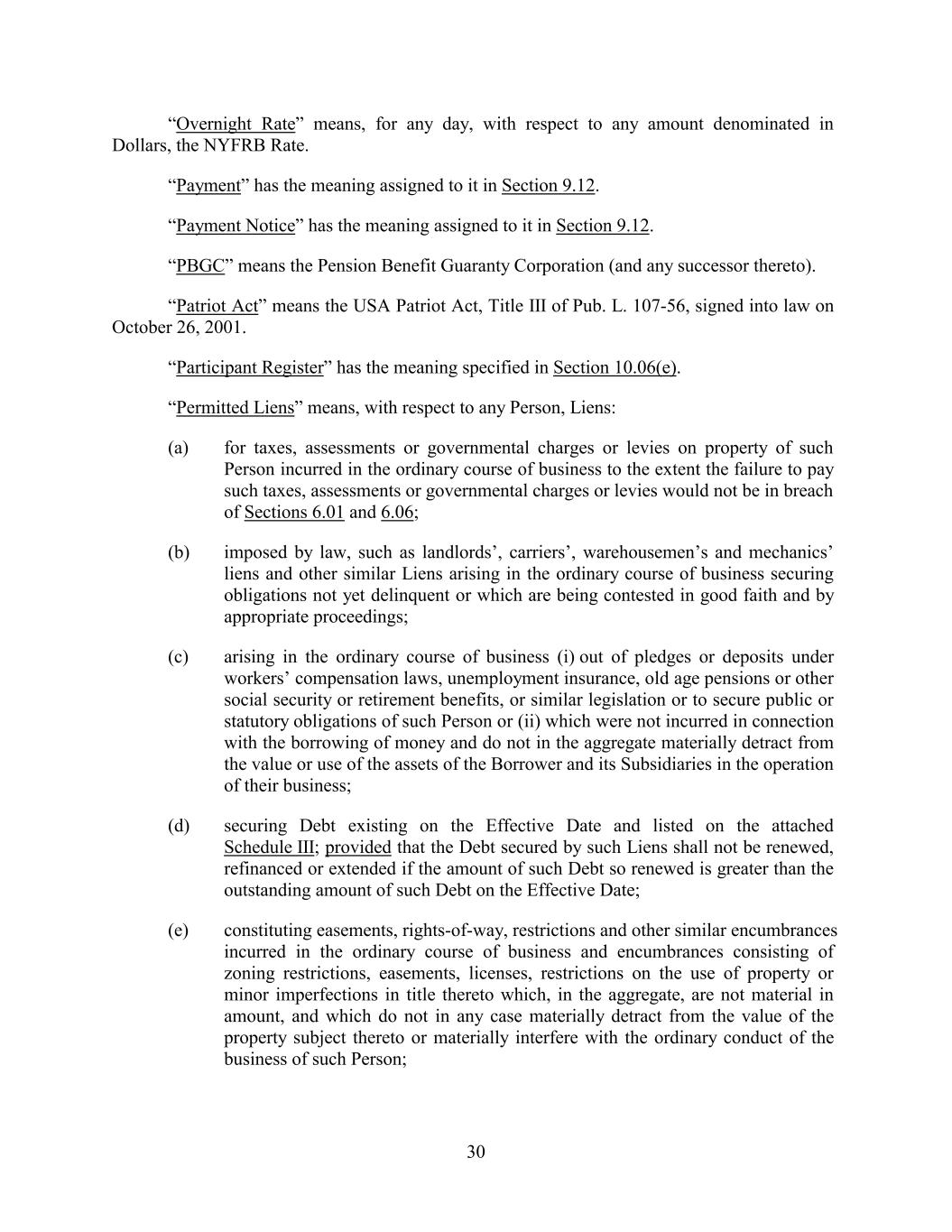 “Overnight Rate” means, for any day, with respect to any amount denominated in Dollars, the NYFRB Rate. “Payment” has the meaning assigned to it in Section 9.12. “Payment Notice” has the meaning assigned to it in Section 9.12. “PBGC” means the Pension Benefit Guaranty Corporation (and any successor thereto). “Patriot Act” means the USA Patriot Act, Title III of Pub. L. 107-56, signed into law on October 26, 2001. “Participant Register” has the meaning specified in Section 10.06(e). “Permitted Liens” means, with respect to any Person, Liens: (a) for taxes, assessments or governmental charges or levies on property of such Person incurred in the ordinary course of business to the extent the failure to pay such taxes, assessments or governmental charges or levies would not be in breach of Sections 6.01 and 6.06; (b) imposed by law, such as landlords’, carriers’, warehousemen’s and mechanics’ liens and other similar Liens arising in the ordinary course of business securing obligations not yet delinquent or which are being contested in good faith and by appropriate proceedings; (c) arising in the ordinary course of business (i) out of pledges or deposits under workers’ compensation laws, unemployment insurance, old age pensions or other social security or retirement benefits, or similar legislation or to secure public or statutory obligations of such Person or (ii) which were not incurred in connection with the borrowing of money and do not in the aggregate materially detract from the value or use of the assets of the Borrower and its Subsidiaries in the operation of their business; (d) securing Debt existing on the Effective Date and listed on the attached Schedule III; provided that the Debt secured by such Liens shall not be renewed, refinanced or extended if the amount of such Debt so renewed is greater than the outstanding amount of such Debt on the Effective Date; (e) constituting easements, rights-of-way, restrictions and other similar encumbrances incurred in the ordinary course of business and encumbrances consisting of zoning restrictions, easements, licenses, restrictions on the use of property or minor imperfections in title thereto which, in the aggregate, are not material in amount, and which do not in any case materially detract from the value of the property subject thereto or materially interfere with the ordinary conduct of the business of such Person; 30