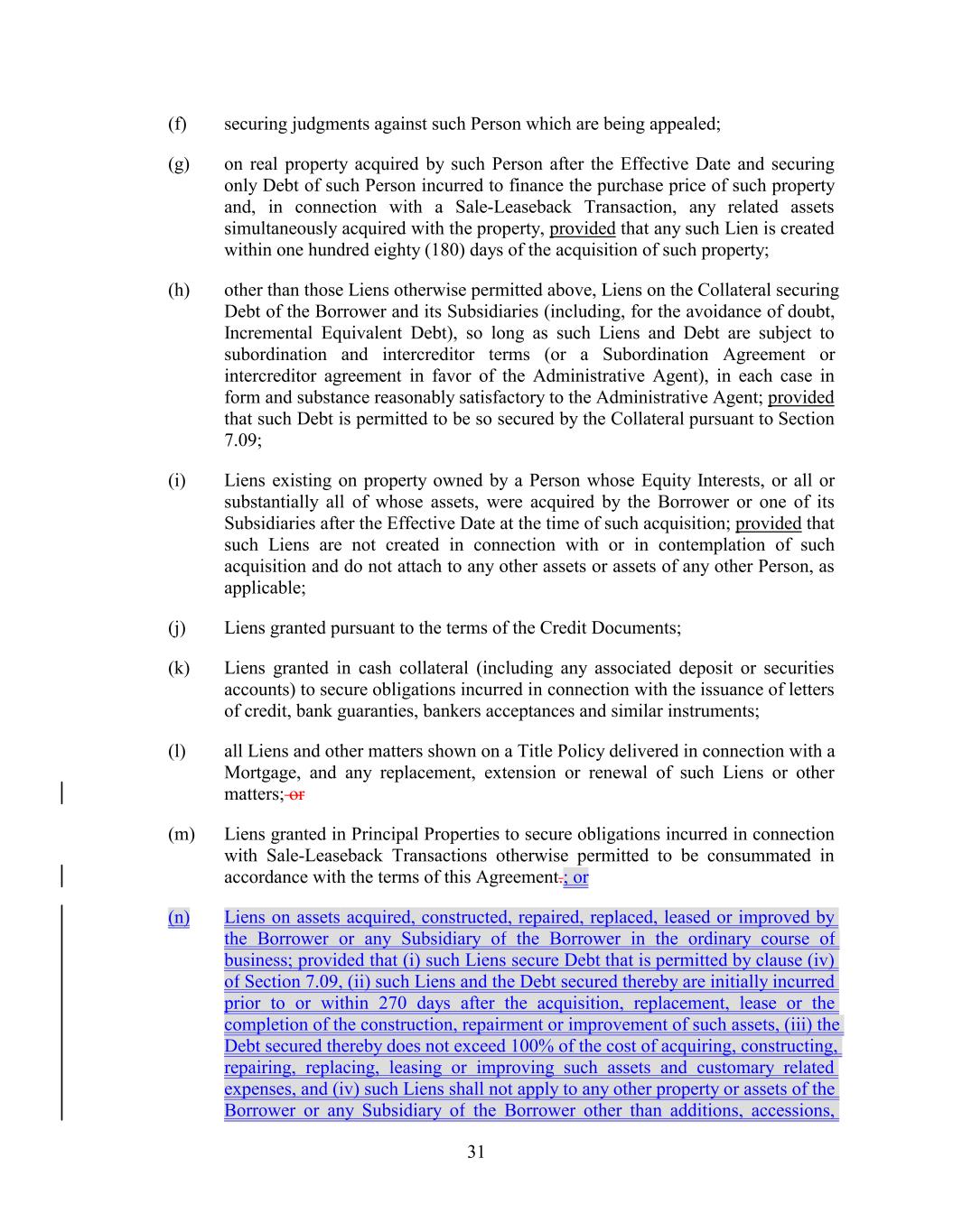 (f) securing judgments against such Person which are being appealed; (g) on real property acquired by such Person after the Effective Date and securing only Debt of such Person incurred to finance the purchase price of such property and, in connection with a Sale-Leaseback Transaction, any related assets simultaneously acquired with the property, provided that any such Lien is created within one hundred eighty (180) days of the acquisition of such property; (h) other than those Liens otherwise permitted above, Liens on the Collateral securing Debt of the Borrower and its Subsidiaries (including, for the avoidance of doubt, Incremental Equivalent Debt), so long as such Liens and Debt are subject to subordination and intercreditor terms (or a Subordination Agreement or intercreditor agreement in favor of the Administrative Agent), in each case in form and substance reasonably satisfactory to the Administrative Agent; provided that such Debt is permitted to be so secured by the Collateral pursuant to Section 7.09; (i) Liens existing on property owned by a Person whose Equity Interests, or all or substantially all of whose assets, were acquired by the Borrower or one of its Subsidiaries after the Effective Date at the time of such acquisition; provided that such Liens are not created in connection with or in contemplation of such acquisition and do not attach to any other assets or assets of any other Person, as applicable; (j) Liens granted pursuant to the terms of the Credit Documents; (k) Liens granted in cash collateral (including any associated deposit or securities accounts) to secure obligations incurred in connection with the issuance of letters of credit, bank guaranties, bankers acceptances and similar instruments; (l) all Liens and other matters shown on a Title Policy delivered in connection with a Mortgage, and any replacement, extension or renewal of such Liens or other matters; or (m) Liens granted in Principal Properties to secure obligations incurred in connection with Sale-Leaseback Transactions otherwise permitted to be consummated in accordance with the terms of this Agreement.; or (n) Liens on assets acquired, constructed, repaired, replaced, leased or improved by the Borrower or any Subsidiary of the Borrower in the ordinary course of business; provided that (i) such Liens secure Debt that is permitted by clause (iv) of Section 7.09, (ii) such Liens and the Debt secured thereby are initially incurred prior to or within 270 days after the acquisition, replacement, lease or the completion of the construction, repairment or improvement of such assets, (iii) the Debt secured thereby does not exceed 100% of the cost of acquiring, constructing, repairing, replacing, leasing or improving such assets and customary related expenses, and (iv) such Liens shall not apply to any other property or assets of the Borrower or any Subsidiary of the Borrower other than additions, accessions, 31
