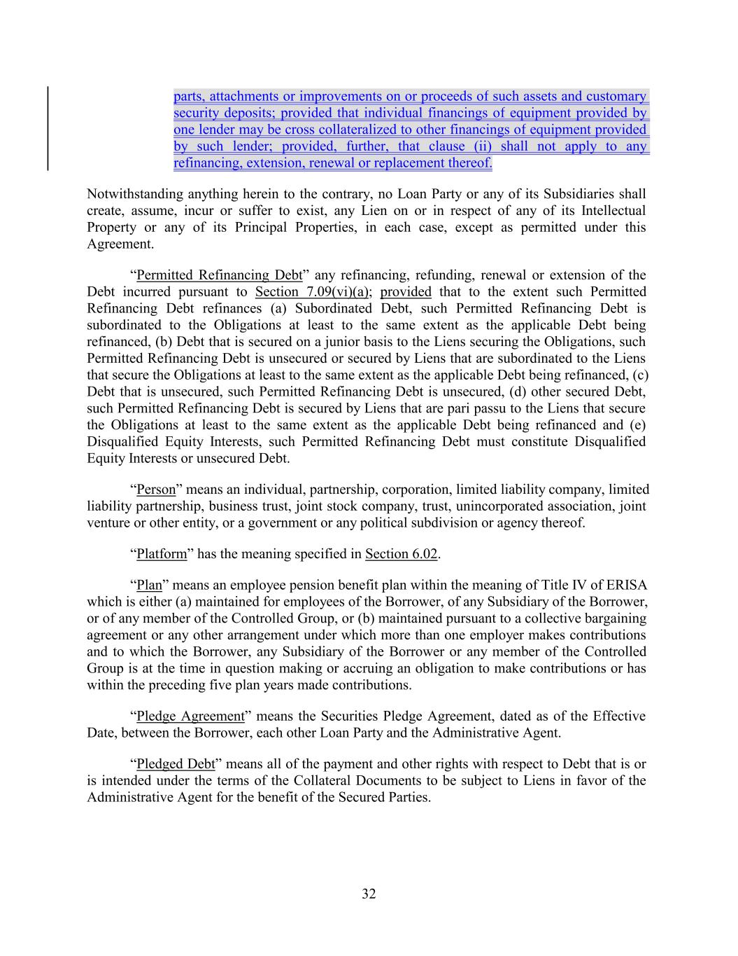parts, attachments or improvements on or proceeds of such assets and customary security deposits; provided that individual financings of equipment provided by one lender may be cross collateralized to other financings of equipment provided by such lender; provided, further, that clause (ii) shall not apply to any refinancing, extension, renewal or replacement thereof. Notwithstanding anything herein to the contrary, no Loan Party or any of its Subsidiaries shall create, assume, incur or suffer to exist, any Lien on or in respect of any of its Intellectual Property or any of its Principal Properties, in each case, except as permitted under this Agreement. “Permitted Refinancing Debt” any refinancing, refunding, renewal or extension of the Debt incurred pursuant to Section 7.09(vi)(a); provided that to the extent such Permitted Refinancing Debt refinances (a) Subordinated Debt, such Permitted Refinancing Debt is subordinated to the Obligations at least to the same extent as the applicable Debt being refinanced, (b) Debt that is secured on a junior basis to the Liens securing the Obligations, such Permitted Refinancing Debt is unsecured or secured by Liens that are subordinated to the Liens that secure the Obligations at least to the same extent as the applicable Debt being refinanced, (c) Debt that is unsecured, such Permitted Refinancing Debt is unsecured, (d) other secured Debt, such Permitted Refinancing Debt is secured by Liens that are pari passu to the Liens that secure the Obligations at least to the same extent as the applicable Debt being refinanced and (e) Disqualified Equity Interests, such Permitted Refinancing Debt must constitute Disqualified Equity Interests or unsecured Debt. “Person” means an individual, partnership, corporation, limited liability company, limited liability partnership, business trust, joint stock company, trust, unincorporated association, joint venture or other entity, or a government or any political subdivision or agency thereof. “Platform” has the meaning specified in Section 6.02. “Plan” means an employee pension benefit plan within the meaning of Title IV of ERISA which is either (a) maintained for employees of the Borrower, of any Subsidiary of the Borrower, or of any member of the Controlled Group, or (b) maintained pursuant to a collective bargaining agreement or any other arrangement under which more than one employer makes contributions and to which the Borrower, any Subsidiary of the Borrower or any member of the Controlled Group is at the time in question making or accruing an obligation to make contributions or has within the preceding five plan years made contributions. “Pledge Agreement” means the Securities Pledge Agreement, dated as of the Effective Date, between the Borrower, each other Loan Party and the Administrative Agent. “Pledged Debt” means all of the payment and other rights with respect to Debt that is or is intended under the terms of the Collateral Documents to be subject to Liens in favor of the Administrative Agent for the benefit of the Secured Parties. 32