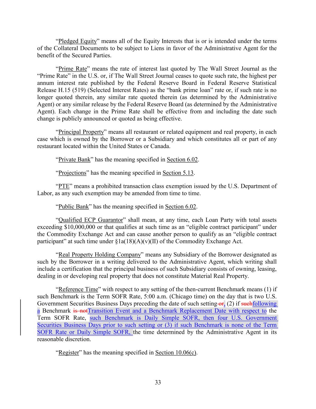 “Pledged Equity” means all of the Equity Interests that is or is intended under the terms of the Collateral Documents to be subject to Liens in favor of the Administrative Agent for the benefit of the Secured Parties. “Prime Rate” means the rate of interest last quoted by The Wall Street Journal as the “Prime Rate” in the U.S. or, if The Wall Street Journal ceases to quote such rate, the highest per annum interest rate published by the Federal Reserve Board in Federal Reserve Statistical Release H.15 (519) (Selected Interest Rates) as the “bank prime loan” rate or, if such rate is no longer quoted therein, any similar rate quoted therein (as determined by the Administrative Agent) or any similar release by the Federal Reserve Board (as determined by the Administrative Agent). Each change in the Prime Rate shall be effective from and including the date such change is publicly announced or quoted as being effective. “Principal Property” means all restaurant or related equipment and real property, in each case which is owned by the Borrower or a Subsidiary and which constitutes all or part of any restaurant located within the United States or Canada. “Private Bank” has the meaning specified in Section 6.02. “Projections” has the meaning specified in Section 5.13. “PTE” means a prohibited transaction class exemption issued by the U.S. Department of Labor, as any such exemption may be amended from time to time. “Public Bank” has the meaning specified in Section 6.02. “Qualified ECP Guarantor” shall mean, at any time, each Loan Party with total assets exceeding $10,000,000 or that qualifies at such time as an “eligible contract participant” under the Commodity Exchange Act and can cause another person to qualify as an “eligible contract participant” at such time under §1a(18)(A)(v)(II) of the Commodity Exchange Act. “Real Property Holding Company” means any Subsidiary of the Borrower designated as such by the Borrower in a writing delivered to the Administrative Agent, which writing shall include a certification that the principal business of such Subsidiary consists of owning, leasing, dealing in or developing real property that does not constitute Material Real Property. “Reference Time” with respect to any setting of the then-current Benchmark means (1) if such Benchmark is the Term SOFR Rate, 5:00 a.m. (Chicago time) on the day that is two U.S. Government Securities Business Days preceding the date of such setting or, (2) if suchfollowing a Benchmark is notTransition Event and a Benchmark Replacement Date with respect to the Term SOFR Rate, such Benchmark is Daily Simple SOFR, then four U.S. Government Securities Business Days prior to such setting or (3) if such Benchmark is none of the Term SOFR Rate or Daily Simple SOFR, the time determined by the Administrative Agent in its reasonable discretion. “Register” has the meaning specified in Section 10.06(c). 33