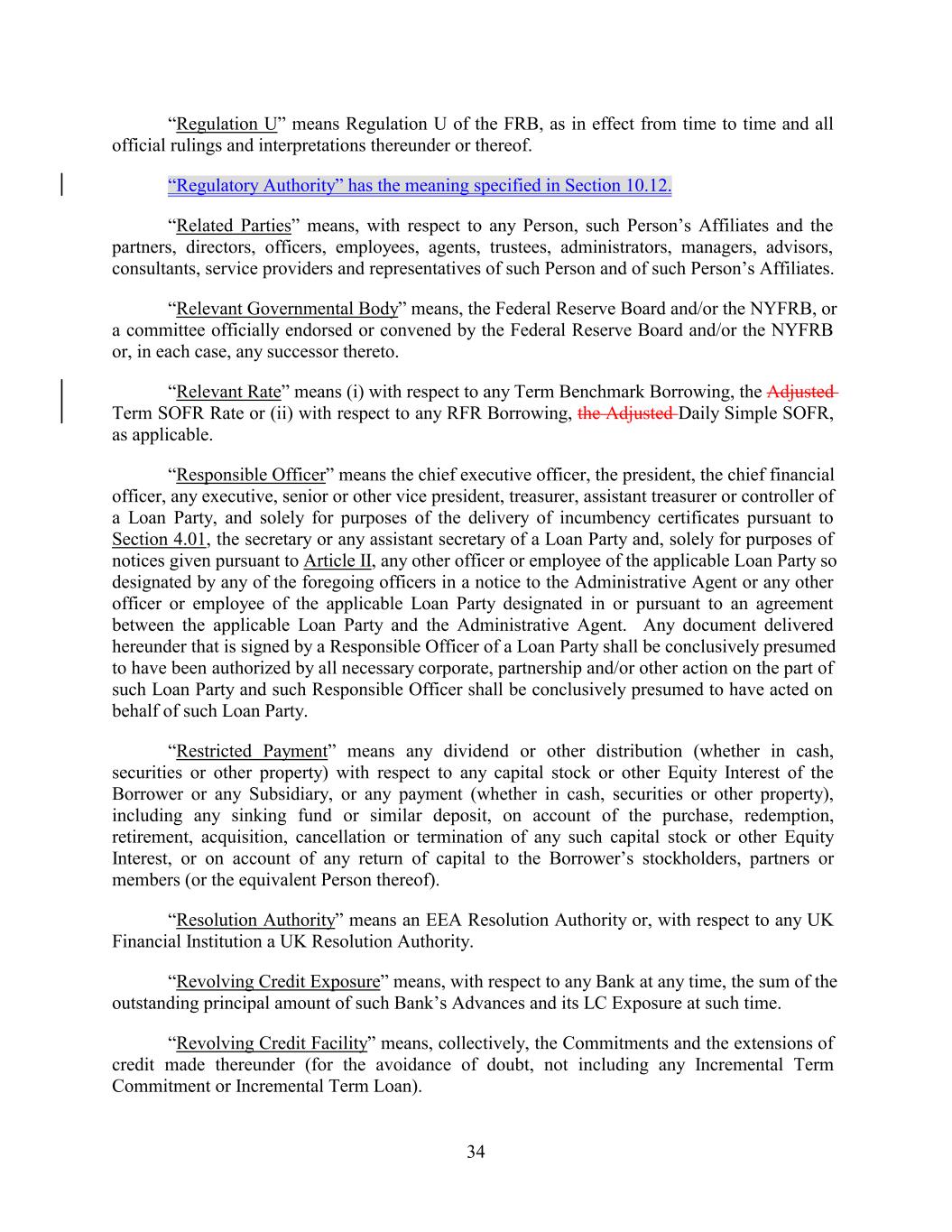 “Regulation U” means Regulation U of the FRB, as in effect from time to time and all official rulings and interpretations thereunder or thereof. “Regulatory Authority” has the meaning specified in Section 10.12. “Related Parties” means, with respect to any Person, such Person’s Affiliates and the partners, directors, officers, employees, agents, trustees, administrators, managers, advisors, consultants, service providers and representatives of such Person and of such Person’s Affiliates. “Relevant Governmental Body” means, the Federal Reserve Board and/or the NYFRB, or a committee officially endorsed or convened by the Federal Reserve Board and/or the NYFRB or, in each case, any successor thereto. “Relevant Rate” means (i) with respect to any Term Benchmark Borrowing, the Adjusted Term SOFR Rate or (ii) with respect to any RFR Borrowing, the Adjusted Daily Simple SOFR, as applicable. “Responsible Officer” means the chief executive officer, the president, the chief financial officer, any executive, senior or other vice president, treasurer, assistant treasurer or controller of a Loan Party, and solely for purposes of the delivery of incumbency certificates pursuant to Section 4.01, the secretary or any assistant secretary of a Loan Party and, solely for purposes of notices given pursuant to Article II, any other officer or employee of the applicable Loan Party so designated by any of the foregoing officers in a notice to the Administrative Agent or any other officer or employee of the applicable Loan Party designated in or pursuant to an agreement between the applicable Loan Party and the Administrative Agent. Any document delivered hereunder that is signed by a Responsible Officer of a Loan Party shall be conclusively presumed to have been authorized by all necessary corporate, partnership and/or other action on the part of such Loan Party and such Responsible Officer shall be conclusively presumed to have acted on behalf of such Loan Party. “Restricted Payment” means any dividend or other distribution (whether in cash, securities or other property) with respect to any capital stock or other Equity Interest of the Borrower or any Subsidiary, or any payment (whether in cash, securities or other property), including any sinking fund or similar deposit, on account of the purchase, redemption, retirement, acquisition, cancellation or termination of any such capital stock or other Equity Interest, or on account of any return of capital to the Borrower’s stockholders, partners or members (or the equivalent Person thereof). “Resolution Authority” means an EEA Resolution Authority or, with respect to any UK Financial Institution a UK Resolution Authority. “Revolving Credit Exposure” means, with respect to any Bank at any time, the sum of the outstanding principal amount of such Bank’s Advances and its LC Exposure at such time. “Revolving Credit Facility” means, collectively, the Commitments and the extensions of credit made thereunder (for the avoidance of doubt, not including any Incremental Term Commitment or Incremental Term Loan). 34