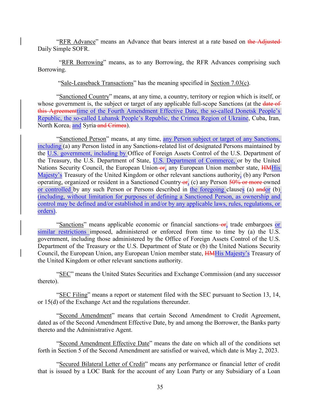 “RFR Advance” means an Advance that bears interest at a rate based on the Adjusted Daily Simple SOFR. “RFR Borrowing” means, as to any Borrowing, the RFR Advances comprising such Borrowing. “Sale-Leaseback Transactions” has the meaning specified in Section 7.03(c). “Sanctioned Country” means, at any time, a country, territory or region which is itself, or whose government is, the subject or target of any applicable full-scope Sanctions (at the date of this Agreementtime of the Fourth Amendment Effective Date, the so-called Donetsk People’s Republic, the so-called Luhansk People’s Republic, the Crimea Region of Ukraine, Cuba, Iran, North Korea, and Syria and Crimea). “Sanctioned Person” means, at any time, any Person subject or target of any Sanctions, including (a) any Person listed in any Sanctions-related list of designated Persons maintained by the U.S. government, including by Office of Foreign Assets Control of the U.S. Department of the Treasury, the U.S. Department of State, U.S. Department of Commerce, or by the United Nations Security Council, the European Union or, any European Union member state, HMHis Majesty’s Treasury of the United Kingdom or other relevant sanctions authority, (b) any Person operating, organized or resident in a Sanctioned Country or, (c) any Person 50% or more owned or controlled by any such Person or Persons described in the foregoing clauses (a) andor (b) (including, without limitation for purposes of defining a Sanctioned Person, as ownership and control may be defined and/or established in and/or by any applicable laws, rules, regulations, or orders). “Sanctions” means applicable economic or financial sanctions or, trade embargoes or similar restrictions imposed, administered or enforced from time to time by (a) the U.S. government, including those administered by the Office of Foreign Assets Control of the U.S. Department of the Treasury or the U.S. Department of State or (b) the United Nations Security Council, the European Union, any European Union member state, HMHis Majesty’s Treasury of the United Kingdom or other relevant sanctions authority. “SEC” means the United States Securities and Exchange Commission (and any successor thereto). “SEC Filing” means a report or statement filed with the SEC pursuant to Section 13, 14, or 15(d) of the Exchange Act and the regulations thereunder. “Second Amendment” means that certain Second Amendment to Credit Agreement, dated as of the Second Amendment Effective Date, by and among the Borrower, the Banks party thereto and the Administrative Agent. “Second Amendment Effective Date” means the date on which all of the conditions set forth in Section 5 of the Second Amendment are satisfied or waived, which date is May 2, 2023. “Secured Bilateral Letter of Credit” means any performance or financial letter of credit that is issued by a LOC Bank for the account of any Loan Party or any Subsidiary of a Loan 35