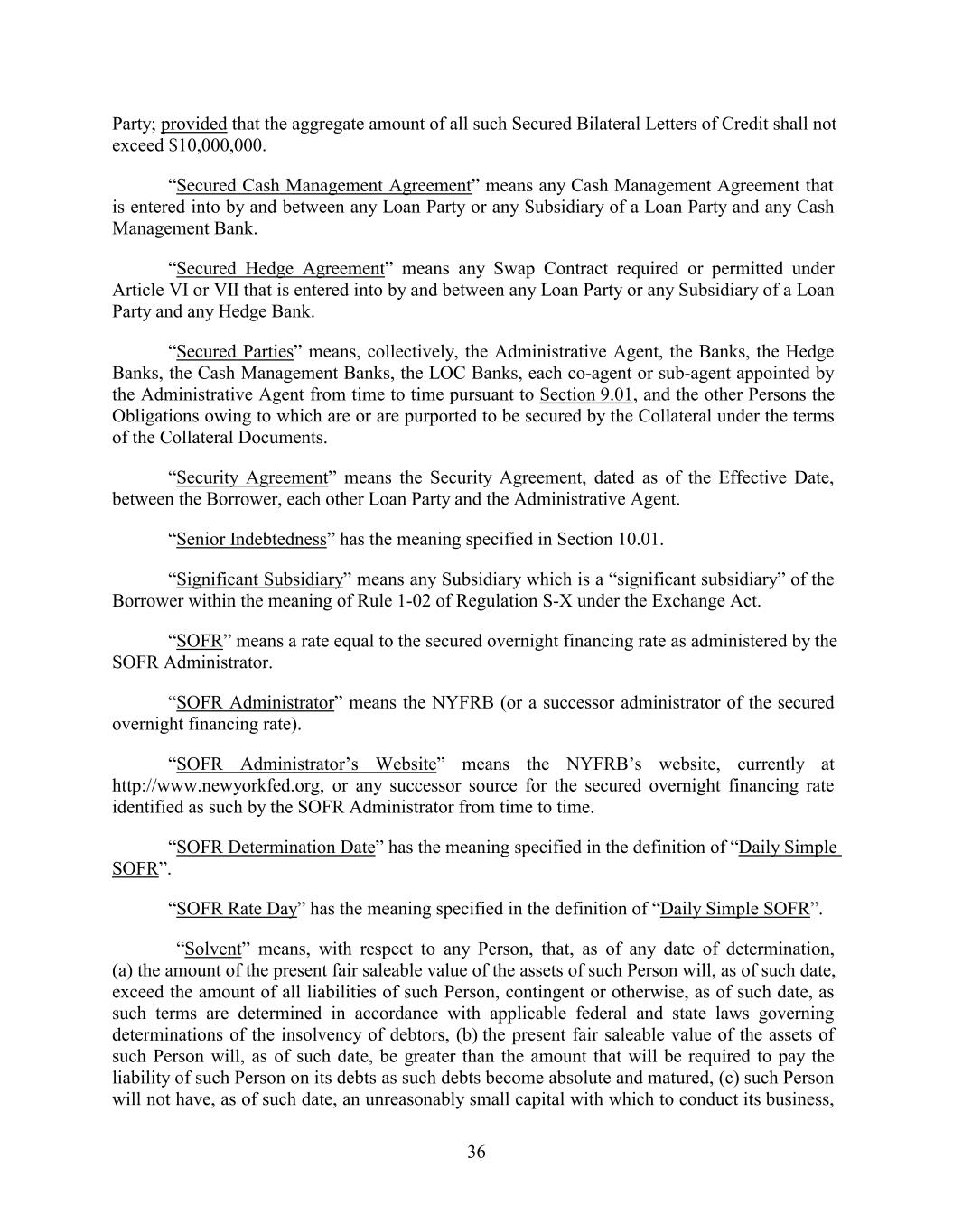 Party; provided that the aggregate amount of all such Secured Bilateral Letters of Credit shall not exceed $10,000,000. “Secured Cash Management Agreement” means any Cash Management Agreement that is entered into by and between any Loan Party or any Subsidiary of a Loan Party and any Cash Management Bank. “Secured Hedge Agreement” means any Swap Contract required or permitted under Article VI or VII that is entered into by and between any Loan Party or any Subsidiary of a Loan Party and any Hedge Bank. “Secured Parties” means, collectively, the Administrative Agent, the Banks, the Hedge Banks, the Cash Management Banks, the LOC Banks, each co-agent or sub-agent appointed by the Administrative Agent from time to time pursuant to Section 9.01, and the other Persons the Obligations owing to which are or are purported to be secured by the Collateral under the terms of the Collateral Documents. “Security Agreement” means the Security Agreement, dated as of the Effective Date, between the Borrower, each other Loan Party and the Administrative Agent. “Senior Indebtedness” has the meaning specified in Section 10.01. “Significant Subsidiary” means any Subsidiary which is a “significant subsidiary” of the Borrower within the meaning of Rule 1-02 of Regulation S-X under the Exchange Act. “SOFR” means a rate equal to the secured overnight financing rate as administered by the SOFR Administrator. “SOFR Administrator” means the NYFRB (or a successor administrator of the secured overnight financing rate). “SOFR Administrator’s Website” means the NYFRB’s website, currently at http://www.newyorkfed.org, or any successor source for the secured overnight financing rate identified as such by the SOFR Administrator from time to time. “SOFR Determination Date” has the meaning specified in the definition of “Daily Simple SOFR”. “SOFR Rate Day” has the meaning specified in the definition of “Daily Simple SOFR”. “Solvent” means, with respect to any Person, that, as of any date of determination, (a) the amount of the present fair saleable value of the assets of such Person will, as of such date, exceed the amount of all liabilities of such Person, contingent or otherwise, as of such date, as such terms are determined in accordance with applicable federal and state laws governing determinations of the insolvency of debtors, (b) the present fair saleable value of the assets of such Person will, as of such date, be greater than the amount that will be required to pay the liability of such Person on its debts as such debts become absolute and matured, (c) such Person will not have, as of such date, an unreasonably small capital with which to conduct its business, 36