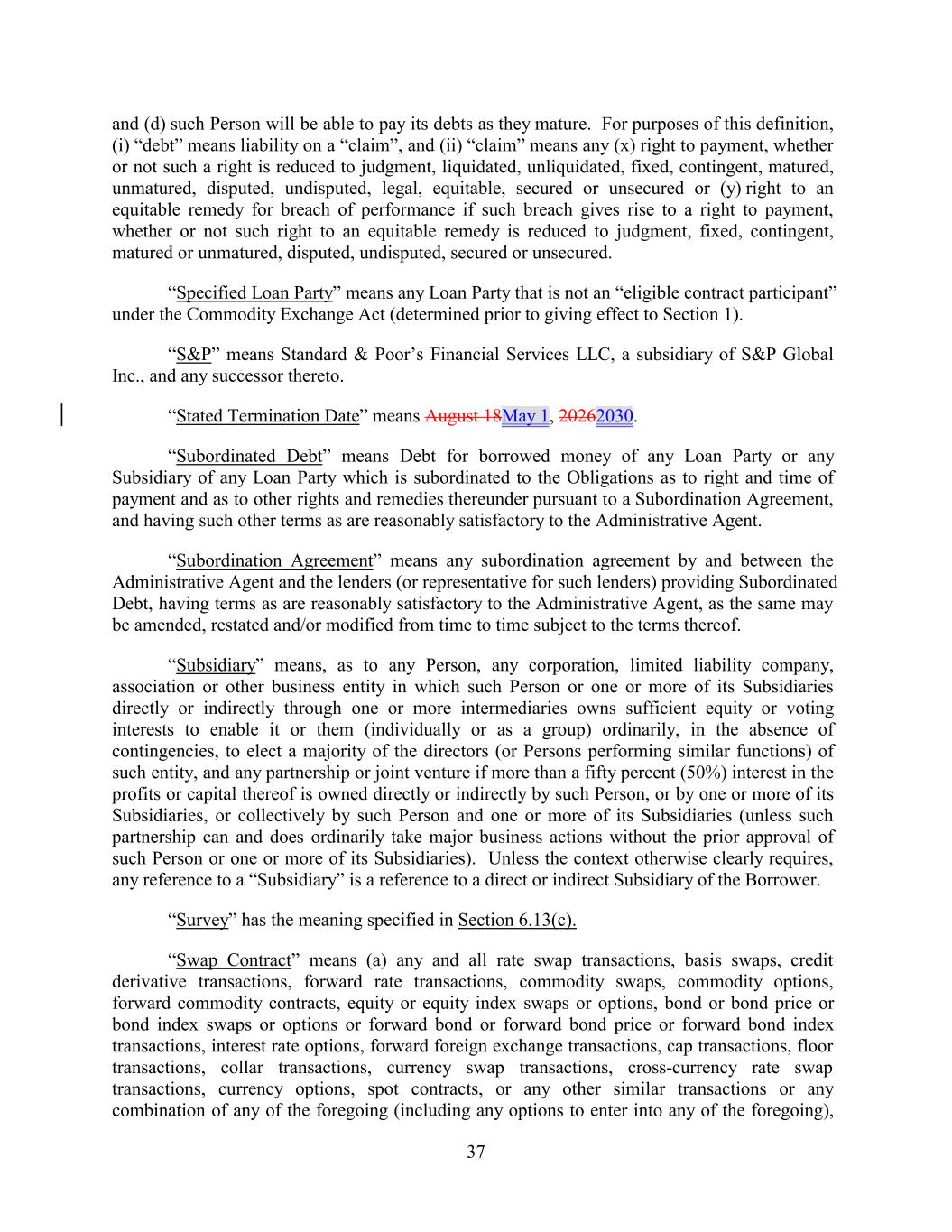 and (d) such Person will be able to pay its debts as they mature. For purposes of this definition, (i) “debt” means liability on a “claim”, and (ii) “claim” means any (x) right to payment, whether or not such a right is reduced to judgment, liquidated, unliquidated, fixed, contingent, matured, unmatured, disputed, undisputed, legal, equitable, secured or unsecured or (y) right to an equitable remedy for breach of performance if such breach gives rise to a right to payment, whether or not such right to an equitable remedy is reduced to judgment, fixed, contingent, matured or unmatured, disputed, undisputed, secured or unsecured. “Specified Loan Party” means any Loan Party that is not an “eligible contract participant” under the Commodity Exchange Act (determined prior to giving effect to Section 1). “S&P” means Standard & Poor’s Financial Services LLC, a subsidiary of S&P Global Inc., and any successor thereto. “Stated Termination Date” means August 18May 1, 20262030. “Subordinated Debt” means Debt for borrowed money of any Loan Party or any Subsidiary of any Loan Party which is subordinated to the Obligations as to right and time of payment and as to other rights and remedies thereunder pursuant to a Subordination Agreement, and having such other terms as are reasonably satisfactory to the Administrative Agent. “Subordination Agreement” means any subordination agreement by and between the Administrative Agent and the lenders (or representative for such lenders) providing Subordinated Debt, having terms as are reasonably satisfactory to the Administrative Agent, as the same may be amended, restated and/or modified from time to time subject to the terms thereof. “Subsidiary” means, as to any Person, any corporation, limited liability company, association or other business entity in which such Person or one or more of its Subsidiaries directly or indirectly through one or more intermediaries owns sufficient equity or voting interests to enable it or them (individually or as a group) ordinarily, in the absence of contingencies, to elect a majority of the directors (or Persons performing similar functions) of such entity, and any partnership or joint venture if more than a fifty percent (50%) interest in the profits or capital thereof is owned directly or indirectly by such Person, or by one or more of its Subsidiaries, or collectively by such Person and one or more of its Subsidiaries (unless such partnership can and does ordinarily take major business actions without the prior approval of such Person or one or more of its Subsidiaries). Unless the context otherwise clearly requires, any reference to a “Subsidiary” is a reference to a direct or indirect Subsidiary of the Borrower. “Survey” has the meaning specified in Section 6.13(c). “Swap Contract” means (a) any and all rate swap transactions, basis swaps, credit derivative transactions, forward rate transactions, commodity swaps, commodity options, forward commodity contracts, equity or equity index swaps or options, bond or bond price or bond index swaps or options or forward bond or forward bond price or forward bond index transactions, interest rate options, forward foreign exchange transactions, cap transactions, floor transactions, collar transactions, currency swap transactions, cross-currency rate swap transactions, currency options, spot contracts, or any other similar transactions or any combination of any of the foregoing (including any options to enter into any of the foregoing), 37