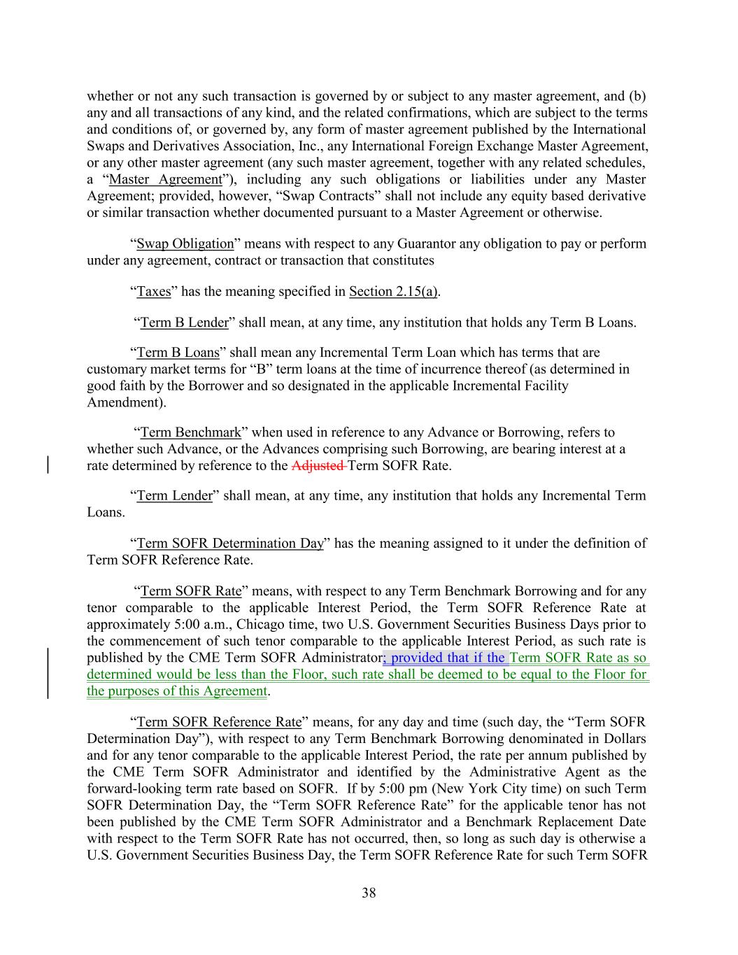 whether or not any such transaction is governed by or subject to any master agreement, and (b) any and all transactions of any kind, and the related confirmations, which are subject to the terms and conditions of, or governed by, any form of master agreement published by the International Swaps and Derivatives Association, Inc., any International Foreign Exchange Master Agreement, or any other master agreement (any such master agreement, together with any related schedules, a “Master Agreement”), including any such obligations or liabilities under any Master Agreement; provided, however, “Swap Contracts” shall not include any equity based derivative or similar transaction whether documented pursuant to a Master Agreement or otherwise. “Swap Obligation” means with respect to any Guarantor any obligation to pay or perform under any agreement, contract or transaction that constitutes “Taxes” has the meaning specified in Section 2.15(a). “Term B Lender” shall mean, at any time, any institution that holds any Term B Loans. “Term B Loans” shall mean any Incremental Term Loan which has terms that are customary market terms for “B” term loans at the time of incurrence thereof (as determined in good faith by the Borrower and so designated in the applicable Incremental Facility Amendment). “Term Benchmark” when used in reference to any Advance or Borrowing, refers to whether such Advance, or the Advances comprising such Borrowing, are bearing interest at a rate determined by reference to the Adjusted Term SOFR Rate. “Term Lender” shall mean, at any time, any institution that holds any Incremental Term Loans. “Term SOFR Determination Day” has the meaning assigned to it under the definition of Term SOFR Reference Rate. “Term SOFR Rate” means, with respect to any Term Benchmark Borrowing and for any tenor comparable to the applicable Interest Period, the Term SOFR Reference Rate at approximately 5:00 a.m., Chicago time, two U.S. Government Securities Business Days prior to the commencement of such tenor comparable to the applicable Interest Period, as such rate is published by the CME Term SOFR Administrator; provided that if the Term SOFR Rate as so determined would be less than the Floor, such rate shall be deemed to be equal to the Floor for the purposes of this Agreement. “Term SOFR Reference Rate” means, for any day and time (such day, the “Term SOFR Determination Day”), with respect to any Term Benchmark Borrowing denominated in Dollars and for any tenor comparable to the applicable Interest Period, the rate per annum published by the CME Term SOFR Administrator and identified by the Administrative Agent as the forward-looking term rate based on SOFR. If by 5:00 pm (New York City time) on such Term SOFR Determination Day, the “Term SOFR Reference Rate” for the applicable tenor has not been published by the CME Term SOFR Administrator and a Benchmark Replacement Date with respect to the Term SOFR Rate has not occurred, then, so long as such day is otherwise a U.S. Government Securities Business Day, the Term SOFR Reference Rate for such Term SOFR 38