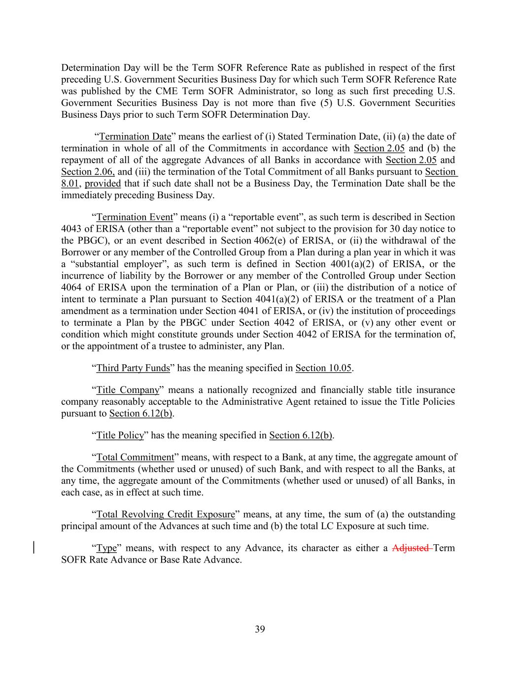 Determination Day will be the Term SOFR Reference Rate as published in respect of the first preceding U.S. Government Securities Business Day for which such Term SOFR Reference Rate was published by the CME Term SOFR Administrator, so long as such first preceding U.S. Government Securities Business Day is not more than five (5) U.S. Government Securities Business Days prior to such Term SOFR Determination Day. “Termination Date” means the earliest of (i) Stated Termination Date, (ii) (a) the date of termination in whole of all of the Commitments in accordance with Section 2.05 and (b) the repayment of all of the aggregate Advances of all Banks in accordance with Section 2.05 and Section 2.06, and (iii) the termination of the Total Commitment of all Banks pursuant to Section 8.01, provided that if such date shall not be a Business Day, the Termination Date shall be the immediately preceding Business Day. “Termination Event” means (i) a “reportable event”, as such term is described in Section 4043 of ERISA (other than a “reportable event” not subject to the provision for 30 day notice to the PBGC), or an event described in Section 4062(e) of ERISA, or (ii) the withdrawal of the Borrower or any member of the Controlled Group from a Plan during a plan year in which it was a “substantial employer”, as such term is defined in Section 4001(a)(2) of ERISA, or the incurrence of liability by the Borrower or any member of the Controlled Group under Section 4064 of ERISA upon the termination of a Plan or Plan, or (iii) the distribution of a notice of intent to terminate a Plan pursuant to Section 4041(a)(2) of ERISA or the treatment of a Plan amendment as a termination under Section 4041 of ERISA, or (iv) the institution of proceedings to terminate a Plan by the PBGC under Section 4042 of ERISA, or (v) any other event or condition which might constitute grounds under Section 4042 of ERISA for the termination of, or the appointment of a trustee to administer, any Plan. “Third Party Funds” has the meaning specified in Section 10.05. “Title Company” means a nationally recognized and financially stable title insurance company reasonably acceptable to the Administrative Agent retained to issue the Title Policies pursuant to Section 6.12(b). “Title Policy” has the meaning specified in Section 6.12(b). “Total Commitment” means, with respect to a Bank, at any time, the aggregate amount of the Commitments (whether used or unused) of such Bank, and with respect to all the Banks, at any time, the aggregate amount of the Commitments (whether used or unused) of all Banks, in each case, as in effect at such time. “Total Revolving Credit Exposure” means, at any time, the sum of (a) the outstanding principal amount of the Advances at such time and (b) the total LC Exposure at such time. “Type” means, with respect to any Advance, its character as either a Adjusted Term SOFR Rate Advance or Base Rate Advance. 39