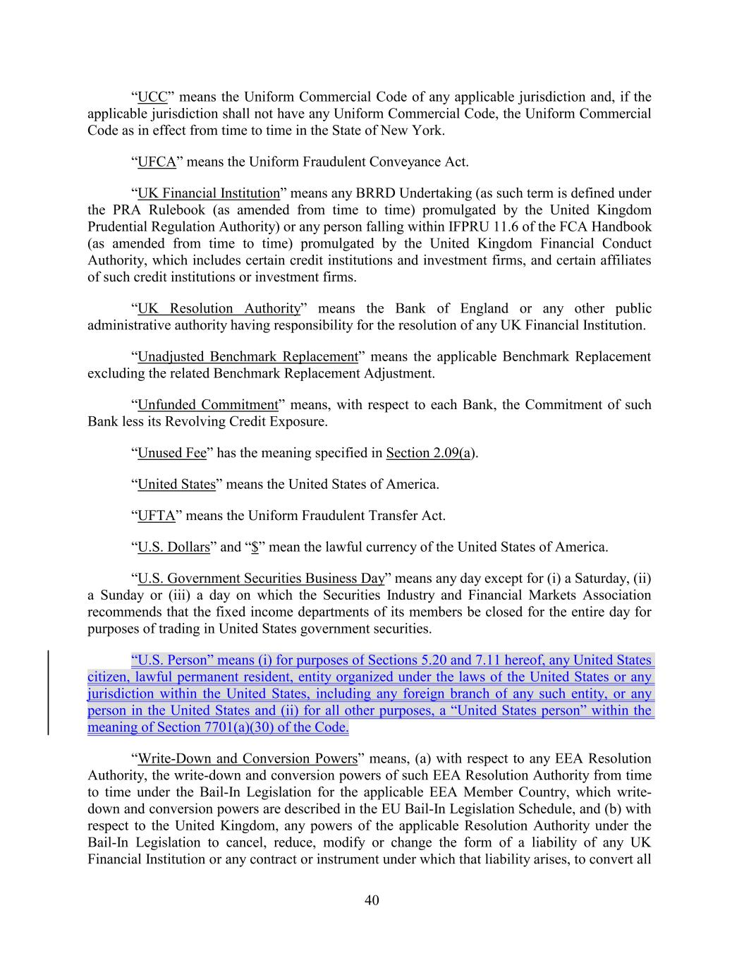 “UCC” means the Uniform Commercial Code of any applicable jurisdiction and, if the applicable jurisdiction shall not have any Uniform Commercial Code, the Uniform Commercial Code as in effect from time to time in the State of New York. “UFCA” means the Uniform Fraudulent Conveyance Act. “UK Financial Institution” means any BRRD Undertaking (as such term is defined under the PRA Rulebook (as amended from time to time) promulgated by the United Kingdom Prudential Regulation Authority) or any person falling within IFPRU 11.6 of the FCA Handbook (as amended from time to time) promulgated by the United Kingdom Financial Conduct Authority, which includes certain credit institutions and investment firms, and certain affiliates of such credit institutions or investment firms. “UK Resolution Authority” means the Bank of England or any other public administrative authority having responsibility for the resolution of any UK Financial Institution. “Unadjusted Benchmark Replacement” means the applicable Benchmark Replacement excluding the related Benchmark Replacement Adjustment. “Unfunded Commitment” means, with respect to each Bank, the Commitment of such Bank less its Revolving Credit Exposure. “Unused Fee” has the meaning specified in Section 2.09(a). “United States” means the United States of America. “UFTA” means the Uniform Fraudulent Transfer Act. “U.S. Dollars” and “$” mean the lawful currency of the United States of America. “U.S. Government Securities Business Day” means any day except for (i) a Saturday, (ii) a Sunday or (iii) a day on which the Securities Industry and Financial Markets Association recommends that the fixed income departments of its members be closed for the entire day for purposes of trading in United States government securities. “U.S. Person” means (i) for purposes of Sections 5.20 and 7.11 hereof, any United States citizen, lawful permanent resident, entity organized under the laws of the United States or any jurisdiction within the United States, including any foreign branch of any such entity, or any person in the United States and (ii) for all other purposes, a “United States person” within the meaning of Section 7701(a)(30) of the Code. “Write-Down and Conversion Powers” means, (a) with respect to any EEA Resolution Authority, the write-down and conversion powers of such EEA Resolution Authority from time to time under the Bail-In Legislation for the applicable EEA Member Country, which write- down and conversion powers are described in the EU Bail-In Legislation Schedule, and (b) with respect to the United Kingdom, any powers of the applicable Resolution Authority under the Bail-In Legislation to cancel, reduce, modify or change the form of a liability of any UK Financial Institution or any contract or instrument under which that liability arises, to convert all 40