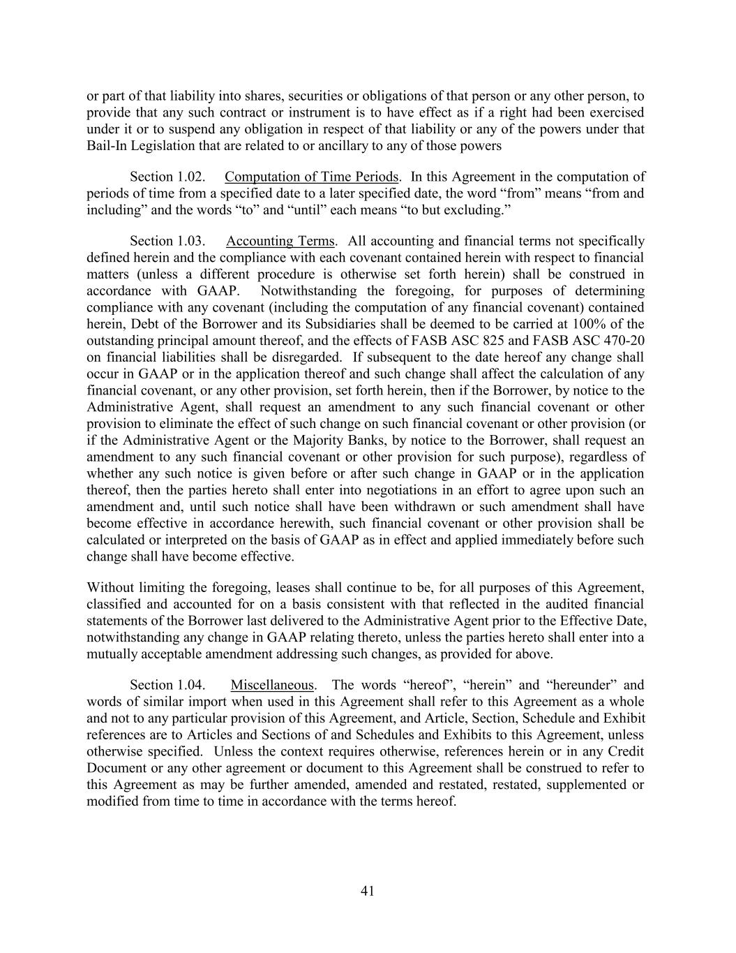 or part of that liability into shares, securities or obligations of that person or any other person, to provide that any such contract or instrument is to have effect as if a right had been exercised under it or to suspend any obligation in respect of that liability or any of the powers under that Bail-In Legislation that are related to or ancillary to any of those powers Section 1.02. Computation of Time Periods. In this Agreement in the computation of periods of time from a specified date to a later specified date, the word “from” means “from and including” and the words “to” and “until” each means “to but excluding.” Section 1.03. Accounting Terms. All accounting and financial terms not specifically defined herein and the compliance with each covenant contained herein with respect to financial matters (unless a different procedure is otherwise set forth herein) shall be construed in accordance with GAAP. Notwithstanding the foregoing, for purposes of determining compliance with any covenant (including the computation of any financial covenant) contained herein, Debt of the Borrower and its Subsidiaries shall be deemed to be carried at 100% of the outstanding principal amount thereof, and the effects of FASB ASC 825 and FASB ASC 470-20 on financial liabilities shall be disregarded. If subsequent to the date hereof any change shall occur in GAAP or in the application thereof and such change shall affect the calculation of any financial covenant, or any other provision, set forth herein, then if the Borrower, by notice to the Administrative Agent, shall request an amendment to any such financial covenant or other provision to eliminate the effect of such change on such financial covenant or other provision (or if the Administrative Agent or the Majority Banks, by notice to the Borrower, shall request an amendment to any such financial covenant or other provision for such purpose), regardless of whether any such notice is given before or after such change in GAAP or in the application thereof, then the parties hereto shall enter into negotiations in an effort to agree upon such an amendment and, until such notice shall have been withdrawn or such amendment shall have become effective in accordance herewith, such financial covenant or other provision shall be calculated or interpreted on the basis of GAAP as in effect and applied immediately before such change shall have become effective. Without limiting the foregoing, leases shall continue to be, for all purposes of this Agreement, classified and accounted for on a basis consistent with that reflected in the audited financial statements of the Borrower last delivered to the Administrative Agent prior to the Effective Date, notwithstanding any change in GAAP relating thereto, unless the parties hereto shall enter into a mutually acceptable amendment addressing such changes, as provided for above. Section 1.04. Miscellaneous. The words “hereof”, “herein” and “hereunder” and words of similar import when used in this Agreement shall refer to this Agreement as a whole and not to any particular provision of this Agreement, and Article, Section, Schedule and Exhibit references are to Articles and Sections of and Schedules and Exhibits to this Agreement, unless otherwise specified. Unless the context requires otherwise, references herein or in any Credit Document or any other agreement or document to this Agreement shall be construed to refer to this Agreement as may be further amended, amended and restated, restated, supplemented or modified from time to time in accordance with the terms hereof. 41
