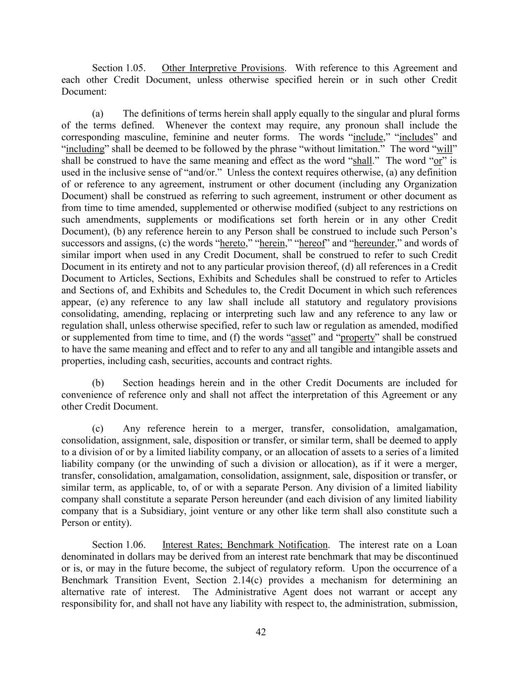 Section 1.05. Other Interpretive Provisions. With reference to this Agreement and each other Credit Document, unless otherwise specified herein or in such other Credit Document: (a) The definitions of terms herein shall apply equally to the singular and plural forms of the terms defined. Whenever the context may require, any pronoun shall include the corresponding masculine, feminine and neuter forms. The words “include,” “includes” and “including” shall be deemed to be followed by the phrase “without limitation.” The word “will” shall be construed to have the same meaning and effect as the word “shall.” The word “or” is used in the inclusive sense of “and/or.” Unless the context requires otherwise, (a) any definition of or reference to any agreement, instrument or other document (including any Organization Document) shall be construed as referring to such agreement, instrument or other document as from time to time amended, supplemented or otherwise modified (subject to any restrictions on such amendments, supplements or modifications set forth herein or in any other Credit Document), (b) any reference herein to any Person shall be construed to include such Person’s successors and assigns, (c) the words “hereto,” “herein,” “hereof” and “hereunder,” and words of similar import when used in any Credit Document, shall be construed to refer to such Credit Document in its entirety and not to any particular provision thereof, (d) all references in a Credit Document to Articles, Sections, Exhibits and Schedules shall be construed to refer to Articles and Sections of, and Exhibits and Schedules to, the Credit Document in which such references appear, (e) any reference to any law shall include all statutory and regulatory provisions consolidating, amending, replacing or interpreting such law and any reference to any law or regulation shall, unless otherwise specified, refer to such law or regulation as amended, modified or supplemented from time to time, and (f) the words “asset” and “property” shall be construed to have the same meaning and effect and to refer to any and all tangible and intangible assets and properties, including cash, securities, accounts and contract rights. (b) Section headings herein and in the other Credit Documents are included for convenience of reference only and shall not affect the interpretation of this Agreement or any other Credit Document. (c) Any reference herein to a merger, transfer, consolidation, amalgamation, consolidation, assignment, sale, disposition or transfer, or similar term, shall be deemed to apply to a division of or by a limited liability company, or an allocation of assets to a series of a limited liability company (or the unwinding of such a division or allocation), as if it were a merger, transfer, consolidation, amalgamation, consolidation, assignment, sale, disposition or transfer, or similar term, as applicable, to, of or with a separate Person. Any division of a limited liability company shall constitute a separate Person hereunder (and each division of any limited liability company that is a Subsidiary, joint venture or any other like term shall also constitute such a Person or entity). Section 1.06. Interest Rates; Benchmark Notification. The interest rate on a Loan denominated in dollars may be derived from an interest rate benchmark that may be discontinued or is, or may in the future become, the subject of regulatory reform. Upon the occurrence of a Benchmark Transition Event, Section 2.14(c) provides a mechanism for determining an alternative rate of interest. The Administrative Agent does not warrant or accept any responsibility for, and shall not have any liability with respect to, the administration, submission, 42