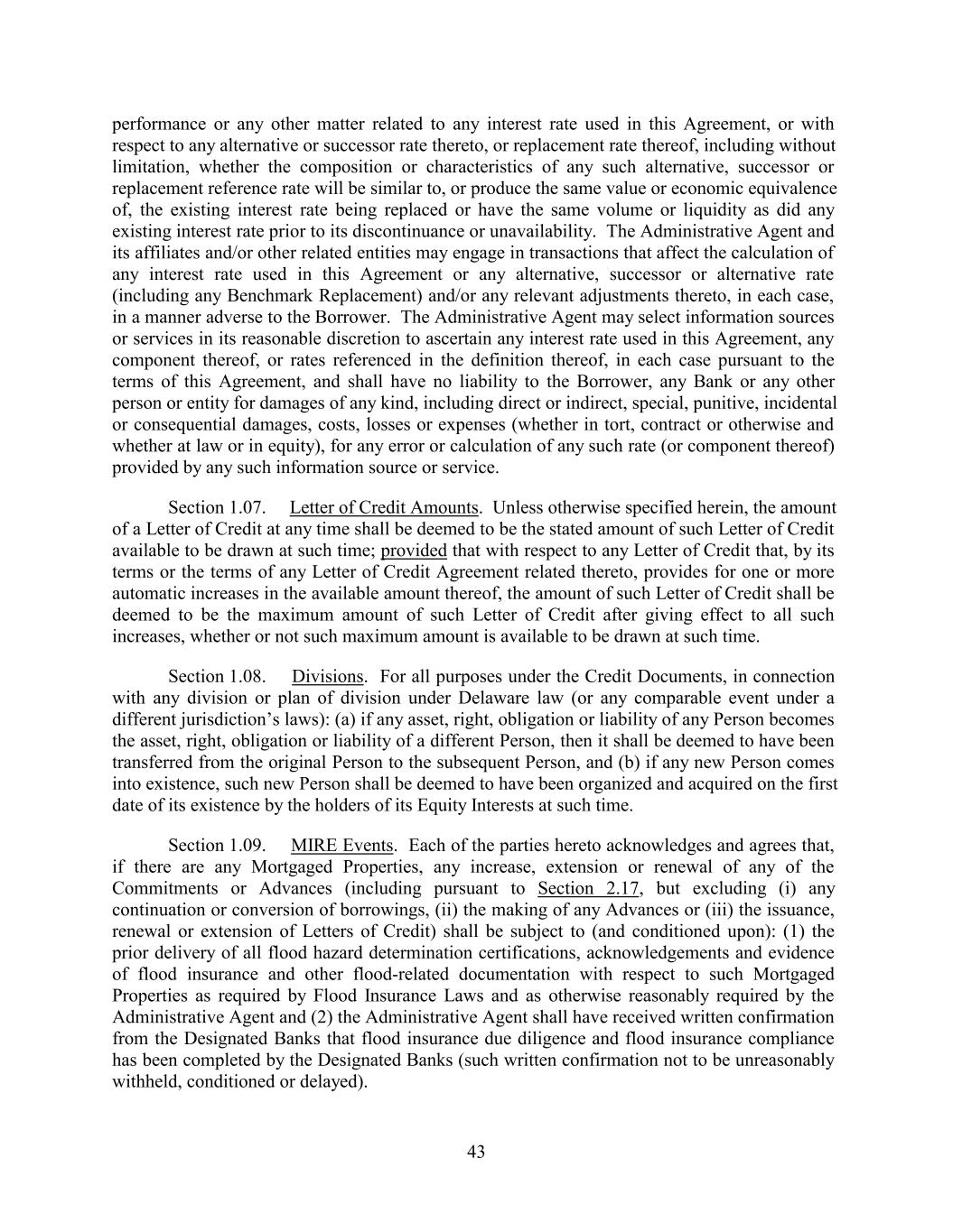 performance or any other matter related to any interest rate used in this Agreement, or with respect to any alternative or successor rate thereto, or replacement rate thereof, including without limitation, whether the composition or characteristics of any such alternative, successor or replacement reference rate will be similar to, or produce the same value or economic equivalence of, the existing interest rate being replaced or have the same volume or liquidity as did any existing interest rate prior to its discontinuance or unavailability. The Administrative Agent and its affiliates and/or other related entities may engage in transactions that affect the calculation of any interest rate used in this Agreement or any alternative, successor or alternative rate (including any Benchmark Replacement) and/or any relevant adjustments thereto, in each case, in a manner adverse to the Borrower. The Administrative Agent may select information sources or services in its reasonable discretion to ascertain any interest rate used in this Agreement, any component thereof, or rates referenced in the definition thereof, in each case pursuant to the terms of this Agreement, and shall have no liability to the Borrower, any Bank or any other person or entity for damages of any kind, including direct or indirect, special, punitive, incidental or consequential damages, costs, losses or expenses (whether in tort, contract or otherwise and whether at law or in equity), for any error or calculation of any such rate (or component thereof) provided by any such information source or service. Section 1.07. Letter of Credit Amounts. Unless otherwise specified herein, the amount of a Letter of Credit at any time shall be deemed to be the stated amount of such Letter of Credit available to be drawn at such time; provided that with respect to any Letter of Credit that, by its terms or the terms of any Letter of Credit Agreement related thereto, provides for one or more automatic increases in the available amount thereof, the amount of such Letter of Credit shall be deemed to be the maximum amount of such Letter of Credit after giving effect to all such increases, whether or not such maximum amount is available to be drawn at such time. Section 1.08. Divisions. For all purposes under the Credit Documents, in connection with any division or plan of division under Delaware law (or any comparable event under a different jurisdiction’s laws): (a) if any asset, right, obligation or liability of any Person becomes the asset, right, obligation or liability of a different Person, then it shall be deemed to have been transferred from the original Person to the subsequent Person, and (b) if any new Person comes into existence, such new Person shall be deemed to have been organized and acquired on the first date of its existence by the holders of its Equity Interests at such time. Section 1.09. MIRE Events. Each of the parties hereto acknowledges and agrees that, if there are any Mortgaged Properties, any increase, extension or renewal of any of the Commitments or Advances (including pursuant to Section 2.17, but excluding (i) any continuation or conversion of borrowings, (ii) the making of any Advances or (iii) the issuance, renewal or extension of Letters of Credit) shall be subject to (and conditioned upon): (1) the prior delivery of all flood hazard determination certifications, acknowledgements and evidence of flood insurance and other flood-related documentation with respect to such Mortgaged Properties as required by Flood Insurance Laws and as otherwise reasonably required by the Administrative Agent and (2) the Administrative Agent shall have received written confirmation from the Designated Banks that flood insurance due diligence and flood insurance compliance has been completed by the Designated Banks (such written confirmation not to be unreasonably withheld, conditioned or delayed). 43