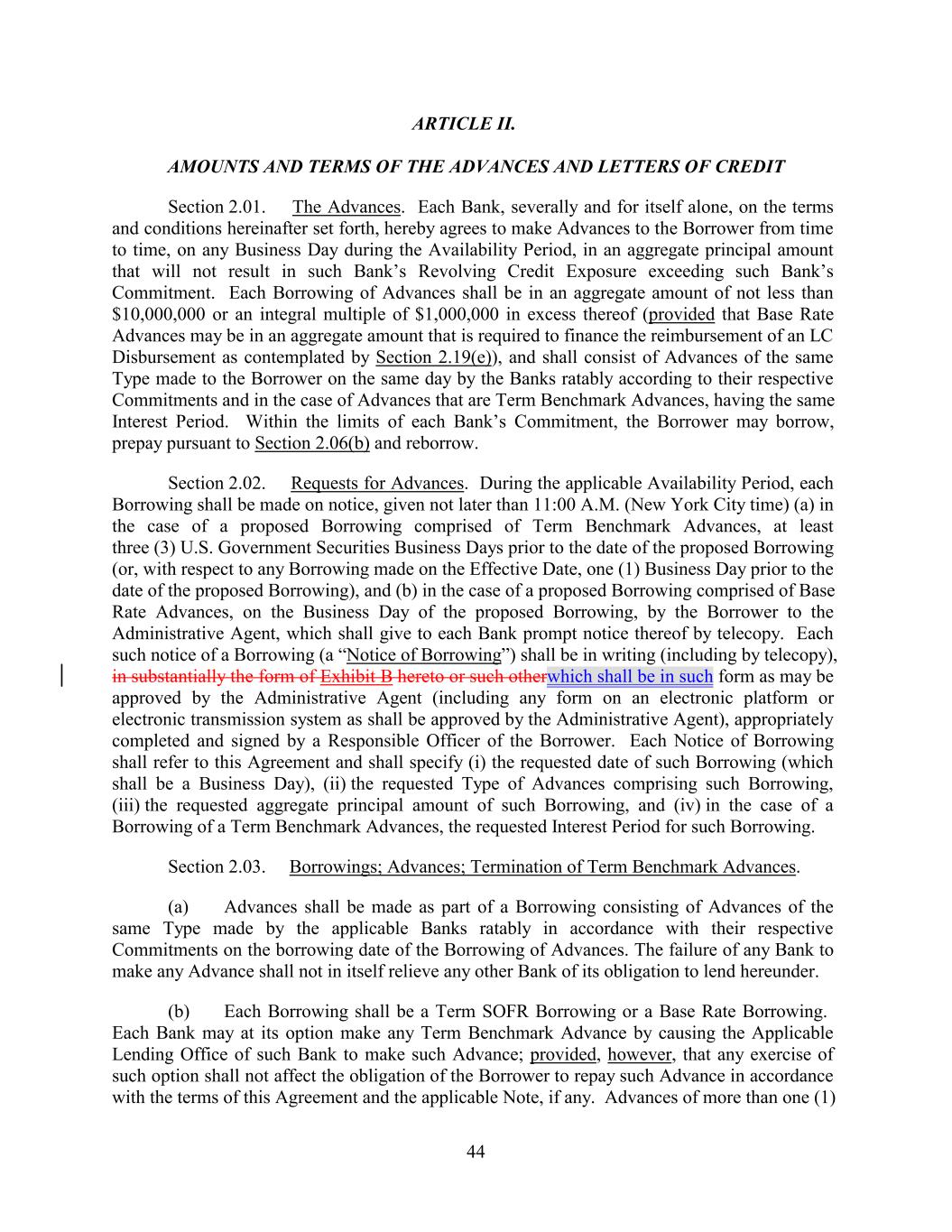 ARTICLE II. AMOUNTS AND TERMS OF THE ADVANCES AND LETTERS OF CREDIT Section 2.01. The Advances. Each Bank, severally and for itself alone, on the terms and conditions hereinafter set forth, hereby agrees to make Advances to the Borrower from time to time, on any Business Day during the Availability Period, in an aggregate principal amount that will not result in such Bank’s Revolving Credit Exposure exceeding such Bank’s Commitment. Each Borrowing of Advances shall be in an aggregate amount of not less than $10,000,000 or an integral multiple of $1,000,000 in excess thereof (provided that Base Rate Advances may be in an aggregate amount that is required to finance the reimbursement of an LC Disbursement as contemplated by Section 2.19(e)), and shall consist of Advances of the same Type made to the Borrower on the same day by the Banks ratably according to their respective Commitments and in the case of Advances that are Term Benchmark Advances, having the same Interest Period. Within the limits of each Bank’s Commitment, the Borrower may borrow, prepay pursuant to Section 2.06(b) and reborrow. Section 2.02. Requests for Advances. During the applicable Availability Period, each Borrowing shall be made on notice, given not later than 11:00 A.M. (New York City time) (a) in the case of a proposed Borrowing comprised of Term Benchmark Advances, at least three (3) U.S. Government Securities Business Days prior to the date of the proposed Borrowing (or, with respect to any Borrowing made on the Effective Date, one (1) Business Day prior to the date of the proposed Borrowing), and (b) in the case of a proposed Borrowing comprised of Base Rate Advances, on the Business Day of the proposed Borrowing, by the Borrower to the Administrative Agent, which shall give to each Bank prompt notice thereof by telecopy. Each such notice of a Borrowing (a “Notice of Borrowing”) shall be in writing (including by telecopy), in substantially the form of Exhibit B hereto or such otherwhich shall be in such form as may be approved by the Administrative Agent (including any form on an electronic platform or electronic transmission system as shall be approved by the Administrative Agent), appropriately completed and signed by a Responsible Officer of the Borrower. Each Notice of Borrowing shall refer to this Agreement and shall specify (i) the requested date of such Borrowing (which shall be a Business Day), (ii) the requested Type of Advances comprising such Borrowing, (iii) the requested aggregate principal amount of such Borrowing, and (iv) in the case of a Borrowing of a Term Benchmark Advances, the requested Interest Period for such Borrowing. Section 2.03. Borrowings; Advances; Termination of Term Benchmark Advances. (a) Advances shall be made as part of a Borrowing consisting of Advances of the same Type made by the applicable Banks ratably in accordance with their respective Commitments on the borrowing date of the Borrowing of Advances. The failure of any Bank to make any Advance shall not in itself relieve any other Bank of its obligation to lend hereunder. (b) Each Borrowing shall be a Term SOFR Borrowing or a Base Rate Borrowing. Each Bank may at its option make any Term Benchmark Advance by causing the Applicable Lending Office of such Bank to make such Advance; provided, however, that any exercise of such option shall not affect the obligation of the Borrower to repay such Advance in accordance with the terms of this Agreement and the applicable Note, if any. Advances of more than one (1) 44