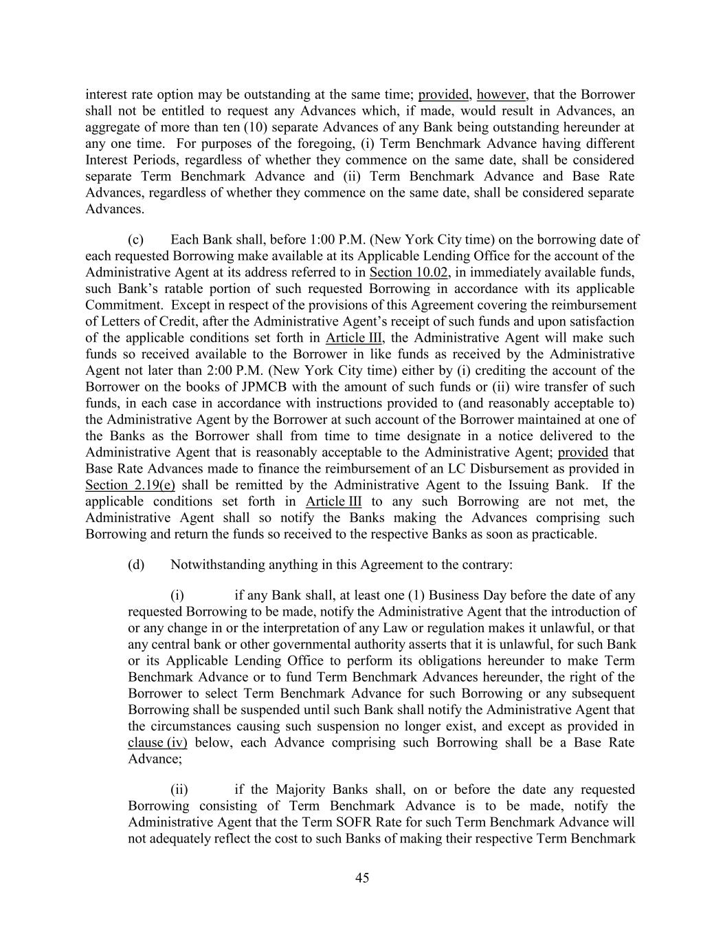 interest rate option may be outstanding at the same time; provided, however, that the Borrower shall not be entitled to request any Advances which, if made, would result in Advances, an aggregate of more than ten (10) separate Advances of any Bank being outstanding hereunder at any one time. For purposes of the foregoing, (i) Term Benchmark Advance having different Interest Periods, regardless of whether they commence on the same date, shall be considered separate Term Benchmark Advance and (ii) Term Benchmark Advance and Base Rate Advances, regardless of whether they commence on the same date, shall be considered separate Advances. (c) Each Bank shall, before 1:00 P.M. (New York City time) on the borrowing date of each requested Borrowing make available at its Applicable Lending Office for the account of the Administrative Agent at its address referred to in Section 10.02, in immediately available funds, such Bank’s ratable portion of such requested Borrowing in accordance with its applicable Commitment. Except in respect of the provisions of this Agreement covering the reimbursement of Letters of Credit, after the Administrative Agent’s receipt of such funds and upon satisfaction of the applicable conditions set forth in Article III, the Administrative Agent will make such funds so received available to the Borrower in like funds as received by the Administrative Agent not later than 2:00 P.M. (New York City time) either by (i) crediting the account of the Borrower on the books of JPMCB with the amount of such funds or (ii) wire transfer of such funds, in each case in accordance with instructions provided to (and reasonably acceptable to) the Administrative Agent by the Borrower at such account of the Borrower maintained at one of the Banks as the Borrower shall from time to time designate in a notice delivered to the Administrative Agent that is reasonably acceptable to the Administrative Agent; provided that Base Rate Advances made to finance the reimbursement of an LC Disbursement as provided in Section 2.19(e) shall be remitted by the Administrative Agent to the Issuing Bank. If the applicable conditions set forth in Article III to any such Borrowing are not met, the Administrative Agent shall so notify the Banks making the Advances comprising such Borrowing and return the funds so received to the respective Banks as soon as practicable. (d) Notwithstanding anything in this Agreement to the contrary: (i) if any Bank shall, at least one (1) Business Day before the date of any requested Borrowing to be made, notify the Administrative Agent that the introduction of or any change in or the interpretation of any Law or regulation makes it unlawful, or that any central bank or other governmental authority asserts that it is unlawful, for such Bank or its Applicable Lending Office to perform its obligations hereunder to make Term Benchmark Advance or to fund Term Benchmark Advances hereunder, the right of the Borrower to select Term Benchmark Advance for such Borrowing or any subsequent Borrowing shall be suspended until such Bank shall notify the Administrative Agent that the circumstances causing such suspension no longer exist, and except as provided in clause (iv) below, each Advance comprising such Borrowing shall be a Base Rate Advance; (ii) if the Majority Banks shall, on or before the date any requested Borrowing consisting of Term Benchmark Advance is to be made, notify the Administrative Agent that the Term SOFR Rate for such Term Benchmark Advance will not adequately reflect the cost to such Banks of making their respective Term Benchmark 45