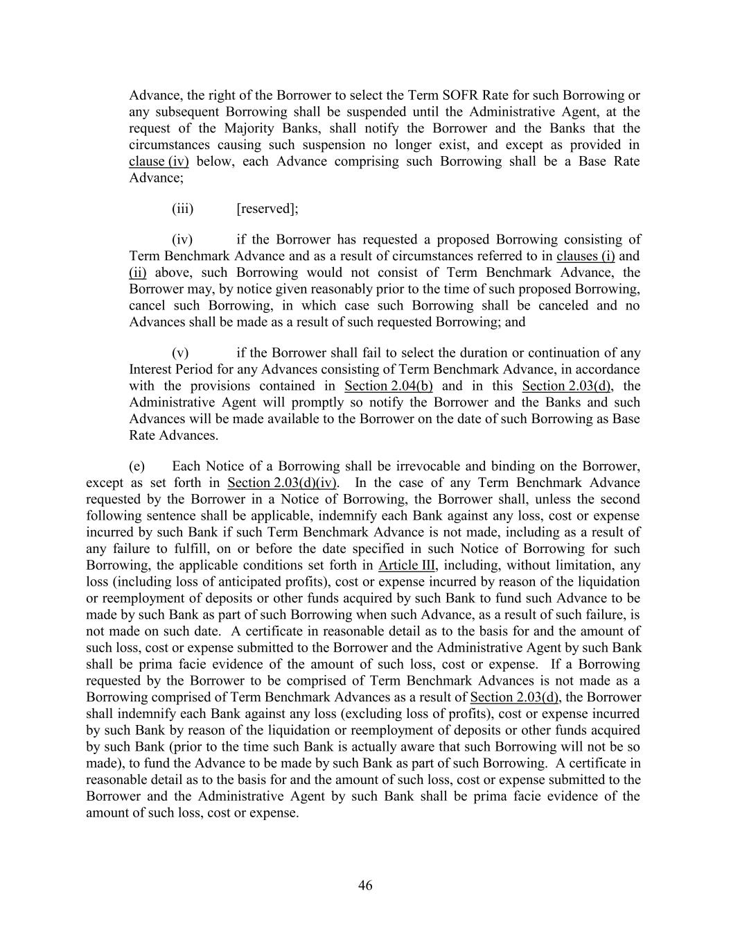 Advance, the right of the Borrower to select the Term SOFR Rate for such Borrowing or any subsequent Borrowing shall be suspended until the Administrative Agent, at the request of the Majority Banks, shall notify the Borrower and the Banks that the circumstances causing such suspension no longer exist, and except as provided in clause (iv) below, each Advance comprising such Borrowing shall be a Base Rate Advance; (iii) [reserved]; (iv) if the Borrower has requested a proposed Borrowing consisting of Term Benchmark Advance and as a result of circumstances referred to in clauses (i) and (ii) above, such Borrowing would not consist of Term Benchmark Advance, the Borrower may, by notice given reasonably prior to the time of such proposed Borrowing, cancel such Borrowing, in which case such Borrowing shall be canceled and no Advances shall be made as a result of such requested Borrowing; and (v) if the Borrower shall fail to select the duration or continuation of any Interest Period for any Advances consisting of Term Benchmark Advance, in accordance with the provisions contained in Section 2.04(b) and in this Section 2.03(d), the Administrative Agent will promptly so notify the Borrower and the Banks and such Advances will be made available to the Borrower on the date of such Borrowing as Base Rate Advances. (e) Each Notice of a Borrowing shall be irrevocable and binding on the Borrower, except as set forth in Section 2.03(d)(iv). In the case of any Term Benchmark Advance requested by the Borrower in a Notice of Borrowing, the Borrower shall, unless the second following sentence shall be applicable, indemnify each Bank against any loss, cost or expense incurred by such Bank if such Term Benchmark Advance is not made, including as a result of any failure to fulfill, on or before the date specified in such Notice of Borrowing for such Borrowing, the applicable conditions set forth in Article III, including, without limitation, any loss (including loss of anticipated profits), cost or expense incurred by reason of the liquidation or reemployment of deposits or other funds acquired by such Bank to fund such Advance to be made by such Bank as part of such Borrowing when such Advance, as a result of such failure, is not made on such date. A certificate in reasonable detail as to the basis for and the amount of such loss, cost or expense submitted to the Borrower and the Administrative Agent by such Bank shall be prima facie evidence of the amount of such loss, cost or expense. If a Borrowing requested by the Borrower to be comprised of Term Benchmark Advances is not made as a Borrowing comprised of Term Benchmark Advances as a result of Section 2.03(d), the Borrower shall indemnify each Bank against any loss (excluding loss of profits), cost or expense incurred by such Bank by reason of the liquidation or reemployment of deposits or other funds acquired by such Bank (prior to the time such Bank is actually aware that such Borrowing will not be so made), to fund the Advance to be made by such Bank as part of such Borrowing. A certificate in reasonable detail as to the basis for and the amount of such loss, cost or expense submitted to the Borrower and the Administrative Agent by such Bank shall be prima facie evidence of the amount of such loss, cost or expense. 46