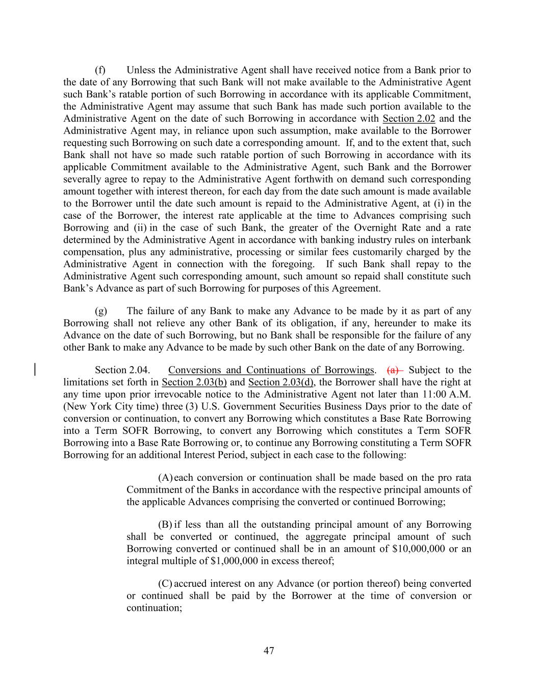(f) Unless the Administrative Agent shall have received notice from a Bank prior to the date of any Borrowing that such Bank will not make available to the Administrative Agent such Bank’s ratable portion of such Borrowing in accordance with its applicable Commitment, the Administrative Agent may assume that such Bank has made such portion available to the Administrative Agent on the date of such Borrowing in accordance with Section 2.02 and the Administrative Agent may, in reliance upon such assumption, make available to the Borrower requesting such Borrowing on such date a corresponding amount. If, and to the extent that, such Bank shall not have so made such ratable portion of such Borrowing in accordance with its applicable Commitment available to the Administrative Agent, such Bank and the Borrower severally agree to repay to the Administrative Agent forthwith on demand such corresponding amount together with interest thereon, for each day from the date such amount is made available to the Borrower until the date such amount is repaid to the Administrative Agent, at (i) in the case of the Borrower, the interest rate applicable at the time to Advances comprising such Borrowing and (ii) in the case of such Bank, the greater of the Overnight Rate and a rate determined by the Administrative Agent in accordance with banking industry rules on interbank compensation, plus any administrative, processing or similar fees customarily charged by the Administrative Agent in connection with the foregoing. If such Bank shall repay to the Administrative Agent such corresponding amount, such amount so repaid shall constitute such Bank’s Advance as part of such Borrowing for purposes of this Agreement. (g) The failure of any Bank to make any Advance to be made by it as part of any Borrowing shall not relieve any other Bank of its obligation, if any, hereunder to make its Advance on the date of such Borrowing, but no Bank shall be responsible for the failure of any other Bank to make any Advance to be made by such other Bank on the date of any Borrowing. Section 2.04. Conversions and Continuations of Borrowings. (a) Subject to the limitations set forth in Section 2.03(b) and Section 2.03(d), the Borrower shall have the right at any time upon prior irrevocable notice to the Administrative Agent not later than 11:00 A.M. (New York City time) three (3) U.S. Government Securities Business Days prior to the date of conversion or continuation, to convert any Borrowing which constitutes a Base Rate Borrowing into a Term SOFR Borrowing, to convert any Borrowing which constitutes a Term SOFR Borrowing into a Base Rate Borrowing or, to continue any Borrowing constituting a Term SOFR Borrowing for an additional Interest Period, subject in each case to the following: (A)each conversion or continuation shall be made based on the pro rata Commitment of the Banks in accordance with the respective principal amounts of the applicable Advances comprising the converted or continued Borrowing; (B) if less than all the outstanding principal amount of any Borrowing shall be converted or continued, the aggregate principal amount of such Borrowing converted or continued shall be in an amount of $10,000,000 or an integral multiple of $1,000,000 in excess thereof; (C) accrued interest on any Advance (or portion thereof) being converted or continued shall be paid by the Borrower at the time of conversion or continuation; 47