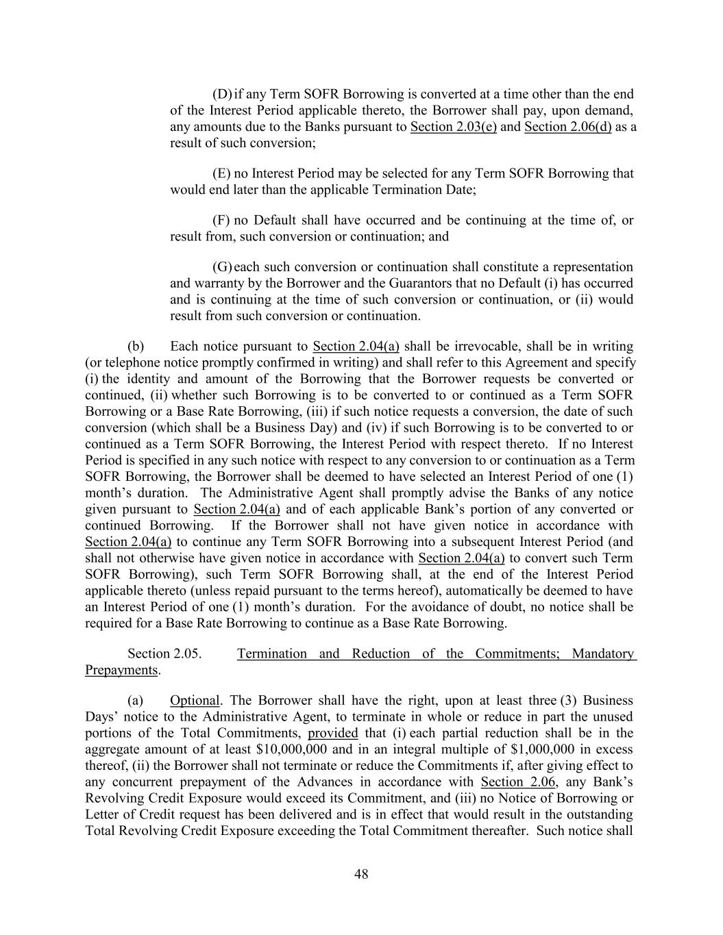 (D) if any Term SOFR Borrowing is converted at a time other than the end of the Interest Period applicable thereto, the Borrower shall pay, upon demand, any amounts due to the Banks pursuant to Section 2.03(e) and Section 2.06(d) as a result of such conversion; (E) no Interest Period may be selected for any Term SOFR Borrowing that would end later than the applicable Termination Date; (F) no Default shall have occurred and be continuing at the time of, or result from, such conversion or continuation; and (G)each such conversion or continuation shall constitute a representation and warranty by the Borrower and the Guarantors that no Default (i) has occurred and is continuing at the time of such conversion or continuation, or (ii) would result from such conversion or continuation. (b) Each notice pursuant to Section 2.04(a) shall be irrevocable, shall be in writing (or telephone notice promptly confirmed in writing) and shall refer to this Agreement and specify (i) the identity and amount of the Borrowing that the Borrower requests be converted or continued, (ii) whether such Borrowing is to be converted to or continued as a Term SOFR Borrowing or a Base Rate Borrowing, (iii) if such notice requests a conversion, the date of such conversion (which shall be a Business Day) and (iv) if such Borrowing is to be converted to or continued as a Term SOFR Borrowing, the Interest Period with respect thereto. If no Interest Period is specified in any such notice with respect to any conversion to or continuation as a Term SOFR Borrowing, the Borrower shall be deemed to have selected an Interest Period of one (1) month’s duration. The Administrative Agent shall promptly advise the Banks of any notice given pursuant to Section 2.04(a) and of each applicable Bank’s portion of any converted or continued Borrowing. If the Borrower shall not have given notice in accordance with Section 2.04(a) to continue any Term SOFR Borrowing into a subsequent Interest Period (and shall not otherwise have given notice in accordance with Section 2.04(a) to convert such Term SOFR Borrowing), such Term SOFR Borrowing shall, at the end of the Interest Period applicable thereto (unless repaid pursuant to the terms hereof), automatically be deemed to have an Interest Period of one (1) month’s duration. For the avoidance of doubt, no notice shall be required for a Base Rate Borrowing to continue as a Base Rate Borrowing. Section 2.05. Termination and Reduction of the Commitments; Mandatory Prepayments. (a) Optional. The Borrower shall have the right, upon at least three (3) Business Days’ notice to the Administrative Agent, to terminate in whole or reduce in part the unused portions of the Total Commitments, provided that (i) each partial reduction shall be in the aggregate amount of at least $10,000,000 and in an integral multiple of $1,000,000 in excess thereof, (ii) the Borrower shall not terminate or reduce the Commitments if, after giving effect to any concurrent prepayment of the Advances in accordance with Section 2.06, any Bank’s Revolving Credit Exposure would exceed its Commitment, and (iii) no Notice of Borrowing or Letter of Credit request has been delivered and is in effect that would result in the outstanding Total Revolving Credit Exposure exceeding the Total Commitment thereafter. Such notice shall 48
