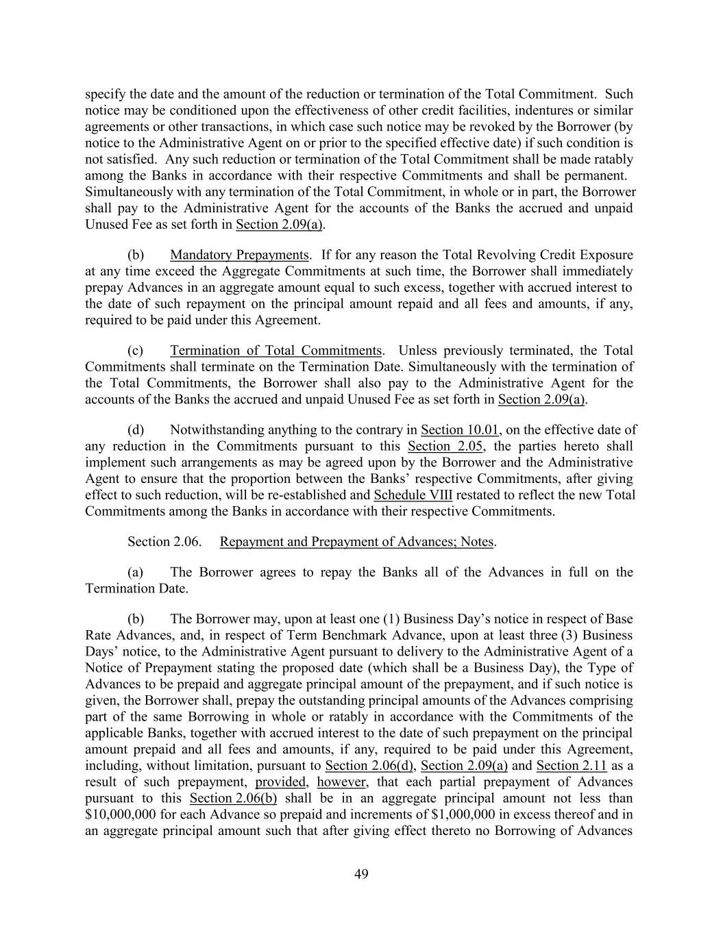 specify the date and the amount of the reduction or termination of the Total Commitment. Such notice may be conditioned upon the effectiveness of other credit facilities, indentures or similar agreements or other transactions, in which case such notice may be revoked by the Borrower (by notice to the Administrative Agent on or prior to the specified effective date) if such condition is not satisfied. Any such reduction or termination of the Total Commitment shall be made ratably among the Banks in accordance with their respective Commitments and shall be permanent. Simultaneously with any termination of the Total Commitment, in whole or in part, the Borrower shall pay to the Administrative Agent for the accounts of the Banks the accrued and unpaid Unused Fee as set forth in Section 2.09(a). (b) Mandatory Prepayments. If for any reason the Total Revolving Credit Exposure at any time exceed the Aggregate Commitments at such time, the Borrower shall immediately prepay Advances in an aggregate amount equal to such excess, together with accrued interest to the date of such repayment on the principal amount repaid and all fees and amounts, if any, required to be paid under this Agreement. (c) Termination of Total Commitments. Unless previously terminated, the Total Commitments shall terminate on the Termination Date. Simultaneously with the termination of the Total Commitments, the Borrower shall also pay to the Administrative Agent for the accounts of the Banks the accrued and unpaid Unused Fee as set forth in Section 2.09(a). (d) Notwithstanding anything to the contrary in Section 10.01, on the effective date of any reduction in the Commitments pursuant to this Section 2.05, the parties hereto shall implement such arrangements as may be agreed upon by the Borrower and the Administrative Agent to ensure that the proportion between the Banks’ respective Commitments, after giving effect to such reduction, will be re-established and Schedule VIII restated to reflect the new Total Commitments among the Banks in accordance with their respective Commitments. Section 2.06. Repayment and Prepayment of Advances; Notes. (a) The Borrower agrees to repay the Banks all of the Advances in full on the Termination Date. (b) The Borrower may, upon at least one (1) Business Day’s notice in respect of Base Rate Advances, and, in respect of Term Benchmark Advance, upon at least three (3) Business Days’ notice, to the Administrative Agent pursuant to delivery to the Administrative Agent of a Notice of Prepayment stating the proposed date (which shall be a Business Day), the Type of Advances to be prepaid and aggregate principal amount of the prepayment, and if such notice is given, the Borrower shall, prepay the outstanding principal amounts of the Advances comprising part of the same Borrowing in whole or ratably in accordance with the Commitments of the applicable Banks, together with accrued interest to the date of such prepayment on the principal amount prepaid and all fees and amounts, if any, required to be paid under this Agreement, including, without limitation, pursuant to Section 2.06(d), Section 2.09(a) and Section 2.11 as a result of such prepayment, provided, however, that each partial prepayment of Advances pursuant to this Section 2.06(b) shall be in an aggregate principal amount not less than $10,000,000 for each Advance so prepaid and increments of $1,000,000 in excess thereof and in an aggregate principal amount such that after giving effect thereto no Borrowing of Advances 49