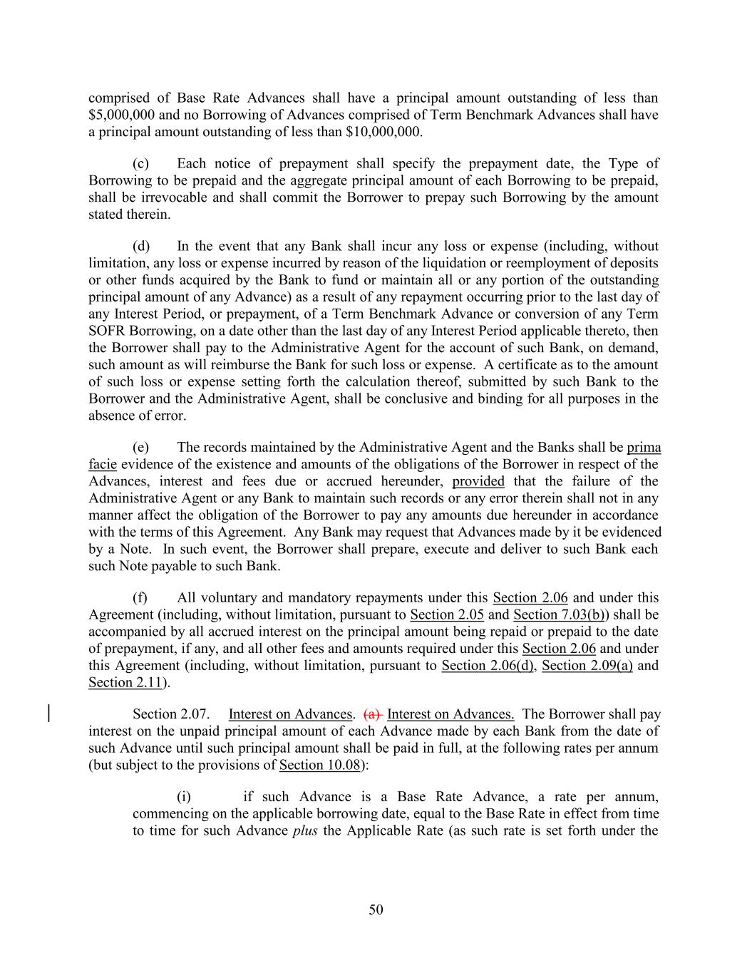 comprised of Base Rate Advances shall have a principal amount outstanding of less than $5,000,000 and no Borrowing of Advances comprised of Term Benchmark Advances shall have a principal amount outstanding of less than $10,000,000. (c) Each notice of prepayment shall specify the prepayment date, the Type of Borrowing to be prepaid and the aggregate principal amount of each Borrowing to be prepaid, shall be irrevocable and shall commit the Borrower to prepay such Borrowing by the amount stated therein. (d) In the event that any Bank shall incur any loss or expense (including, without limitation, any loss or expense incurred by reason of the liquidation or reemployment of deposits or other funds acquired by the Bank to fund or maintain all or any portion of the outstanding principal amount of any Advance) as a result of any repayment occurring prior to the last day of any Interest Period, or prepayment, of a Term Benchmark Advance or conversion of any Term SOFR Borrowing, on a date other than the last day of any Interest Period applicable thereto, then the Borrower shall pay to the Administrative Agent for the account of such Bank, on demand, such amount as will reimburse the Bank for such loss or expense. A certificate as to the amount of such loss or expense setting forth the calculation thereof, submitted by such Bank to the Borrower and the Administrative Agent, shall be conclusive and binding for all purposes in the absence of error. (e) The records maintained by the Administrative Agent and the Banks shall be prima facie evidence of the existence and amounts of the obligations of the Borrower in respect of the Advances, interest and fees due or accrued hereunder, provided that the failure of the Administrative Agent or any Bank to maintain such records or any error therein shall not in any manner affect the obligation of the Borrower to pay any amounts due hereunder in accordance with the terms of this Agreement. Any Bank may request that Advances made by it be evidenced by a Note. In such event, the Borrower shall prepare, execute and deliver to such Bank each such Note payable to such Bank. (f) All voluntary and mandatory repayments under this Section 2.06 and under this Agreement (including, without limitation, pursuant to Section 2.05 and Section 7.03(b)) shall be accompanied by all accrued interest on the principal amount being repaid or prepaid to the date of prepayment, if any, and all other fees and amounts required under this Section 2.06 and under this Agreement (including, without limitation, pursuant to Section 2.06(d), Section 2.09(a) and Section 2.11). Section 2.07. Interest on Advances. (a) Interest on Advances. The Borrower shall pay interest on the unpaid principal amount of each Advance made by each Bank from the date of such Advance until such principal amount shall be paid in full, at the following rates per annum (but subject to the provisions of Section 10.08): (i) if such Advance is a Base Rate Advance, a rate per annum, commencing on the applicable borrowing date, equal to the Base Rate in effect from time to time for such Advance plus the Applicable Rate (as such rate is set forth under the 50