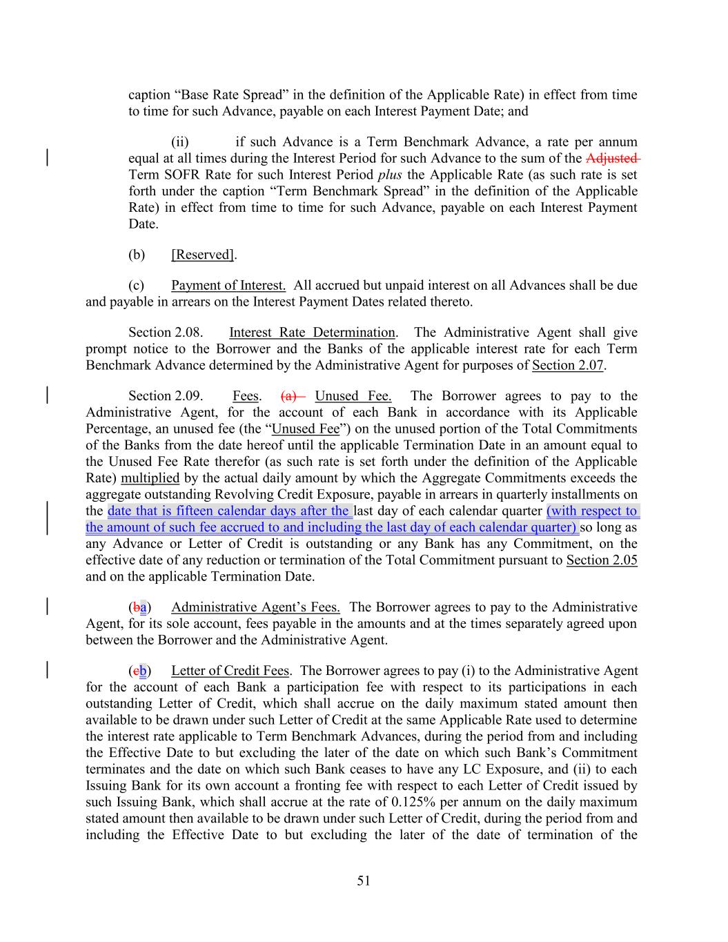 caption “Base Rate Spread” in the definition of the Applicable Rate) in effect from time to time for such Advance, payable on each Interest Payment Date; and (ii) if such Advance is a Term Benchmark Advance, a rate per annum equal at all times during the Interest Period for such Advance to the sum of the Adjusted Term SOFR Rate for such Interest Period plus the Applicable Rate (as such rate is set forth under the caption “Term Benchmark Spread” in the definition of the Applicable Rate) in effect from time to time for such Advance, payable on each Interest Payment Date. (b) [Reserved]. (c) Payment of Interest. All accrued but unpaid interest on all Advances shall be due and payable in arrears on the Interest Payment Dates related thereto. Section 2.08. Interest Rate Determination. The Administrative Agent shall give prompt notice to the Borrower and the Banks of the applicable interest rate for each Term Benchmark Advance determined by the Administrative Agent for purposes of Section 2.07. Section 2.09. Fees. (a) Unused Fee. The Borrower agrees to pay to the Administrative Agent, for the account of each Bank in accordance with its Applicable Percentage, an unused fee (the “Unused Fee”) on the unused portion of the Total Commitments of the Banks from the date hereof until the applicable Termination Date in an amount equal to the Unused Fee Rate therefor (as such rate is set forth under the definition of the Applicable Rate) multiplied by the actual daily amount by which the Aggregate Commitments exceeds the aggregate outstanding Revolving Credit Exposure, payable in arrears in quarterly installments on the date that is fifteen calendar days after the last day of each calendar quarter (with respect to the amount of such fee accrued to and including the last day of each calendar quarter) so long as any Advance or Letter of Credit is outstanding or any Bank has any Commitment, on the effective date of any reduction or termination of the Total Commitment pursuant to Section 2.05 and on the applicable Termination Date. (ba) Administrative Agent’s Fees. The Borrower agrees to pay to the Administrative Agent, for its sole account, fees payable in the amounts and at the times separately agreed upon between the Borrower and the Administrative Agent. (cb) Letter of Credit Fees. The Borrower agrees to pay (i) to the Administrative Agent for the account of each Bank a participation fee with respect to its participations in each outstanding Letter of Credit, which shall accrue on the daily maximum stated amount then available to be drawn under such Letter of Credit at the same Applicable Rate used to determine the interest rate applicable to Term Benchmark Advances, during the period from and including the Effective Date to but excluding the later of the date on which such Bank’s Commitment terminates and the date on which such Bank ceases to have any LC Exposure, and (ii) to each Issuing Bank for its own account a fronting fee with respect to each Letter of Credit issued by such Issuing Bank, which shall accrue at the rate of 0.125% per annum on the daily maximum stated amount then available to be drawn under such Letter of Credit, during the period from and including the Effective Date to but excluding the later of the date of termination of the 51