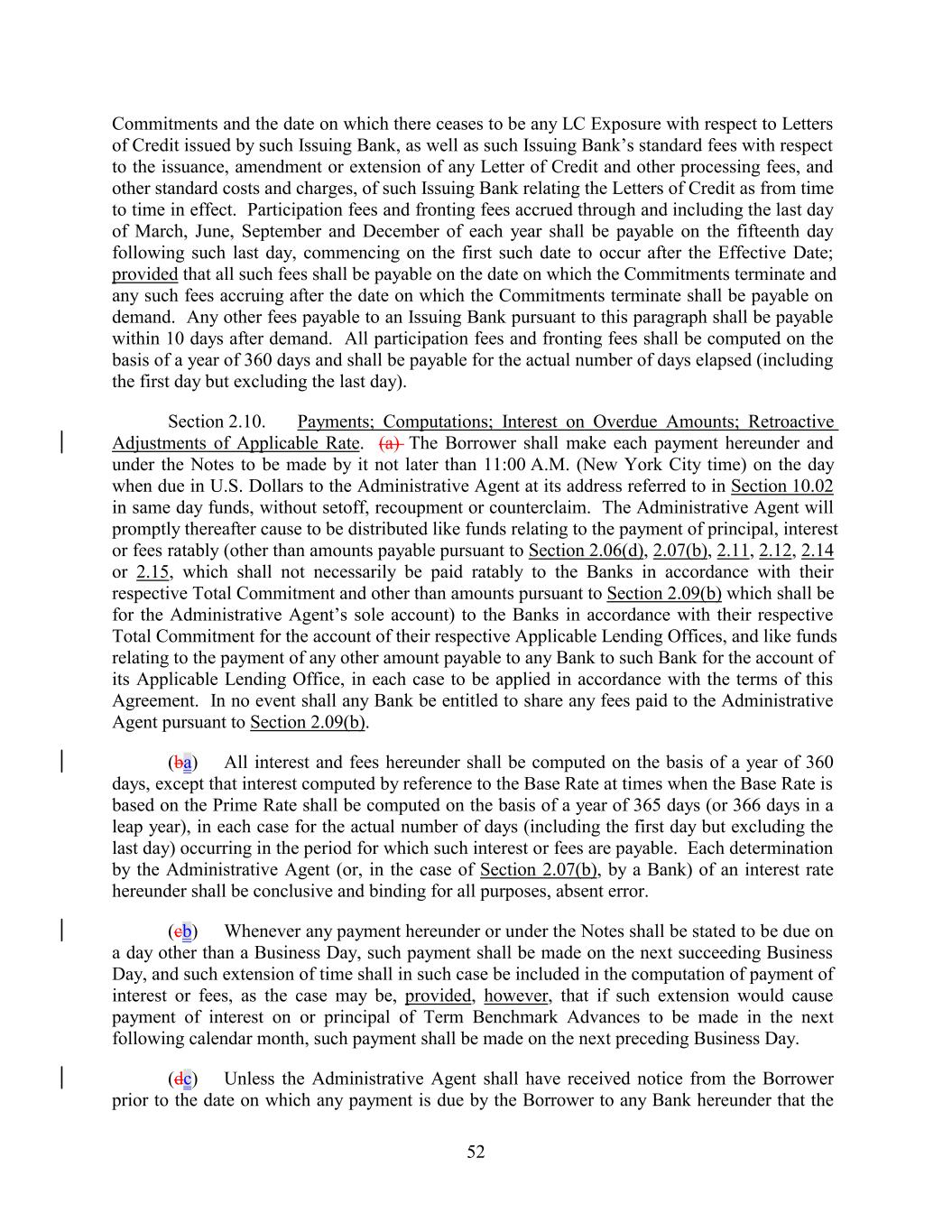 Commitments and the date on which there ceases to be any LC Exposure with respect to Letters of Credit issued by such Issuing Bank, as well as such Issuing Bank’s standard fees with respect to the issuance, amendment or extension of any Letter of Credit and other processing fees, and other standard costs and charges, of such Issuing Bank relating the Letters of Credit as from time to time in effect. Participation fees and fronting fees accrued through and including the last day of March, June, September and December of each year shall be payable on the fifteenth day following such last day, commencing on the first such date to occur after the Effective Date; provided that all such fees shall be payable on the date on which the Commitments terminate and any such fees accruing after the date on which the Commitments terminate shall be payable on demand. Any other fees payable to an Issuing Bank pursuant to this paragraph shall be payable within 10 days after demand. All participation fees and fronting fees shall be computed on the basis of a year of 360 days and shall be payable for the actual number of days elapsed (including the first day but excluding the last day). Section 2.10. Payments; Computations; Interest on Overdue Amounts; Retroactive Adjustments of Applicable Rate. (a) The Borrower shall make each payment hereunder and under the Notes to be made by it not later than 11:00 A.M. (New York City time) on the day when due in U.S. Dollars to the Administrative Agent at its address referred to in Section 10.02 in same day funds, without setoff, recoupment or counterclaim. The Administrative Agent will promptly thereafter cause to be distributed like funds relating to the payment of principal, interest or fees ratably (other than amounts payable pursuant to Section 2.06(d), 2.07(b), 2.11, 2.12, 2.14 or 2.15, which shall not necessarily be paid ratably to the Banks in accordance with their respective Total Commitment and other than amounts pursuant to Section 2.09(b) which shall be for the Administrative Agent’s sole account) to the Banks in accordance with their respective Total Commitment for the account of their respective Applicable Lending Offices, and like funds relating to the payment of any other amount payable to any Bank to such Bank for the account of its Applicable Lending Office, in each case to be applied in accordance with the terms of this Agreement. In no event shall any Bank be entitled to share any fees paid to the Administrative Agent pursuant to Section 2.09(b). (ba) All interest and fees hereunder shall be computed on the basis of a year of 360 days, except that interest computed by reference to the Base Rate at times when the Base Rate is based on the Prime Rate shall be computed on the basis of a year of 365 days (or 366 days in a leap year), in each case for the actual number of days (including the first day but excluding the last day) occurring in the period for which such interest or fees are payable. Each determination by the Administrative Agent (or, in the case of Section 2.07(b), by a Bank) of an interest rate hereunder shall be conclusive and binding for all purposes, absent error. (cb) Whenever any payment hereunder or under the Notes shall be stated to be due on a day other than a Business Day, such payment shall be made on the next succeeding Business Day, and such extension of time shall in such case be included in the computation of payment of interest or fees, as the case may be, provided, however, that if such extension would cause payment of interest on or principal of Term Benchmark Advances to be made in the next following calendar month, such payment shall be made on the next preceding Business Day. (dc) Unless the Administrative Agent shall have received notice from the Borrower prior to the date on which any payment is due by the Borrower to any Bank hereunder that the 52