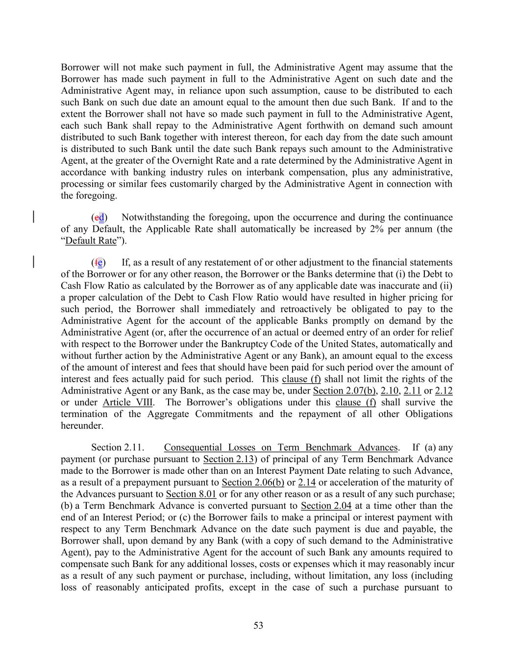 Borrower will not make such payment in full, the Administrative Agent may assume that the Borrower has made such payment in full to the Administrative Agent on such date and the Administrative Agent may, in reliance upon such assumption, cause to be distributed to each such Bank on such due date an amount equal to the amount then due such Bank. If and to the extent the Borrower shall not have so made such payment in full to the Administrative Agent, each such Bank shall repay to the Administrative Agent forthwith on demand such amount distributed to such Bank together with interest thereon, for each day from the date such amount is distributed to such Bank until the date such Bank repays such amount to the Administrative Agent, at the greater of the Overnight Rate and a rate determined by the Administrative Agent in accordance with banking industry rules on interbank compensation, plus any administrative, processing or similar fees customarily charged by the Administrative Agent in connection with the foregoing. (ed) Notwithstanding the foregoing, upon the occurrence and during the continuance of any Default, the Applicable Rate shall automatically be increased by 2% per annum (the “Default Rate”). (fe) If, as a result of any restatement of or other adjustment to the financial statements of the Borrower or for any other reason, the Borrower or the Banks determine that (i) the Debt to Cash Flow Ratio as calculated by the Borrower as of any applicable date was inaccurate and (ii) a proper calculation of the Debt to Cash Flow Ratio would have resulted in higher pricing for such period, the Borrower shall immediately and retroactively be obligated to pay to the Administrative Agent for the account of the applicable Banks promptly on demand by the Administrative Agent (or, after the occurrence of an actual or deemed entry of an order for relief with respect to the Borrower under the Bankruptcy Code of the United States, automatically and without further action by the Administrative Agent or any Bank), an amount equal to the excess of the amount of interest and fees that should have been paid for such period over the amount of interest and fees actually paid for such period. This clause (f) shall not limit the rights of the Administrative Agent or any Bank, as the case may be, under Section 2.07(b), 2.10, 2.11 or 2.12 or under Article VIII. The Borrower’s obligations under this clause (f) shall survive the termination of the Aggregate Commitments and the repayment of all other Obligations hereunder. Section 2.11. Consequential Losses on Term Benchmark Advances. If (a) any payment (or purchase pursuant to Section 2.13) of principal of any Term Benchmark Advance made to the Borrower is made other than on an Interest Payment Date relating to such Advance, as a result of a prepayment pursuant to Section 2.06(b) or 2.14 or acceleration of the maturity of the Advances pursuant to Section 8.01 or for any other reason or as a result of any such purchase; (b) a Term Benchmark Advance is converted pursuant to Section 2.04 at a time other than the end of an Interest Period; or (c) the Borrower fails to make a principal or interest payment with respect to any Term Benchmark Advance on the date such payment is due and payable, the Borrower shall, upon demand by any Bank (with a copy of such demand to the Administrative Agent), pay to the Administrative Agent for the account of such Bank any amounts required to compensate such Bank for any additional losses, costs or expenses which it may reasonably incur as a result of any such payment or purchase, including, without limitation, any loss (including loss of reasonably anticipated profits, except in the case of such a purchase pursuant to 53