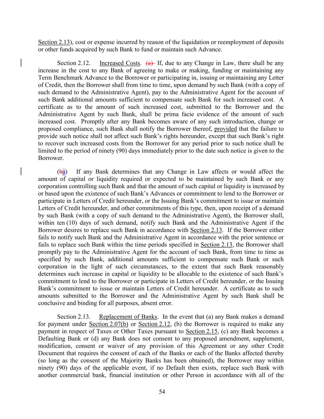 Section 2.13), cost or expense incurred by reason of the liquidation or reemployment of deposits or other funds acquired by such Bank to fund or maintain such Advance. Section 2.12. Increased Costs. (a) If, due to any Change in Law, there shall be any increase in the cost to any Bank of agreeing to make or making, funding or maintaining any Term Benchmark Advance to the Borrower or participating in, issuing or maintaining any Letter of Credit, then the Borrower shall from time to time, upon demand by such Bank (with a copy of such demand to the Administrative Agent), pay to the Administrative Agent for the account of such Bank additional amounts sufficient to compensate such Bank for such increased cost. A certificate as to the amount of such increased cost, submitted to the Borrower and the Administrative Agent by such Bank, shall be prima facie evidence of the amount of such increased cost. Promptly after any Bank becomes aware of any such introduction, change or proposed compliance, such Bank shall notify the Borrower thereof, provided that the failure to provide such notice shall not affect such Bank’s rights hereunder, except that such Bank’s right to recover such increased costs from the Borrower for any period prior to such notice shall be limited to the period of ninety (90) days immediately prior to the date such notice is given to the Borrower. (ba) If any Bank determines that any Change in Law affects or would affect the amount of capital or liquidity required or expected to be maintained by such Bank or any corporation controlling such Bank and that the amount of such capital or liquidity is increased by or based upon the existence of such Bank’s Advances or commitment to lend to the Borrower or participate in Letters of Credit hereunder, or the Issuing Bank’s commitment to issue or maintain Letters of Credit hereunder, and other commitments of this type, then, upon receipt of a demand by such Bank (with a copy of such demand to the Administrative Agent), the Borrower shall, within ten (10) days of such demand, notify such Bank and the Administrative Agent if the Borrower desires to replace such Bank in accordance with Section 2.13. If the Borrower either fails to notify such Bank and the Administrative Agent in accordance with the prior sentence or fails to replace such Bank within the time periods specified in Section 2.13, the Borrower shall promptly pay to the Administrative Agent for the account of such Bank, from time to time as specified by such Bank, additional amounts sufficient to compensate such Bank or such corporation in the light of such circumstances, to the extent that such Bank reasonably determines such increase in capital or liquidity to be allocable to the existence of such Bank’s commitment to lend to the Borrower or participate in Letters of Credit hereunder, or the Issuing Bank’s commitment to issue or maintain Letters of Credit hereunder. A certificate as to such amounts submitted to the Borrower and the Administrative Agent by such Bank shall be conclusive and binding for all purposes, absent error. Section 2.13. Replacement of Banks. In the event that (a) any Bank makes a demand for payment under Section 2.07(b) or Section 2.12, (b) the Borrower is required to make any payment in respect of Taxes or Other Taxes pursuant to Section 2.15, (c) any Bank becomes a Defaulting Bank or (d) any Bank does not consent to any proposed amendment, supplement, modification, consent or waiver of any provision of this Agreement or any other Credit Document that requires the consent of each of the Banks or each of the Banks affected thereby (so long as the consent of the Majority Banks has been obtained), the Borrower may within ninety (90) days of the applicable event, if no Default then exists, replace such Bank with another commercial bank, financial institution or other Person in accordance with all of the 54