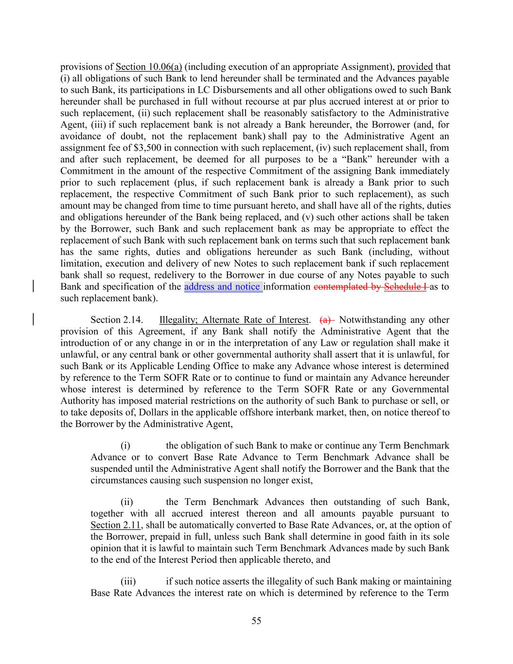 provisions of Section 10.06(a) (including execution of an appropriate Assignment), provided that (i) all obligations of such Bank to lend hereunder shall be terminated and the Advances payable to such Bank, its participations in LC Disbursements and all other obligations owed to such Bank hereunder shall be purchased in full without recourse at par plus accrued interest at or prior to such replacement, (ii) such replacement shall be reasonably satisfactory to the Administrative Agent, (iii) if such replacement bank is not already a Bank hereunder, the Borrower (and, for avoidance of doubt, not the replacement bank) shall pay to the Administrative Agent an assignment fee of $3,500 in connection with such replacement, (iv) such replacement shall, from and after such replacement, be deemed for all purposes to be a “Bank” hereunder with a Commitment in the amount of the respective Commitment of the assigning Bank immediately prior to such replacement (plus, if such replacement bank is already a Bank prior to such replacement, the respective Commitment of such Bank prior to such replacement), as such amount may be changed from time to time pursuant hereto, and shall have all of the rights, duties and obligations hereunder of the Bank being replaced, and (v) such other actions shall be taken by the Borrower, such Bank and such replacement bank as may be appropriate to effect the replacement of such Bank with such replacement bank on terms such that such replacement bank has the same rights, duties and obligations hereunder as such Bank (including, without limitation, execution and delivery of new Notes to such replacement bank if such replacement bank shall so request, redelivery to the Borrower in due course of any Notes payable to such Bank and specification of the address and notice information contemplated by Schedule I as to such replacement bank). Section 2.14. Illegality; Alternate Rate of Interest. (a) Notwithstanding any other provision of this Agreement, if any Bank shall notify the Administrative Agent that the introduction of or any change in or in the interpretation of any Law or regulation shall make it unlawful, or any central bank or other governmental authority shall assert that it is unlawful, for such Bank or its Applicable Lending Office to make any Advance whose interest is determined by reference to the Term SOFR Rate or to continue to fund or maintain any Advance hereunder whose interest is determined by reference to the Term SOFR Rate or any Governmental Authority has imposed material restrictions on the authority of such Bank to purchase or sell, or to take deposits of, Dollars in the applicable offshore interbank market, then, on notice thereof to the Borrower by the Administrative Agent, (i) the obligation of such Bank to make or continue any Term Benchmark Advance or to convert Base Rate Advance to Term Benchmark Advance shall be suspended until the Administrative Agent shall notify the Borrower and the Bank that the circumstances causing such suspension no longer exist, (ii) the Term Benchmark Advances then outstanding of such Bank, together with all accrued interest thereon and all amounts payable pursuant to Section 2.11, shall be automatically converted to Base Rate Advances, or, at the option of the Borrower, prepaid in full, unless such Bank shall determine in good faith in its sole opinion that it is lawful to maintain such Term Benchmark Advances made by such Bank to the end of the Interest Period then applicable thereto, and (iii) if such notice asserts the illegality of such Bank making or maintaining Base Rate Advances the interest rate on which is determined by reference to the Term 55