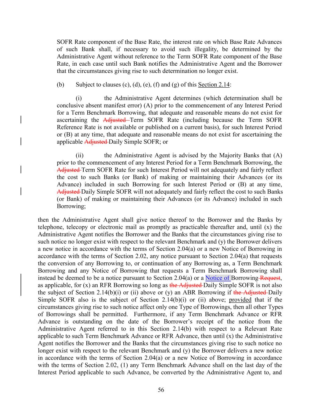 SOFR Rate component of the Base Rate, the interest rate on which Base Rate Advances of such Bank shall, if necessary to avoid such illegality, be determined by the Administrative Agent without reference to the Term SOFR Rate component of the Base Rate, in each case until such Bank notifies the Administrative Agent and the Borrower that the circumstances giving rise to such determination no longer exist. (b) Subject to clauses (c), (d), (e), (f) and (g) of this Section 2.14: (i) the Administrative Agent determines (which determination shall be conclusive absent manifest error) (A) prior to the commencement of any Interest Period for a Term Benchmark Borrowing, that adequate and reasonable means do not exist for ascertaining the Adjusted Term SOFR Rate (including because the Term SOFR Reference Rate is not available or published on a current basis), for such Interest Period or (B) at any time, that adequate and reasonable means do not exist for ascertaining the applicable Adjusted Daily Simple SOFR; or (ii) the Administrative Agent is advised by the Majority Banks that (A) prior to the commencement of any Interest Period for a Term Benchmark Borrowing, the Adjusted Term SOFR Rate for such Interest Period will not adequately and fairly reflect the cost to such Banks (or Bank) of making or maintaining their Advances (or its Advance) included in such Borrowing for such Interest Period or (B) at any time, Adjusted Daily Simple SOFR will not adequately and fairly reflect the cost to such Banks (or Bank) of making or maintaining their Advances (or its Advance) included in such Borrowing; then the Administrative Agent shall give notice thereof to the Borrower and the Banks by telephone, telecopy or electronic mail as promptly as practicable thereafter and, until (x) the Administrative Agent notifies the Borrower and the Banks that the circumstances giving rise to such notice no longer exist with respect to the relevant Benchmark and (y) the Borrower delivers a new notice in accordance with the terms of Section 2.04(a) or a new Notice of Borrowing in accordance with the terms of Section 2.02, any notice pursuant to Section 2.04(a) that requests the conversion of any Borrowing to, or continuation of any Borrowing as, a Term Benchmark Borrowing and any Notice of Borrowing that requests a Term Benchmark Borrowing shall instead be deemed to be a notice pursuant to Section 2.04(a) or a Notice of Borrowing Request, as applicable, for (x) an RFR Borrowing so long as the Adjusted Daily Simple SOFR is not also the subject of Section 2.14(b)(i) or (ii) above or (y) an ABR Borrowing if the Adjusted Daily Simple SOFR also is the subject of Section 2.14(b)(i) or (ii) above; provided that if the circumstances giving rise to such notice affect only one Type of Borrowings, then all other Types of Borrowings shall be permitted. Furthermore, if any Term Benchmark Advance or RFR Advance is outstanding on the date of the Borrower’s receipt of the notice from the Administrative Agent referred to in this Section 2.14(b) with respect to a Relevant Rate applicable to such Term Benchmark Advance or RFR Advance, then until (x) the Administrative Agent notifies the Borrower and the Banks that the circumstances giving rise to such notice no longer exist with respect to the relevant Benchmark and (y) the Borrower delivers a new notice in accordance with the terms of Section 2.04(a) or a new Notice of Borrowing in accordance with the terms of Section 2.02, (1) any Term Benchmark Advance shall on the last day of the Interest Period applicable to such Advance, be converted by the Administrative Agent to, and 56