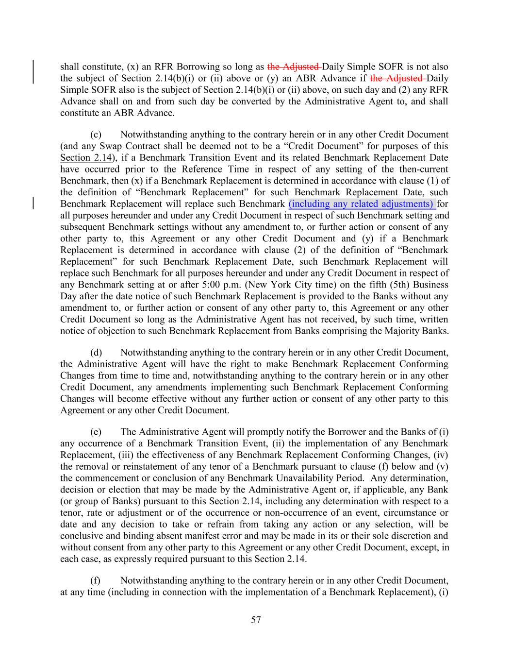 shall constitute, (x) an RFR Borrowing so long as the Adjusted Daily Simple SOFR is not also the subject of Section 2.14(b)(i) or (ii) above or (y) an ABR Advance if the Adjusted Daily Simple SOFR also is the subject of Section 2.14(b)(i) or (ii) above, on such day and (2) any RFR Advance shall on and from such day be converted by the Administrative Agent to, and shall constitute an ABR Advance. (c) Notwithstanding anything to the contrary herein or in any other Credit Document (and any Swap Contract shall be deemed not to be a “Credit Document” for purposes of this Section 2.14), if a Benchmark Transition Event and its related Benchmark Replacement Date have occurred prior to the Reference Time in respect of any setting of the then-current Benchmark, then (x) if a Benchmark Replacement is determined in accordance with clause (1) of the definition of “Benchmark Replacement” for such Benchmark Replacement Date, such Benchmark Replacement will replace such Benchmark (including any related adjustments) for all purposes hereunder and under any Credit Document in respect of such Benchmark setting and subsequent Benchmark settings without any amendment to, or further action or consent of any other party to, this Agreement or any other Credit Document and (y) if a Benchmark Replacement is determined in accordance with clause (2) of the definition of “Benchmark Replacement” for such Benchmark Replacement Date, such Benchmark Replacement will replace such Benchmark for all purposes hereunder and under any Credit Document in respect of any Benchmark setting at or after 5:00 p.m. (New York City time) on the fifth (5th) Business Day after the date notice of such Benchmark Replacement is provided to the Banks without any amendment to, or further action or consent of any other party to, this Agreement or any other Credit Document so long as the Administrative Agent has not received, by such time, written notice of objection to such Benchmark Replacement from Banks comprising the Majority Banks. (d) Notwithstanding anything to the contrary herein or in any other Credit Document, the Administrative Agent will have the right to make Benchmark Replacement Conforming Changes from time to time and, notwithstanding anything to the contrary herein or in any other Credit Document, any amendments implementing such Benchmark Replacement Conforming Changes will become effective without any further action or consent of any other party to this Agreement or any other Credit Document. (e) The Administrative Agent will promptly notify the Borrower and the Banks of (i) any occurrence of a Benchmark Transition Event, (ii) the implementation of any Benchmark Replacement, (iii) the effectiveness of any Benchmark Replacement Conforming Changes, (iv) the removal or reinstatement of any tenor of a Benchmark pursuant to clause (f) below and (v) the commencement or conclusion of any Benchmark Unavailability Period. Any determination, decision or election that may be made by the Administrative Agent or, if applicable, any Bank (or group of Banks) pursuant to this Section 2.14, including any determination with respect to a tenor, rate or adjustment or of the occurrence or non-occurrence of an event, circumstance or date and any decision to take or refrain from taking any action or any selection, will be conclusive and binding absent manifest error and may be made in its or their sole discretion and without consent from any other party to this Agreement or any other Credit Document, except, in each case, as expressly required pursuant to this Section 2.14. (f) Notwithstanding anything to the contrary herein or in any other Credit Document, at any time (including in connection with the implementation of a Benchmark Replacement), (i) 57