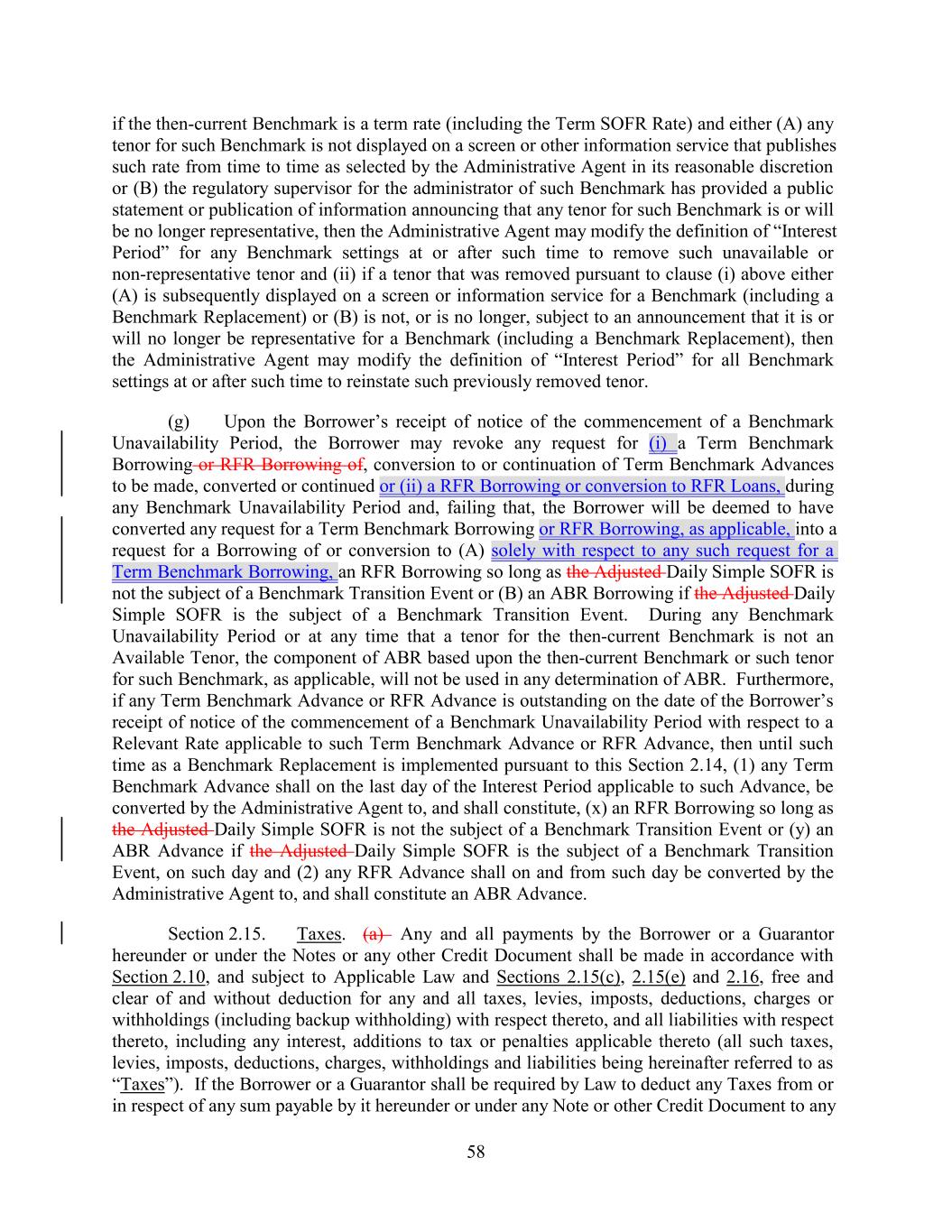 if the then-current Benchmark is a term rate (including the Term SOFR Rate) and either (A) any tenor for such Benchmark is not displayed on a screen or other information service that publishes such rate from time to time as selected by the Administrative Agent in its reasonable discretion or (B) the regulatory supervisor for the administrator of such Benchmark has provided a public statement or publication of information announcing that any tenor for such Benchmark is or will be no longer representative, then the Administrative Agent may modify the definition of “Interest Period” for any Benchmark settings at or after such time to remove such unavailable or non-representative tenor and (ii) if a tenor that was removed pursuant to clause (i) above either (A) is subsequently displayed on a screen or information service for a Benchmark (including a Benchmark Replacement) or (B) is not, or is no longer, subject to an announcement that it is or will no longer be representative for a Benchmark (including a Benchmark Replacement), then the Administrative Agent may modify the definition of “Interest Period” for all Benchmark settings at or after such time to reinstate such previously removed tenor. (g) Upon the Borrower’s receipt of notice of the commencement of a Benchmark Unavailability Period, the Borrower may revoke any request for (i) a Term Benchmark Borrowing or RFR Borrowing of, conversion to or continuation of Term Benchmark Advances to be made, converted or continued or (ii) a RFR Borrowing or conversion to RFR Loans, during any Benchmark Unavailability Period and, failing that, the Borrower will be deemed to have converted any request for a Term Benchmark Borrowing or RFR Borrowing, as applicable, into a request for a Borrowing of or conversion to (A) solely with respect to any such request for a Term Benchmark Borrowing, an RFR Borrowing so long as the Adjusted Daily Simple SOFR is not the subject of a Benchmark Transition Event or (B) an ABR Borrowing if the Adjusted Daily Simple SOFR is the subject of a Benchmark Transition Event. During any Benchmark Unavailability Period or at any time that a tenor for the then-current Benchmark is not an Available Tenor, the component of ABR based upon the then-current Benchmark or such tenor for such Benchmark, as applicable, will not be used in any determination of ABR. Furthermore, if any Term Benchmark Advance or RFR Advance is outstanding on the date of the Borrower’s receipt of notice of the commencement of a Benchmark Unavailability Period with respect to a Relevant Rate applicable to such Term Benchmark Advance or RFR Advance, then until such time as a Benchmark Replacement is implemented pursuant to this Section 2.14, (1) any Term Benchmark Advance shall on the last day of the Interest Period applicable to such Advance, be converted by the Administrative Agent to, and shall constitute, (x) an RFR Borrowing so long as the Adjusted Daily Simple SOFR is not the subject of a Benchmark Transition Event or (y) an ABR Advance if the Adjusted Daily Simple SOFR is the subject of a Benchmark Transition Event, on such day and (2) any RFR Advance shall on and from such day be converted by the Administrative Agent to, and shall constitute an ABR Advance. Section 2.15. Taxes. (a) Any and all payments by the Borrower or a Guarantor hereunder or under the Notes or any other Credit Document shall be made in accordance with Section 2.10, and subject to Applicable Law and Sections 2.15(c), 2.15(e) and 2.16, free and clear of and without deduction for any and all taxes, levies, imposts, deductions, charges or withholdings (including backup withholding) with respect thereto, and all liabilities with respect thereto, including any interest, additions to tax or penalties applicable thereto (all such taxes, levies, imposts, deductions, charges, withholdings and liabilities being hereinafter referred to as “Taxes”). If the Borrower or a Guarantor shall be required by Law to deduct any Taxes from or in respect of any sum payable by it hereunder or under any Note or other Credit Document to any 58