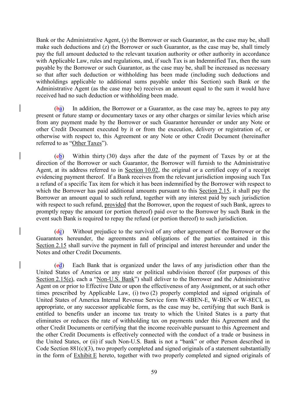 Bank or the Administrative Agent, (y) the Borrower or such Guarantor, as the case may be, shall make such deductions and (z) the Borrower or such Guarantor, as the case may be, shall timely pay the full amount deducted to the relevant taxation authority or other authority in accordance with Applicable Law, rules and regulations, and, if such Tax is an Indemnified Tax, then the sum payable by the Borrower or such Guarantor, as the case may be, shall be increased as necessary so that after such deduction or withholding has been made (including such deductions and withholdings applicable to additional sums payable under this Section) such Bank or the Administrative Agent (as the case may be) receives an amount equal to the sum it would have received had no such deduction or withholding been made. (ba) In addition, the Borrower or a Guarantor, as the case may be, agrees to pay any present or future stamp or documentary taxes or any other charges or similar levies which arise from any payment made by the Borrower or such Guarantor hereunder or under any Note or other Credit Document executed by it or from the execution, delivery or registration of, or otherwise with respect to, this Agreement or any Note or other Credit Document (hereinafter referred to as “Other Taxes”). (cb) Within thirty (30) days after the date of the payment of Taxes by or at the direction of the Borrower or such Guarantor, the Borrower will furnish to the Administrative Agent, at its address referred to in Section 10.02, the original or a certified copy of a receipt evidencing payment thereof. If a Bank receives from the relevant jurisdiction imposing such Tax a refund of a specific Tax item for which it has been indemnified by the Borrower with respect to which the Borrower has paid additional amounts pursuant to this Section 2.15, it shall pay the Borrower an amount equal to such refund, together with any interest paid by such jurisdiction with respect to such refund, provided that the Borrower, upon the request of such Bank, agrees to promptly repay the amount (or portion thereof) paid over to the Borrower by such Bank in the event such Bank is required to repay the refund (or portion thereof) to such jurisdiction. (dc) Without prejudice to the survival of any other agreement of the Borrower or the Guarantors hereunder, the agreements and obligations of the parties contained in this Section 2.15 shall survive the payment in full of principal and interest hereunder and under the Notes and other Credit Documents. (ed) Each Bank that is organized under the laws of any jurisdiction other than the United States of America or any state or political subdivision thereof (for purposes of this Section 2.15(e), each a “Non-U.S. Bank”) shall deliver to the Borrower and the Administrative Agent on or prior to Effective Date or upon the effectiveness of any Assignment, or at such other times prescribed by Applicable Law, (i) two (2) properly completed and signed originals of United States of America Internal Revenue Service form W-8BEN-E, W-BEN or W-8ECI, as appropriate, or any successor applicable form, as the case may be, certifying that such Bank is entitled to benefits under an income tax treaty to which the United States is a party that eliminates or reduces the rate of withholding tax on payments under this Agreement and the other Credit Documents or certifying that the income receivable pursuant to this Agreement and the other Credit Documents is effectively connected with the conduct of a trade or business in the United States, or (ii) if such Non-U.S. Bank is not a “bank” or other Person described in Code Section 881(c)(3), two properly completed and signed originals of a statement substantially in the form of Exhibit E hereto, together with two properly completed and signed originals of 59