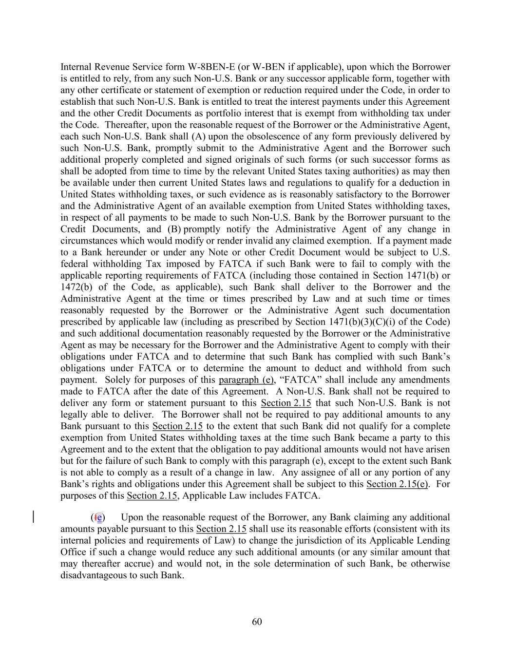 Internal Revenue Service form W-8BEN-E (or W-BEN if applicable), upon which the Borrower is entitled to rely, from any such Non-U.S. Bank or any successor applicable form, together with any other certificate or statement of exemption or reduction required under the Code, in order to establish that such Non-U.S. Bank is entitled to treat the interest payments under this Agreement and the other Credit Documents as portfolio interest that is exempt from withholding tax under the Code. Thereafter, upon the reasonable request of the Borrower or the Administrative Agent, each such Non-U.S. Bank shall (A) upon the obsolescence of any form previously delivered by such Non-U.S. Bank, promptly submit to the Administrative Agent and the Borrower such additional properly completed and signed originals of such forms (or such successor forms as shall be adopted from time to time by the relevant United States taxing authorities) as may then be available under then current United States laws and regulations to qualify for a deduction in United States withholding taxes, or such evidence as is reasonably satisfactory to the Borrower and the Administrative Agent of an available exemption from United States withholding taxes, in respect of all payments to be made to such Non-U.S. Bank by the Borrower pursuant to the Credit Documents, and (B) promptly notify the Administrative Agent of any change in circumstances which would modify or render invalid any claimed exemption. If a payment made to a Bank hereunder or under any Note or other Credit Document would be subject to U.S. federal withholding Tax imposed by FATCA if such Bank were to fail to comply with the applicable reporting requirements of FATCA (including those contained in Section 1471(b) or 1472(b) of the Code, as applicable), such Bank shall deliver to the Borrower and the Administrative Agent at the time or times prescribed by Law and at such time or times reasonably requested by the Borrower or the Administrative Agent such documentation prescribed by applicable law (including as prescribed by Section 1471(b)(3)(C)(i) of the Code) and such additional documentation reasonably requested by the Borrower or the Administrative Agent as may be necessary for the Borrower and the Administrative Agent to comply with their obligations under FATCA and to determine that such Bank has complied with such Bank’s obligations under FATCA or to determine the amount to deduct and withhold from such payment. Solely for purposes of this paragraph (e), “FATCA” shall include any amendments made to FATCA after the date of this Agreement. A Non-U.S. Bank shall not be required to deliver any form or statement pursuant to this Section 2.15 that such Non-U.S. Bank is not legally able to deliver. The Borrower shall not be required to pay additional amounts to any Bank pursuant to this Section 2.15 to the extent that such Bank did not qualify for a complete exemption from United States withholding taxes at the time such Bank became a party to this Agreement and to the extent that the obligation to pay additional amounts would not have arisen but for the failure of such Bank to comply with this paragraph (e), except to the extent such Bank is not able to comply as a result of a change in law. Any assignee of all or any portion of any Bank’s rights and obligations under this Agreement shall be subject to this Section 2.15(e). For purposes of this Section 2.15, Applicable Law includes FATCA. (fe) Upon the reasonable request of the Borrower, any Bank claiming any additional amounts payable pursuant to this Section 2.15 shall use its reasonable efforts (consistent with its internal policies and requirements of Law) to change the jurisdiction of its Applicable Lending Office if such a change would reduce any such additional amounts (or any similar amount that may thereafter accrue) and would not, in the sole determination of such Bank, be otherwise disadvantageous to such Bank. 60