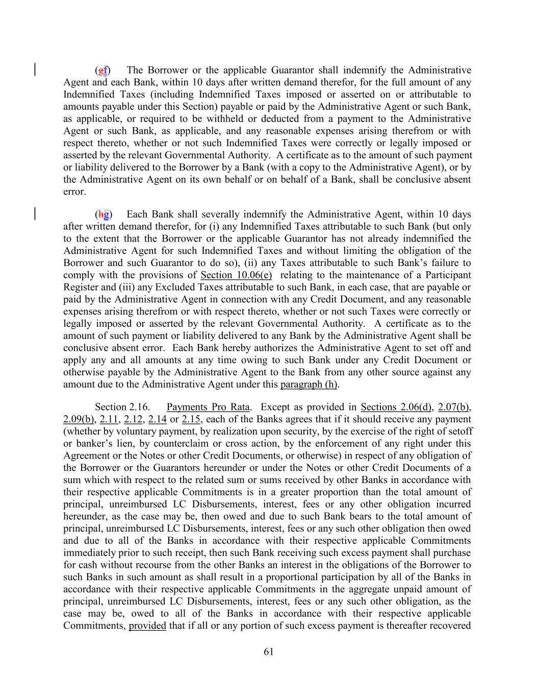 (gf) The Borrower or the applicable Guarantor shall indemnify the Administrative Agent and each Bank, within 10 days after written demand therefor, for the full amount of any Indemnified Taxes (including Indemnified Taxes imposed or asserted on or attributable to amounts payable under this Section) payable or paid by the Administrative Agent or such Bank, as applicable, or required to be withheld or deducted from a payment to the Administrative Agent or such Bank, as applicable, and any reasonable expenses arising therefrom or with respect thereto, whether or not such Indemnified Taxes were correctly or legally imposed or asserted by the relevant Governmental Authority. A certificate as to the amount of such payment or liability delivered to the Borrower by a Bank (with a copy to the Administrative Agent), or by the Administrative Agent on its own behalf or on behalf of a Bank, shall be conclusive absent error. (hg) Each Bank shall severally indemnify the Administrative Agent, within 10 days after written demand therefor, for (i) any Indemnified Taxes attributable to such Bank (but only to the extent that the Borrower or the applicable Guarantor has not already indemnified the Administrative Agent for such Indemnified Taxes and without limiting the obligation of the Borrower and such Guarantor to do so), (ii) any Taxes attributable to such Bank’s failure to comply with the provisions of Section 10.06(e) relating to the maintenance of a Participant Register and (iii) any Excluded Taxes attributable to such Bank, in each case, that are payable or paid by the Administrative Agent in connection with any Credit Document, and any reasonable expenses arising therefrom or with respect thereto, whether or not such Taxes were correctly or legally imposed or asserted by the relevant Governmental Authority. A certificate as to the amount of such payment or liability delivered to any Bank by the Administrative Agent shall be conclusive absent error. Each Bank hereby authorizes the Administrative Agent to set off and apply any and all amounts at any time owing to such Bank under any Credit Document or otherwise payable by the Administrative Agent to the Bank from any other source against any amount due to the Administrative Agent under this paragraph (h). Section 2.16. Payments Pro Rata. Except as provided in Sections 2.06(d), 2.07(b), 2.09(b), 2.11, 2.12, 2.14 or 2.15, each of the Banks agrees that if it should receive any payment (whether by voluntary payment, by realization upon security, by the exercise of the right of setoff or banker’s lien, by counterclaim or cross action, by the enforcement of any right under this Agreement or the Notes or other Credit Documents, or otherwise) in respect of any obligation of the Borrower or the Guarantors hereunder or under the Notes or other Credit Documents of a sum which with respect to the related sum or sums received by other Banks in accordance with their respective applicable Commitments is in a greater proportion than the total amount of principal, unreimbursed LC Disbursements, interest, fees or any other obligation incurred hereunder, as the case may be, then owed and due to such Bank bears to the total amount of principal, unreimbursed LC Disbursements, interest, fees or any such other obligation then owed and due to all of the Banks in accordance with their respective applicable Commitments immediately prior to such receipt, then such Bank receiving such excess payment shall purchase for cash without recourse from the other Banks an interest in the obligations of the Borrower to such Banks in such amount as shall result in a proportional participation by all of the Banks in accordance with their respective applicable Commitments in the aggregate unpaid amount of principal, unreimbursed LC Disbursements, interest, fees or any such other obligation, as the case may be, owed to all of the Banks in accordance with their respective applicable Commitments, provided that if all or any portion of such excess payment is thereafter recovered 61