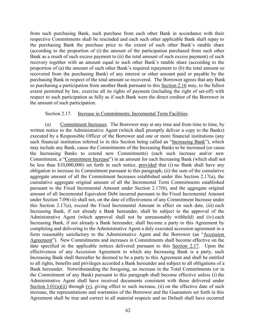from such purchasing Bank, such purchase from each other Bank in accordance with their respective Commitments shall be rescinded and each such other applicable Bank shall repay to the purchasing Bank the purchase price to the extent of such other Bank’s ratable share (according to the proportion of (i) the amount of the participation purchased from such other Bank as a result of such excess payment to (ii) the total amount of such excess payment) of such recovery together with an amount equal to such other Bank’s ratable share (according to the proportion of (a) the amount of such other Bank’s required repayment to (b) the total amount so recovered from the purchasing Bank) of any interest or other amount paid or payable by the purchasing Bank in respect of the total amount so recovered. The Borrower agrees that any Bank so purchasing a participation from another Bank pursuant to this Section 2.16 may, to the fullest extent permitted by law, exercise all its rights of payment (including the right of set-off) with respect to such participation as fully as if such Bank were the direct creditor of the Borrower in the amount of such participation. Section 2.17. Increase in Commitments; Incremental Term Facilities. (a) Commitment Increases. The Borrower may at any time and from time to time, by written notice to the Administrative Agent (which shall promptly deliver a copy to the Banks) executed by a Responsible Officer of the Borrower and one or more financial institutions (any such financial institution referred to in this Section being called an “Increasing Bank”), which may include any Bank, cause the Commitments of the Increasing Banks to be increased (or cause the Increasing Banks to extend new Commitments) (each such increase and/or new Commitment, a “Commitment Increase”) in an amount for each Increasing Bank (which shall not be less than $10,000,000) set forth in such notice, provided that (i) no Bank shall have any obligation to increase its Commitment pursuant to this paragraph, (ii) the sum of the cumulative aggregate amount of all the Commitment Increases established under this Section 2.17(a), the cumulative aggregate original amount of all the Incremental Term Commitments established pursuant to the Fixed Incremental Amount under Section 2.17(b), and the aggregate original amount of all Incremental Equivalent Debt incurred pursuant to the Fixed Incremental Amount under Section 7.09(vii) shall not, on the date of effectiveness of any Commitment Increase under this Section 2.17(a), exceed the Fixed Incremental Amount in effect on such date, (iii) each Increasing Bank, if not already a Bank hereunder, shall be subject to the approval of the Administrative Agent (which approval shall not be unreasonably withheld) and (iv) each Increasing Bank, if not already a Bank hereunder, shall become a party to this Agreement by completing and delivering to the Administrative Agent a duly executed accession agreement in a form reasonably satisfactory to the Administrative Agent and the Borrower (an “Accession Agreement”). New Commitments and increases in Commitments shall become effective on the date specified in the applicable notices delivered pursuant to this Section 2.17. Upon the effectiveness of any Accession Agreement to which any Increasing Bank is a party, such Increasing Bank shall thereafter be deemed to be a party to this Agreement and shall be entitled to all rights, benefits and privileges accorded a Bank hereunder and subject to all obligations of a Bank hereunder. Notwithstanding the foregoing, no increase in the Total Commitments (or in the Commitment of any Bank) pursuant to this paragraph shall become effective unless (i) the Administrative Agent shall have received documents consistent with those delivered under Section 3.01(a)(ii) through (v), giving effect to such increase, (ii) on the effective date of such increase, the representations and warranties of the Borrower and the Guarantors set forth in this Agreement shall be true and correct in all material respects and no Default shall have occurred 62